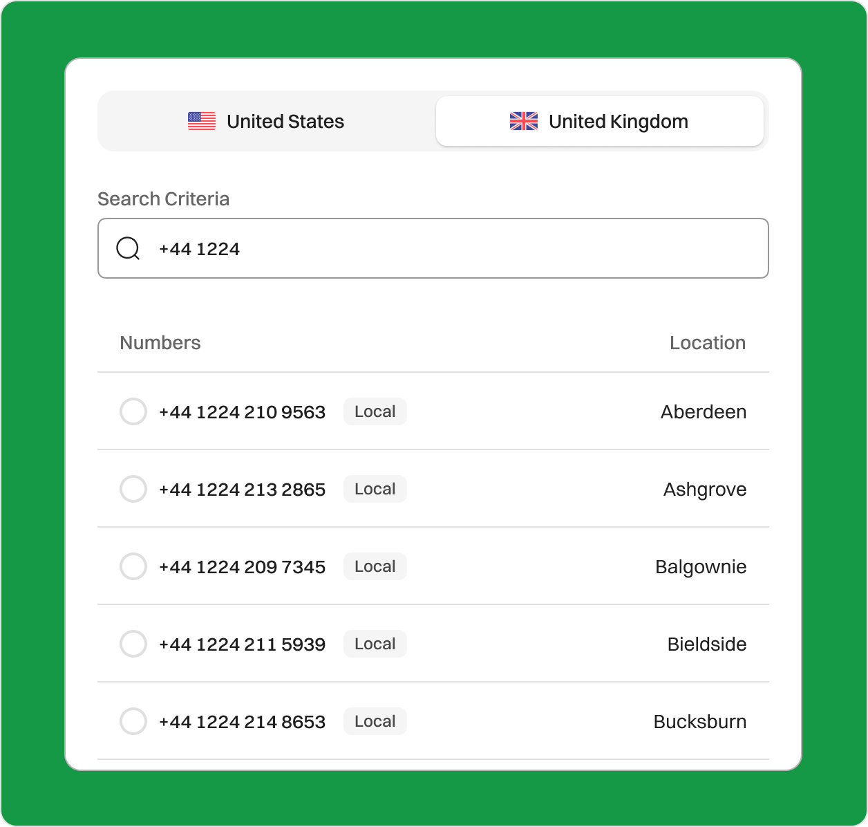 Get a 01224 Area Code Local Virtual Number for Aberdeen, Scotland Get a 01224 area code virtual number for your business in Aberdeen, Scotland. Strengthen your local presence, build customer trust, and ensure seamless communication with a dependable virtual phone number. Sign upRequest a Demo Endorsed by top industry leaders Trusted by industry experts for excellence and innovation. What is the 01224 Area Code? The 01224 area code is a geographic dialing code in the United Kingdom that covers Aberdeen and surrounding areas in northeast Scotland. Assigned by the UK’s telecommunications authority, this code plays a vital role in connecting businesses and residents in the region. Aberdeen uses the British Standard Time Zone (BST), which is UTC+0 during standard time and UTC+1 during daylight saving time. The 01224 area code enables callers to easily reach businesses and individuals in the energy capital of Europe. Country United Kingdom Region Scotland City Aberdeen Time Zone British Time Zone Telephone Number Format +44 1224 XXX XXX Example of 01224 Number +44 1224 555 789 Where is the 01224 Area Code? The 01224 area code serves the city of Aberdeen and its surrounding areas, including Dyce, Bridge of Don, and Cults, all located in northeast Scotland. It is a geographic dialing code that identifies landline numbers based in this part of the UK. Unlike some urban regions, Aberdeen does not currently use area code overlays. Therefore, numbers beginning with 01224 are unique to the region. Local and national calls require 10-digit or full international dialing, depending on the caller’s location. A Brief History of the 01224 Area Code The 01224 area code was introduced with the PhONEday changes in the UK in 1995, when a “1” was added after the initial zero in geographic area codes. This update modernized the national phone system and created a clear, structured format for all UK numbers. Prior to PhONEday, Aberdeen used the shorter 0224 code. With the expansion of telecommunications, the change to 01224 ensured greater numbering capacity while preserving local identity. Since then, 01224 has become synonymous with Aberdeen’s business and residential networks. How to get a 01224 Area Code Phone Number? You can purchase a 01224 area code phone number from a VoIP service provider like Dialaxy. Follow these simple steps: Sign up on the official Dialaxy website or mobile app. Log in to your account. Search “My Number” from the “Portal” menu. Click on “Buy Number.” Choose the United Kingdom as your country and search for the 01224 area code. Complete the payment and submit any required documents. How Does a 01224 Area Code Business Phone Number Work? A 01224 area code business number uses VoIP (Voice over Internet Protocol) to connect with customers in Aberdeen and nearby regions. It works over the internet, rather than traditional landlines, offering flexibility and advanced communication features. Here’s how it enhances your business communication: Local Presence: A 01224 number helps your business appear established and trustworthy within Aberdeen and its business districts, especially in sectors such as energy and finance. Internet-Based Communication: Calls are made using the internet through smartphones, desktops, or VoIP handsets, reducing dependency on physical lines. Call Routing: Smart routing ensures that incoming calls are directed to the appropriate department, thereby improving the quality of customer service. Seamless Accessibility: Even if your team operates outside the UK, a 01224 number keeps you connected to clients in Aberdeen as though you’re just around the corner. Value-Added Features: With Dialaxy, your 01224 number includes voicemail, call forwarding, SMS support, call menus, and more to streamline business operations. Dialing a 01224 Number Country Code (+44): Directs the call to the United Kingdom Area Code (01224): Routes the call to Aberdeen, Scotland Local Exchange (e.g., 555): Points to a specific area within the city Subscriber Number (e.g., 789): The unique number for a person or business/li> Using a 01224 area code business number helps you build a reliable communication channel in Aberdeen, Scotland, that feels local, even from afar. Who’s Doing Business in the 01224 Area Code? The 01224 area code powers communication for a diverse range of industries in Aberdeen, one of the UK’s most economically vibrant cities. Oil, Gas & Energy Aberdeen is globally recognized as the oil capital of Europe, and the 01224 area code plays a key role in powering this sector. Major companies, such as Shell UK, BP, and Wood Group, utilize 01224 numbers to coordinate offshore drilling operations, manage engineering projects, and liaise with partners in the North Sea and beyond. Financial & Legal Services 01224 phone lines are essential for Aberdeen’s financial and legal hubs. Institutions like Abrdn (formerly Aberdeen Standard Investments) rely on 01224 numbers to manage investment portfolios and client services. Local legal firms and corporate consultancies also use these lines for secure communication and legal advice across the UK. Maritime & Logistics+ Aberdeen Harbour Board and shipping companies such as ASCO Group use 01224 numbers to control port operations, cargo logistics, and marine transport schedules. With Aberdeen’s strategic coastal location, these lines are crucial for real-time coordination across vessels, terminals, and international routes. Education & Research The University of Aberdeen, one of Scotland’s oldest universities, utilizes 01224 numbers for faculty communication, student services, and academic inquiries. Research institutes, such as The Rowett Institute, also rely on 01224 lines for laboratory coordination and collaborative projects in health and nutrition science. Tourism & Hospitality From boutique hotels to historic sites, Aberdeen’s tourism economy thrives with the support of 01224 numbers. Prestigious properties 