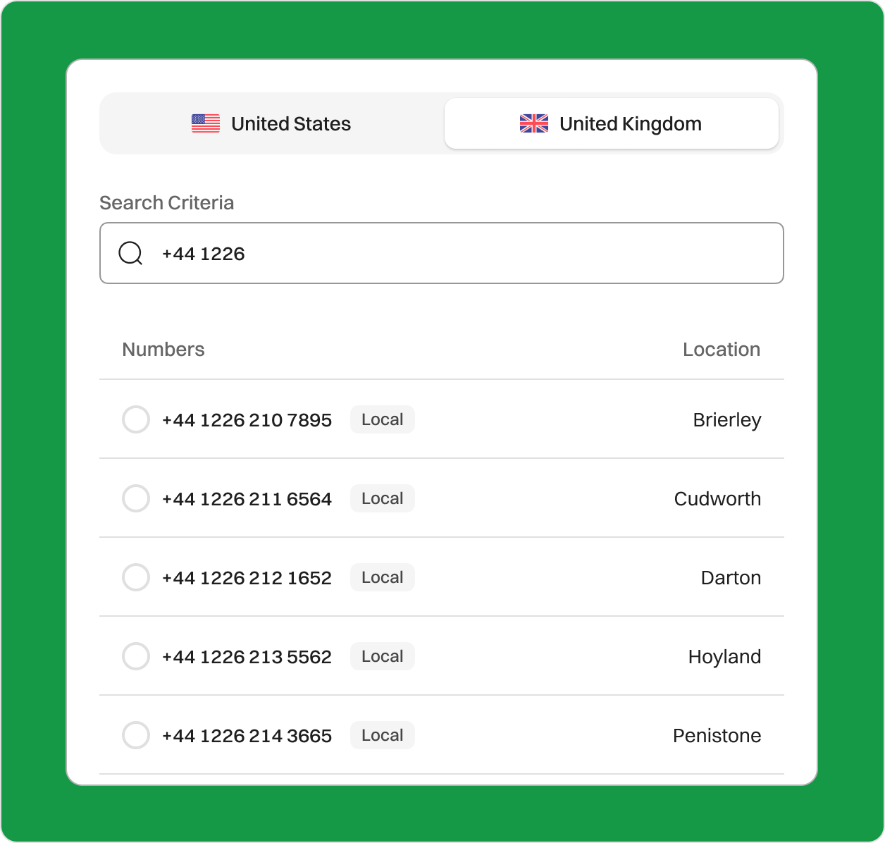 Get a 01226 Area Code Local Virtual Number for Barnsley, UK Looking to connect with customers in Barnsley and the surrounding area? A 01226 area code virtual number can help your business feel local, no matter where you’re based. It’s a simple way to build trust, improve customer communication, and show people you’re part of the South Yorkshire community. Sign upRequest a Demo Endorsed by top industry leaders Trusted by industry experts for excellence and innovation. What is the 01226 Area Code? The 01226 area code is a local dialing area code for Barnsley in South Yorkshire. It is a part of the United Kingdom’s national numbering plan. This code supports a diverse region known for its manufacturing, healthcare, and agricultural industries. The 01226 area code functions as an overlay for the existing 519 area code, meaning it shares the same geographic region. The area is in Greenwich Mean Time (GMT) and shifts to British Summer Time (BST) during daylight saving. Country United Kingdom Region South Yorkshire City Barnsley Time Zone GMT / BST Telephone Number Format +44 1226 XXX XXX Example of 1226 Number +44 01226 555 6789 Where is the 01226 Area Code? The 01226 area code is located in the United Kingdom and primarily covers the city of Barnsley in South Yorkshire. It covers surrounding towns such as Brierley, Cudworth, Holyland, Darton, and Penistone. It’s a geographic code, meaning it directly corresponds to a specific location, helping residents and businesses distinguish truly local phone numbers. A 01226 area code number is trusted throughout the community. When calling from outside the UK, the number format includes the country code: +44, followed by 01226, and then the local subscriber number. It’s a trusted code that identifies you as part of the Barnsley community. A Brief History of the 01226 Area Code The 001226 area code has been the telephone identity of Barnsley since PhONEday, a major nationwide update to the UK’s telephone system that took place on 16 April 1995. Before that, Barnsley used the 0226 area code. The change was part of a broader initiative to modernize the country’s telecom infrastructure and create space for millions of new numbers across the UK. PhONEday introduced the number ‘1’ after the leading zero in area codes, transforming 0226 into 01226. This shift was driven by the growing need for landlines, mobile phones, and, eventually, internet-based services. Over the years, it has become part of the town’s identity, used by local businesses, schools, health services, and households alike. How to Get a 01226 Area Code Phone Number? You can purchase a 01226 area code phone number from a VoIP service provider like Dialaxy. Follow these simple steps: Sign up on the official Dialaxy website or mobile app. Log in to your Dialaxy account. Search “My Number” from the “Portal” menu. Click on “Buy Number.” Choose the United Kingdom as your country and search for the 01226 area code. Complete the payment and submit any required documentation. How Does a 01226 Area Code Business Phone Number Work? A 01226 area code business phone number connects your company with clients in South Yorkshire using VoIP (Voice over Internet Protocol) technology. This allows you to operate your business line from any internet-connected device, whether you’re in South Yorkshire or working remotely. With a 01226 number, you’re not tied to a single location. You can take calls from your smartphone, laptop, or desktop. It is a flexible solution that keeps you connected no matter where you are. A 01226 number shows your customer that you’re local. It builds trust, makes your business feel more familiar, and encourages people to reach out. It is a simple, cost-effective way to establish a strong presence in Barnsley and stand out as a professional, reliable business in the local market. Dialing a 01226 Number Country Code (+44): Identifies the United Kingdom Area Code (01226): Routes the call to Barnsley Subscriber Number (e.g., 555 678): Identifies the specific phone line Who’s Doing Business in the 01226 Area Code? The 01226 area code powers communication for a broad range of industries in South Yorkshire. Here are some of the standout industries and companies driving local growth. Manufacturing & Engineering Barnsley has long been rooted in industry. Companies like Naylor, which manufactures clay pipes and construction products, rely on 01226 numbers to coordinate with suppliers, builders, and clients across the UK. Local numbers help them maintain that trusted “made in Yorkshire” reputation. Healthcare Services Hospitals and clinics across Barnsley, including Barnsley Hospital NHS Foundation Trust, use 01226 lines to stay accessible to patients, consultants, and emergency services. From appointment bookings to aftercare calls, a local number ensures seamless communication when it matters most. Education & Training Schools, academies, and colleges such as Barnsley College use 01226 numbers to handle everything from student enquiries to admissions and parent communications. For educational providers, being reachable on a familiar area code builds confidence among local families and students. Retail & Local Shops Independent shops and boutiques in The Glass Works, Barnsley’s new shopping and leisure hub, use 01226 numbers to manage customer service, handle orders, and take reservations. A recognizable local number makes it easier for shoppers to reach out and engage with their favourite businesses. Construction & Trade Services With regional builders like Henry Boot Construction active in South Yorkshire, local contact numbers are key for coordinating crews, handling quotes, and maintaining trust with clients. Having a 01226 number says, “We’re right here if you need us.” Arts, Culture & Events The Civic Barnsley is a theatre and gallery space hosting performances, exhibitions, and community events. A 01226 number connects audiences with sta