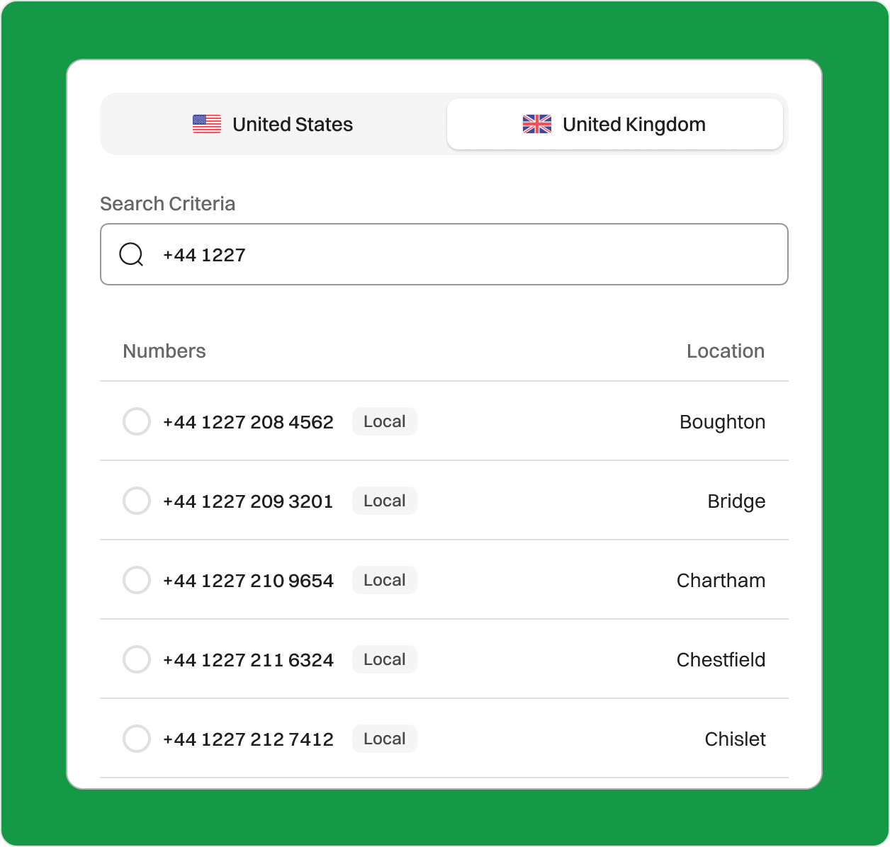 Get a 01227 Area Code Virtual Number for Canterbury, UK Looking to connect with customers in Canterbury, Kent? A virtual phone number with the 01227 area code helps your business feel local, build trust, and stay easily reachable, no matter where you’re based. Sign upRequest a Demo Endorsed by top industry leaders Trusted by industry experts for excellence and innovation. What is the 01227 Area Code? The 01227 area code is a geographic dialing code in the UK that covers the city of Canterbury in Kent. It’s part of the UK’s national phone system, helping people and businesses across this vibrant corner of southeast England stay connected. Unlike in some countries where multiple area codes can overlap in the same region, 01227 is unique to Canterbury and nearby towns, making it instantly recognizable to local residents. The city operates on Greenwich Mean Time (GMT) and switches to British Summer Time (BST) during daylight saving months, keeping it in sync with the rest of the UK. Whether you’re based locally or dialing in from afar, a 01227 number offers both familiarity and regional identity. Country United Kingdom Region Kent City Canterbury Time Zone GMT / BST Telephone Number Format +44 1227 XXX XXX Example of 01227 Number +44 1227 123 456 Where is the 01227 Area Code? The 01227 area code is based in the United Kingdom and covers the historic city of Canterbury, along with nearby towns in Kent. Canterbury is a key destination for culture, education, and tourism in the southeast of England. This area code also includes surrounding communities like Whitstable and Herne Bay, connecting much of northeast Kent. As a geographic code, 01227 is tied specifically to this region, helping to identify local landline numbers. Unlike some international dialing systems that layer multiple codes over the same area, the UK keeps things simpler. 01227 is the sole area code for this part of Kent. When calling from outside the UK, just dial the country code (+44), then 01227, followed by the local number. A Brief History of the 01227 Area Code The 01227 area code came into use on April 16, 1995, as a part of a nationwide update known as “PhONEday”. This initiative added a ‘1’ after the initial ‘0’ in all UK area codes to make room for the growing number of phones and digital services popping up across the country. Before that change, Canterbury phone numbers began with 0227. Switching to 01227 wasn’t just a simple number change; it was part of a bigger push to modernize the UK’s phone system. This ensures there are enough numbers to meet future demand from homes, businesses, and new technologies. For Canterbury, the update meant a more robust and future-proof telecom network. Today, 01227 is still the trusted code for Canterbury, reflecting the region’s rich heritage and its role as a center of education and culture. How to Get a 01227 Area Code Number? You can purchase a 01227 area code phone number from a VoIP service provider like Dialaxy. Follow these simple steps: Sign up on the official Dialaxy website or mobile app. Log in to your dialaxy account. Search “My Number” from the “Portal” menu. Click on “Buy Number.” Choose the United Kingdom as your country and search for the 01227 area code. Complete the payment and submit any required documentation. How Does a 01227 Area Code Business Phone Number Work? A 01227 area code phone number makes it easy for your business to connect with customers in Canterbury and the surrounding Kent area. One of the best parts? You can use your number on just about any device, whether it’s a smartphone, laptop, or desktop. So whether you’re based in Canterbury or working remotely, you can stay in touch with customers and colleagues while maintaining a strong local presence. These numbers come with smart features like call forwarding, voicemail-to-email, auto-attendants, SMS, and even call recording. They’re designed to streamline your communications, improve customer service, and make your day-to-day operations more efficient. Most importantly, having a 01227 number shows local customers you are part of their community. It builds trust and familiarity, which can go a long way in helping you stand out from the competition. Dialing a 01227 Number Country Code (+44): Indicates the United Kingdom Area Code (01227): Routes the call to Canterbury Subscriber Number (e.g., 123 456): Unique to each phone line or business A 01227 number gives your business a local feel with professional-level communication. Who’s Doing Business in the 01227 Area Code? The 01227 area code is at the heart of Canterbury’s business landscape. Here’s how various sectors and trusted names in the community are using it to connect and grow: Here’s a look at key sectors shaping the local economy: Education The University of Kent supports over 20,000 students with services ranging from admissions to alumni relations. Departments and student services rely on 01227 lines for day-to-day communications and support. Retail & Small Business Siesta Crafts, a family-run ethical gift shop in Canterbury, has built a loyal local customer base. They use their 01227 number to take phone orders and keep close contact with their community. Healthcare Services Kent and Canterbury Hospital offers vital medical care across East Kent and uses local lines for patient coordination. Their 01227 numbers ensure patients can reach specialists, clinics, and departments without confusion. Real Estate & Property Management Miles & Barr is a well-known estate agent with branches throughout Kent, including a busy office in Canterbury. Their team uses 01227 lines to schedule viewings, consult clients, and manage lettings smoothly. Tourism & Hospitality The Falstaff Hotel in Canterbury blends 15th-century charm with modern service, welcoming thousands of tourists each year. They use their 01227 number to handle direct bookings and guest inquiries quickly. Legal & Professional Services F