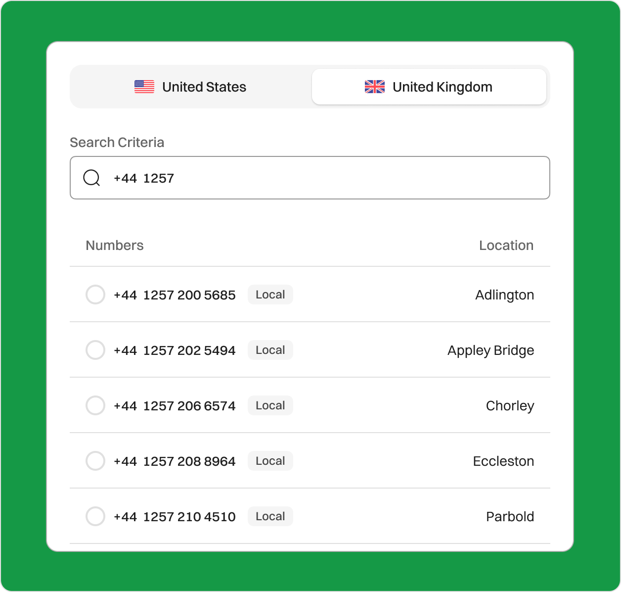 Own a 01257 Area Code Virtual Number for Chorley, UK Secure a 01257 area code virtual number for your business in Chorley, Lancashire. Enhance your local presence, build customer trust, and ensure seamless communication with a dependable virtual phone number. Sign upRequest a Demo Endorsed by top industry leaders Trusted by industry experts for excellence and innovation. What is the 01257 Area Code? The 01257 area code is a UK geographic dialing code that covers the town of Chorley and the surrounding areas, including Coppull, in Lancashire. The nearby area codes include 01204 for Bolton, 01254 for Blackburn, and 01772 for Preston, covering towns close to Chorley and Coppull. As part of the United Kingdom’s national numbering plan, it connects homes and businesses across this region, known for its rich industrial heritage and proximity to the West Pennine Moors. Unlike some UK area codes, 01257 currently operates without an overlay. Chorley is located in the Greenwich Mean Time (GMT) zone and follows British Summer Time (BST) during daylight saving periods. Country United Kingdom Region Lancashire City Chorley Time Zone GMT (UTC+0) / BST (UTC+1 during DST) Telephone Format +44 1257 XXX XXX Example Number +44 1257 555 678 Note: When dialing within the UK, use the leading zero with the area code: 01257 XXXXXX When dialing from outside the UK, drop the zero and add the country code +44: +44 1257 XXXXXX A Brief History of the 01257 Area Code The 01257 area code was introduced on April 16, 1995, as part of the UK’s “PhONEday” initiative. This change involved adding a ‘1’ after the initial zero to expand the available number range. Prior to PhONEday, the area was served by the 0257 code. Historically, the area was associated with the mnemonic code CL7, where ‘CL’ represented Chorley. On rotary dial telephones, the letters ‘C’ and ‘L’ corresponded to the numbers 2 and 5, respectively, reflecting the original 0257 numbering system. How to Get a 01257 Area Code Phone Number? You can purchase a 01257 area code phone number from a VoIP service provider like Dialaxy. Follow these simple steps: Sign up on the official Dialaxy website or mobile app. Log in to your dialaxy account. Search “My Number” from the “Portal” menu. Click on “Buy Number.” Choose the United Kingdom and search for the 01257 area code. Complete payment and upload any required documents. How Does a 01257 Area Code Business Phone Number Work? A 01257 area code business phone number provides your company with a dedicated local line connecting you to customers in Chorley and the surrounding Lancashire region. It operates via VoIP (Voice over Internet Protocol), allowing you to make and receive calls over the internet rather than traditional landlines. Additionally, these numbers often come with advanced features like call forwarding, auto-attendants, voicemail-to-email, SMS, and call recording, enhancing customer communication and service. For customers, seeing a 01257 number builds trust and local recognition, encouraging them to engage with your business. It’s a strategic, cost-effective solution to boost your Chorley market presence. Dialing a 01257 Number Country Code (+44): Represents the United Kingdom Area Code (01257): Directs the call to Chorley Subscriber Number (e.g., 555 6789): Identifies the specific phone line or business A 01257 number strengthens your local visibility while offering modern communication flexibility. Who’s Doing Business in the 01257 Area Code? The 01257 area code spans a commercially diverse region of Lancashire, encompassing Chorley, Coppull, Adlington, Eccleston, and surrounding towns. This area is more than just a scenic spot in the Northwest. It serves as a hub for trade, industry, and remote communication. With virtual calls on the rise, businesses stay connected and competitive. Here are the sectors that define its economic landscape: Manufacturing Chorley and Standish house factories in engineering and food. Products go to the UK and global markets. Industrial parks keep expanding steadily. Logistics & Distribution Near the M6 and M61, it’s perfect for transport. Warehouses and courier hubs run 24/7. Distribution thrives with strong road links. Agriculture Eccleston and Parbold lead in farming. Crops, dairy, and livestock are common here. Many supply local shops and food producers. Retail & Hospitality Chorley town centre offers shops, cafes, and hotels. Tourism supports pubs and guest houses. Weekend visitors boost the local economy. Construction & Trades New homes and repairs fuel demand. Builders, electricians, and plumbers stay busy. Local projects create steady work year-round. Why Does Your Business Need a 01257 Area Code Number? Build Customer Trust Displaying a local 01257 number shows you're based in or around Chorley, making your business feel more accessible and relatable. This local touch builds immediate trust and shows you're the real deal. Strengthen Credibility with Local Familiarity People are more likely to pick up when they recognize the area code. A 01257 number gives your calls a familiar edge, which can lead to better pickup rates and smoother communication. Tie Your Brand to the Chorley Area Having a phone number linked to the 01257 region roots your brand locally and shows long-term commitment. Even with remote communication, it keeps things personal and community-focused. Make It Easy for Locals to Reach You Calls to a 01257 number won’t cost extra for nearby customers, removing hesitation to get in touch. That means more calls, better conversations, and stronger engagement. Cut Costs on Local Communications Using a 01257 line helps reduce the cost of calls within the region. It's a smart way to lower overhead, especially for smaller businesses or those trying to scale up without overspending. Stand Out with a Recognizable Code 01257 is a known and easy-to-remember area code across Lancashire. That familiarity helps your number