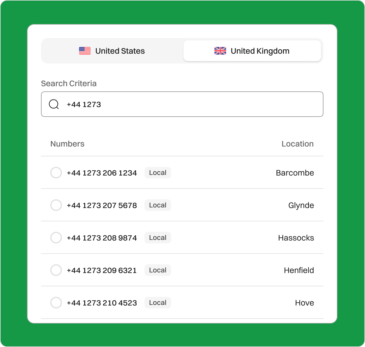 • Choose the United Kingdom as your country and search for the 01273 area code.