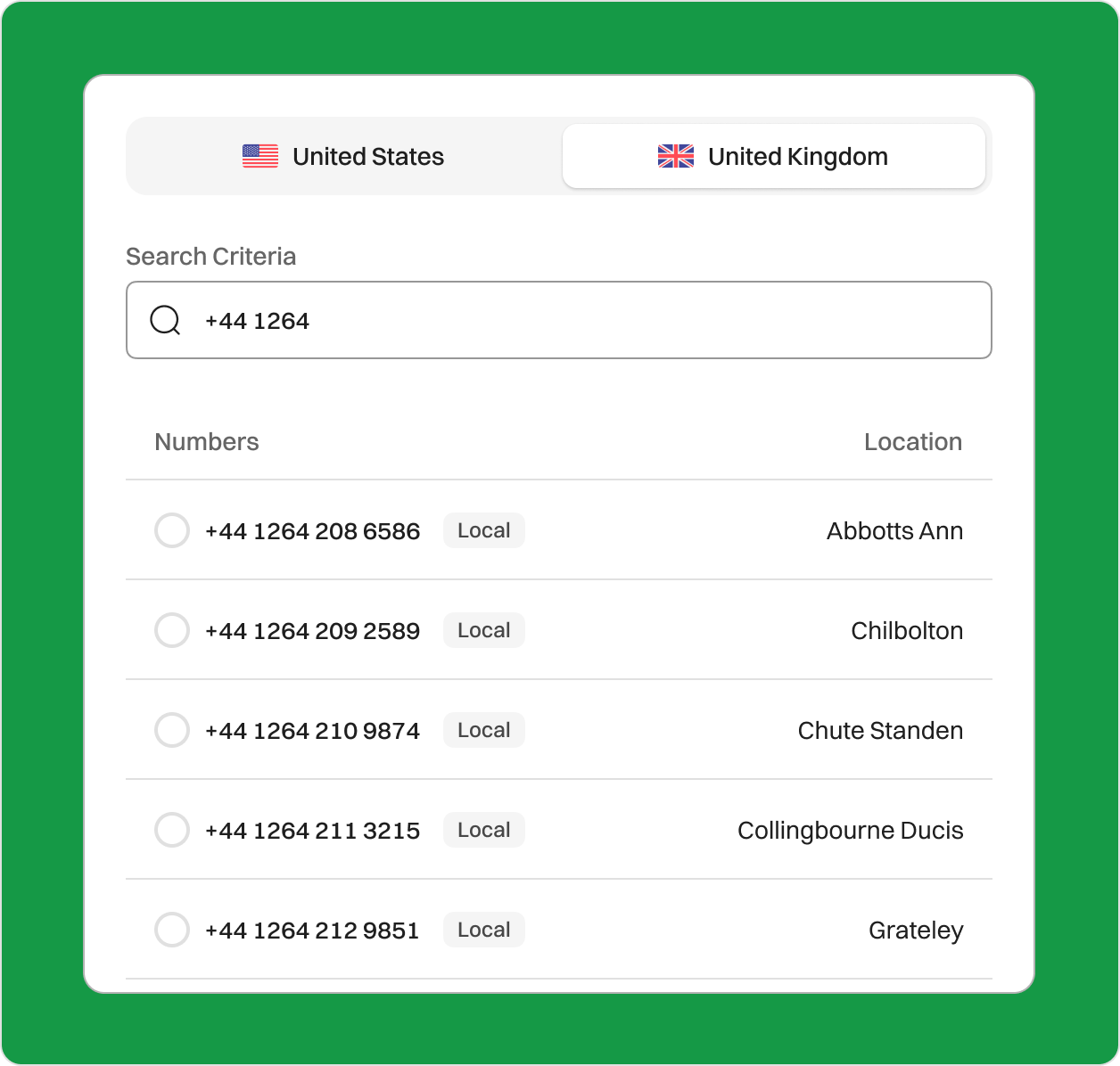 Get a 1264 Area Code Local Virtual Number for Andover, UK Get a 1264 area code virtual number for your business in Andover, Hampshire. Strengthen your local presence, build customer trust, and ensure reliable communication with a dependable virtual phone number. Sign upRequest a Demo Endorsed by top industry leaders Trusted by industry experts for excellence and innovation. What is the 1264 Area Code? The 1264 area code is a UK geographic dialing code that covers the town of Andover in the county of Hampshire. As part of the United Kingdom’s national numbering plan, it connects homes and businesses throughout Andover, a historic market town known for its military and technological contributions. Unlike North American overlay systems, 1264 is not currently overlaid by another area code. Andover operates within the Greenwich Mean Time (GMT) zone and observes British Summer Time (BST) during daylight saving periods. Country United Kingdom Region Hampshire City Andover Time Zone GMT /BST Telephone Format +44 1264 XXX XXX Example +44 1264 555 678 Where is the 1264 Area Code? The 1264 area code is located in the United Kingdom and exclusively serves the town of Andover in Hampshire. Known for its military history, Andover is home to several army headquarters and training facilities. The 1264 dialing code spans the surrounding villages and neighborhoods such as Charlton, Anna Valley, and Picket Twenty. UK area codes like 1264 are geographically assigned and not typically overlaid, meaning the code remains exclusive to this region. Calls made to 1264 numbers from outside the UK must include the country code (+44), followed by 1264 and the local number. It’s a distinctive identifier for this part of southern England. A Brief History of the 1264 Area Code The 1264 area code was introduced during the UK’s modernization of telephone systems. It replaced the older Andover code (originally 0264) during the major national renumbering event known as “PhONEday,” which took place on April 16, 1995. This initiative added a ‘1’ after the initial ‘0’ in all geographic area codes to expand capacity and prepare for future growth in telecommunications. This change allowed for greater flexibility and an increased pool of phone numbers. As demand for business lines, digital communication, and mobile services grew, the 1264 code helped support Andover’s economic and community expansion. Today, 1264 is still the official code for the area and an important part of its telecommunications infrastructure. How to Get a 1264 Area Code Phone Number? You can purchase a 1264 area code phone number from a VoIP service provider like Dialaxy. Follow these simple steps: Sign up on the official Dialaxy website or mobile app. Log in to your Dialaxy account. Search “My Number” from the “Portal” menu. Click on “Buy Number.” Choose the United Kingdom as your country and search for the 1264 area code. Complete the payment and submit any required documentation. How Does a 1264 Area Code Business Phone Number Work? A 1264 area code business phone number works by providing your company with a dedicated line that connects you to customers in Andover and the surrounding Hampshire region. It uses VoIP (Voice over Internet Protocol) technology, allowing you to make and receive calls over the internet rather than through traditional landlines. This means you can manage your business calls from any device—smartphone, laptop, or desktop—regardless of location. Whether you’re based in Andover or working remotely, a 1264 number keeps you connected. Businesses also benefit from professional features like call forwarding, voicemail-to-email, auto-attendants, call recording, and SMS support. These tools streamline operations and improve customer engagement. Choosing a 1264 number signals a strong local presence to potential clients and increases trust in your services. Dialing a 1264 Number Country Code (+44): Indicates the United Kingdom Area Code (1264): Routes the call to Andover Subscriber Number (e.g., 555 678): Unique to each phone line or business A 1264 number helps your business stand out in Hampshire while offering reliable communication features. Who’s Doing Business in the 1264 Area Code? The 1264 area code supports a diverse range of businesses and public services in Andover. Here are some key sectors and notable organizations using 1264 numbers: Military & Defense Andover is home to the British Army Headquarters, located at Marlborough Lines. The site plays a central role in military planning and operations across the UK. Logistics & Distribution Co-op Group Distribution Centre in Andover supports grocery logistics across the region. Their use of 1264 phone lines helps coordinate fleet and supply operations. Manufacturing & Engineering Stannah Stairlifts, a well-known UK manufacturer of stairlifts, has its headquarters in Andover. They rely on 1264 numbers for customer service and technical support. Technology & Innovation Leidos UK, a global science and technology company, operates out of Andover in support of Ministry of Defence contracts. Their 1264 line ensures communication with clients and partners. Healthcare & Public Services Andover War Memorial Hospital, managed by Hampshire Hospitals NHS Foundation Trust, uses 1264 numbers to provide patient access and coordinate care. Retail & Local Services David Mellor Family Jewellers, a local retail brand with a shop in Andover High Street, uses 1264 numbers to handle bookings, inquiries, and repairs. Why Does Your Business Need a 1264 Area Code Number? Enhance Customer Confidence with a 1264 Number According to Ofcom, more than 90% of people with caller ID decide whether to answer a call based on the number displayed. Using a local 1264 area code shows customers you're based in their area. That builds immediate trust. Boost Credibility Through Local Recognition A familiar Andover-based number gives your brand local authority and professional pol
