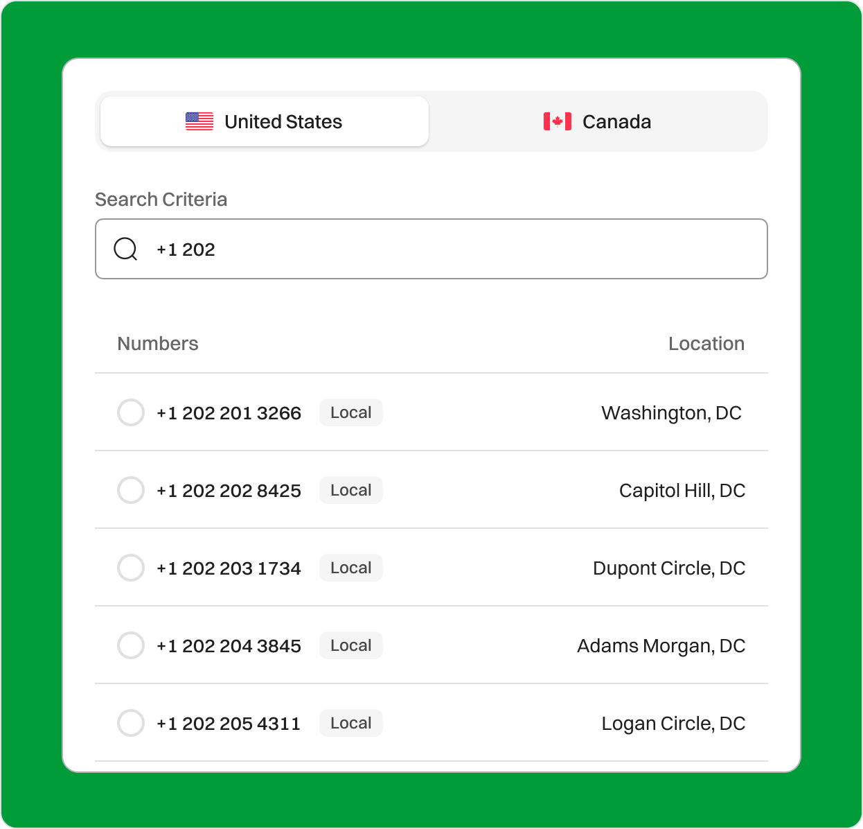 • Choose the US as your country and select the 202 area code from the list.