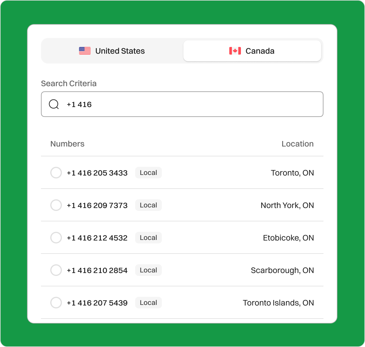 Get a 416 Area Code Local Virtual Number for Toronto, Ontario Get a 416 area code virtual number for your business in Toronto, Ontario. Strengthen your local presence, build customer trust, and ensure seamless communication with a dependable virtual phone number. Sign upRequest a Demo Endorsed by top industry leaders Trusted by industry experts for excellence and innovation. What is the 416 Area Code? The 416 area code is one of the original area codes established in Canada in 1947. As part of the North American Numbering Plan (NANP), it serves the city of Toronto, Ontario, including central and downtown districts such as Old Toronto, East York, and York. To support demand for new numbers, area code 416 has been overlaid by area codes 647 and 437. Toronto operates within the Eastern Time Zone (ET) — UTC-5 during standard time and UTC-4 during daylight saving time. Country Canada Province Ontario City Toronto Time Zone Eastern Time Zone Telephone Number Format +1(416)-XXX-XXXX Example of 416 Phone Number +1(416)-555-1234 Where is the 416 Area Code? The 416 area code is located in Ontario, Canada, and primarily serves the city of Toronto. As one of the original area codes established in 1947, 416 is closely associated with Toronto’s downtown core and surrounding neighborhoods. Due to high demand, it has been overlaid with area codes 647 and 437 to accommodate more phone numbers. Businesses often choose a 416 area code to establish a strong local presence in Toronto’s competitive market When paired with advanced call routing features, a virtual number with this area code allows companies to handle incoming calls efficiently and professionally, regardless of their actual location. This setup ensures customers in the Toronto area receive prompt and reliable service while maintaining the appearance of a local office. Whether you’re a startup or an expanding enterprise, a 416 number can boost your brand’s trust and accessibility. A Brief History of the 416 Area Code The 416 area code is one of the original 86 area codes introduced in North America in 1947. Initially, it covered the entire southern region of Ontario, including cities like Hamilton, Niagara Falls, and Toronto. As the population and demand for telephone lines grew, 416 was gradually reduced in geographic scope. In 1993, area code 905 was introduced to serve the surrounding Greater Toronto Area, leaving 416 exclusively for the City of Toronto. Continued growth led to overlays with area codes 647 in 2001 and 437 in 2013, ensuring a steady supply of numbers. Despite these changes, 416 remains a symbol of Toronto’s identity and status. It’s widely recognized and even embraced in local culture, often referred to as “The 6ix.” Today, it holds prestige for both residents and businesses seeking a connection to the heart of Canada’s largest city. How to get a 416 Area Code Phone Number? You can purchase a 416 area code phone number from a VoIP service provider like Dialaxy. Follow these simple steps: Sign up on the official Dialaxy website or mobile app. Log in to your Dialaxy account. Search “My Number” from the “Portal” menu. Click on “Buy Number.” Choose Canada as your country and search for the 416 area code. Complete the payment and submit any required documents. How does a 416 Area Code Business Phone Number work? A 416 area code business phone number works just like any standard phone number, but adds the advantage of a recognizable Toronto identity. When you get a 416 number through a virtual phone service, it doesn’t require a physical office in the city. Instead, calls made to your 416 number can be directed to any device—your cell phone, computer, or office line—using call routing features. This flexibility allows businesses to maintain a strong local presence while operating from anywhere in the world. You can also set up call forwarding, voicemail, auto-attendants, and more to ensure professional communication. Whether you’re targeting Toronto customers or establishing trust in the region, a 416 number helps your brand feel local and accessible. It’s a smart way to build credibility and connect with clients in one of Canada’s busiest and most competitive markets. Dialing a 416 Number Country Code (1): Identifies Canada Area Code (416): Routes the call to central Toronto Local Exchange (e.g., 555): Pinpoints a specific neighborhood or service region Subscriber Number (e.g., 1234): Identifies the individual or business line A 416 business number offers a professional, reliable connection to customers in Toronto and beyond. Who’s doing business in the 416 Area Code? The 416 area code plays a central role in Toronto’s dynamic economy. Here’s a look at the industries and companies driving growth in the region: Financial Services Toronto is Canada’s financial capital. Institutions like RBC, TD Bank, and Scotiabank use 416 numbers to handle regional operations, client relations, and investor communications. Technology and Startups With a booming tech sector, companies like Shopify, Wealthsimple, and numerous startups at MaRS Discovery District use 416 numbers to engage local users and partners. Healthcare & Medical Research Leading institutions such as University Health Network and SickKids Hospital rely on the 416 area code numbers to coordinate patient care and research communications. Education & Academia Universities, including the University of Toronto and Ryerson University, use 416 numbers for student services, faculty offices, and academic outreach. Real Estate & Development Toronto’s competitive housing market involves brokerages, developers, and investors, many of whom use 416 lines to handle local property inquiries and deals. Entertainment & Media As home to film festivals, music venues, and media giants like CBC and Bell Media, Toronto’s creative scene thrives with 416 area code connectivity. Why Does Your Business Need a 416 Area Code Number? Local Presence in Toro