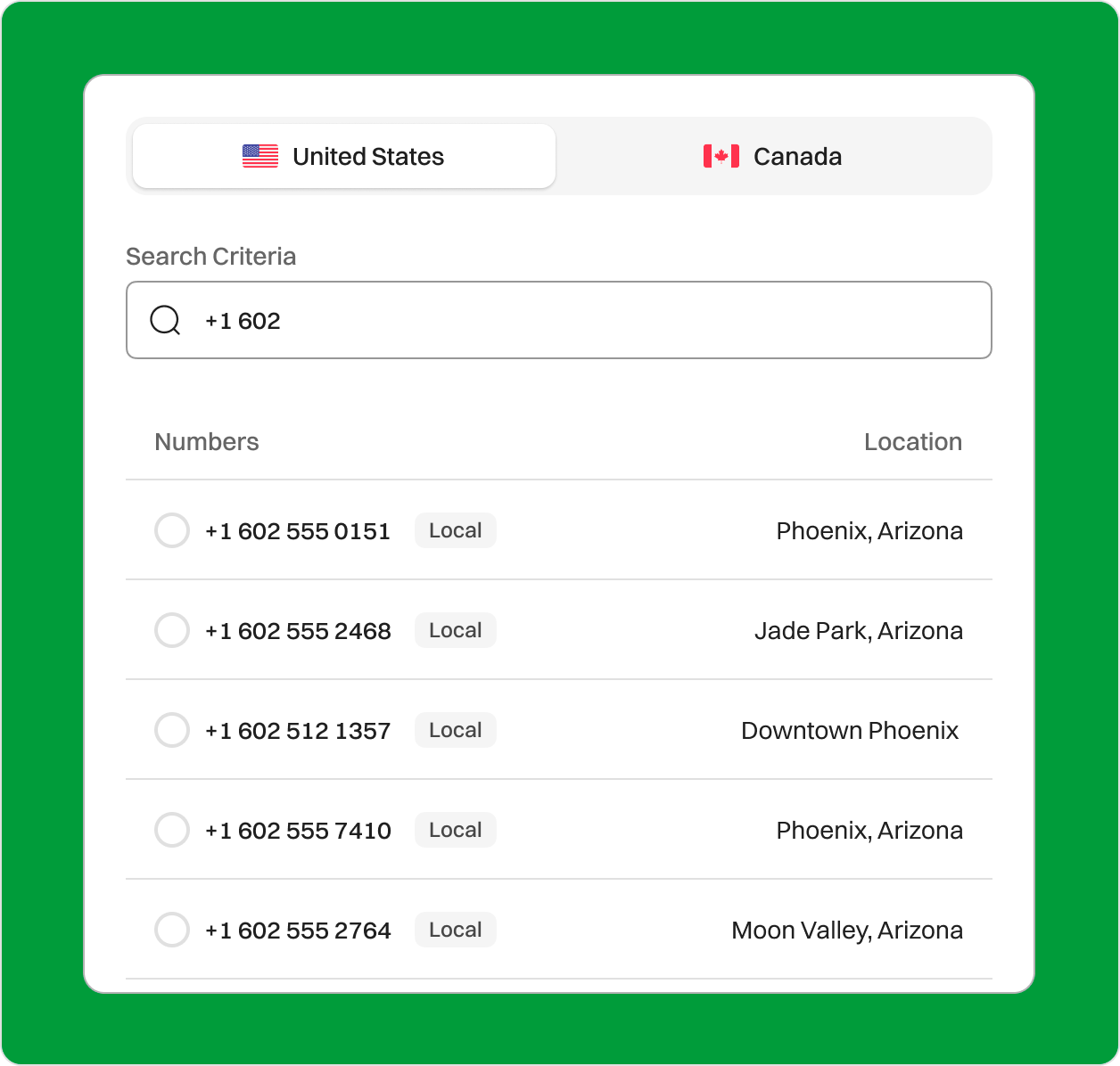 Secure your 602 Area Code Business Numbers Today Looking to improve your business’s local presence in Phoenix, Arizona? Learn how the 602 area code number can boost the business’s visibility and connectivity in this key metropolitan area. Sign upRequest a Demo Endorsed by top industry leaders Trusted by industry experts for excellence and innovation. What is the 602 Area Code? The 602 area code, or otherwise referred to as the “Phoenix area code,” is the phone area code for Phoenix, Arizona. 602 area code was originally designated for the entire Arizona state but subsequently restricted to certain locations of Arizona, i.e., Phoenix, Glendale, and Paradise Valley. Area code 602 went into service in 1947, when the Bell System and AT&T introduced the initial 86 area codes. The 602 area code was divided in 1995 so that part of the numbers became 520. It was divided a second time in 1999 to meet demand, yielding area code 480 and area code 623. Country USA State Arizona Major City Phoenix Time Zone (UTC-7) Telephone Number Format (602) XXX-XXXX Example of 805 phone number 602-285-1234 How to get a 602 area code phone number? You can purchase a 602 area code phone number from any VoIP company, such as Dialaxy, to effectively operate your business. Just complete these steps for purchasing one: Sign up via the official website or mobile app. Login with the correct credentials to access the dashboard. Click the “My Number” option under the “Portal” menu. Select the “Buy Number” option. Choose “US” as the country and select the desired 602 area code from the list. Make payment and submit necessary documents if necessary. How do 602 Area Code Phone Numbers work? Area code 602 is assigned to the North American Numbering Plan (NANP). The 602 area code functions similarly to all other area codes in that all calls are directed to the telecommunications system responsible for handling phone numbers within the given area. 602 is not overlaid. Each area code is associated with a distinct geographical area. In the case of area code 602, its primary city is Phoenix, which includes a sizable portion of Maricopa County in Arizona. It mainly offers service in three major cities: Phoenix, Glendale, and Paradise Valley. The users are supposed to dial the complete 10-digit phone, that is, dialing a phone with a different area code. For instance, a user is supposed to dial the user from the 602 facility area code, a user is supposed to dial the 10-digit phone with the area code phone number 602-285-1234, where 602 is the area code of Phoenix, “285” is the phone exchange number, and 1234 is the specific phone number. Who’s doing business in the 602 area code? Area code 602 serves a broad range of businesses and sectors in Phoenix, establishing a local vibe. Innovative businesses in the fields of technology, healthcare, and finance are expanding rapidly in places such as Phoenix. The well-established companies in these regions are thriving as well and contribute significantly to the expansion of the economy and job possibilities in a variety of industries. No matter where your company is based in Phoenix, you can create professional business-to-business relationships with clients using a locally based 602 phone number. As per census.gov, a few of the most well-known companies that operate in the 602 area code region are: Educational establishments Glendale Community College, Arizona State University, Phoenix College, and Grand Canyon University. Financial Sectors Wells Fargo, Bank of America, Vanguard, and American Express. Healthcare Centers Mayo Clinic, Mercy Gilbert Medical Center, Banner Health, and HonorHealth. Other necessary businesses GoDaddy, PetSmart, Axway, Intel Corporation, and Amazon. Why Does Your Business Need a Phoenix Area Code Number? Create a Local Presence for Maricopa County An area code from Arizona provides a feel of localized management of the Arizona market to your company. Your company can be established from a variety of new geographies, from major cities such as Phoenix, through area code 602. Increase the Rate of Call Acceptance When businesses make cold calls to potential customers, the leads might not answer the unknown number. However, if your business uses a specific area code, there is a greater chance that the leads will receive and engage in the call. Better Customer Service Customers can save money by eliminating long-distance charges when calling a 602 local area code number. Likewise, customers in your local area can inquire more easily about your products and services because it is more convenient to contact you. Marketing Edge Use a local area code to help you better target customers in the 602 area in your marketing campaigns. People often prefer dealing with local businesses, and having a 602 number can give you a competitive edge over companies with non-local phone numbers in various regions of Arizona. Enhanced Communication Businesses can use a 602 area code number for customer support or sales. This can help establish clear communication channels between the customers and the business. Customers might feel more comfortable contacting a local number for assistance or inquiries. Advanced Features Purchasing area code 602 from us gives you access to advanced features such as voicemail, call recording, video conferencing, call routing, Interactive Voice Response (IVR), and more. Enjoy 100+ Dialaxy’s features with local phone number Call, SMS, & Contact in one easy to use app. Phone Numbers Global Calling SMS Voicemail Number Sharing Contacts All Features Phone Numbers Expand your reach with Virtual Phone Numbers International Numbers: Establish a local presence of your business with our international phone numbers . Toll Free Numbers: Elevate your sales strategy and drive business growth with Toll Free Numbers. Multiple Phone Numbers: Use multiple phone numbers in one single dashboard. Explore our apps Global Calling Connect globally with e