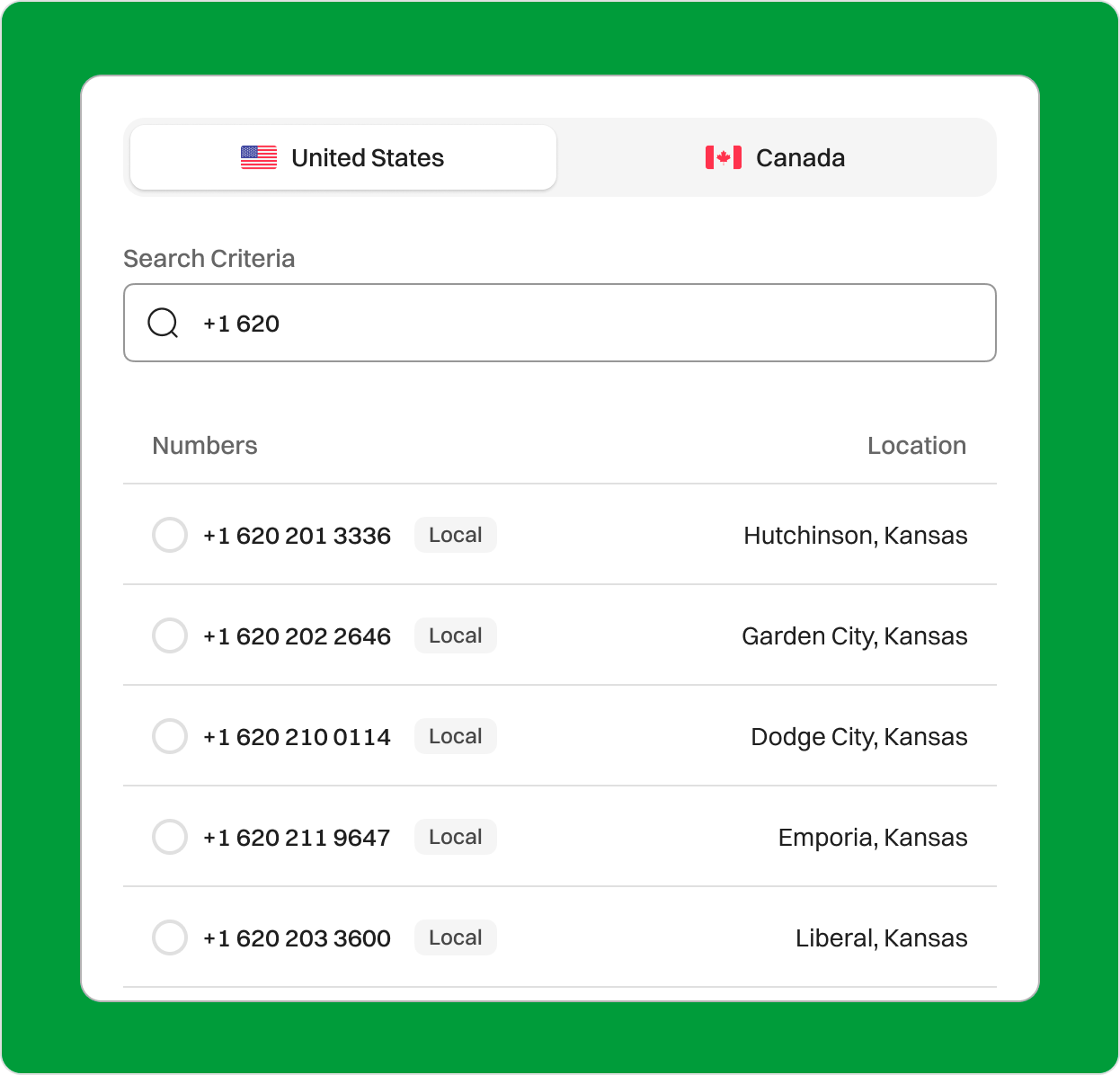 Boost Your Business with a 620 Area Code in Dodge City, Kansas Are you prepared to extend your business reach into the heart of Kansas? Let us assist you in establishing a virtual phone number with the 620 area code, making your business visible and accessible within this bustling Midwestern region. Sign upRequest a Demo Endorsed by top industry leaders Trusted by industry experts for excellence and innovation. What is the 620 Area Code? The 620 area code is located in the heart of Kansas, covering a wide and diverse region known for its vibrant communities and evolving business landscape. Some of the key cities within this area code include Hutchinson, Garden City, and Dodge City. The region also consists of a range of smaller towns that add to the dynamic cultural and economic fabric of Kansas. Originally established in 2001 as a split from the 316 area code, the 620 area code serves areas that are essential to Kansas’s economic and cultural identity. Positioned within the Central Time Zone (UTC-6), businesses with a 620 area code can easily synchronize with clients and partners in the Midwest, ensuring smooth and timely communication. The 620 area code covers major areas in Kansas and provides an excellent opportunity for businesses to establish a local presence in a region that values community connection and economic resilience. Country USA State Kansas Major City Hutchinson, Garden City, Dodge City Time Zone Central Time Zone Telephone Number Format +1 (620) 200-6789 Example of 620 phone number +1-620-555-0101 How to Get a 620 Area Code Phone Number? Dialaxy makes securing a 620 area code virtual phone number straightforward. Follow these simple steps to get connected in this key Midwestern region: Sign up on the official Dialaxy website or mobile app. Log in to your account and navigate to the dashboard. Select “My Number” from the “Portal” menu. Click on “Buy Number.” Choose the US as your country and select the 620 area code from the list. Complete the payment and submit any required documents. Your new 620 area code number will be activated shortly, ready for business communications powered by Dialaxy’s VoIP technology. How Does a 620 Business Phone Number Work? The 620 area code is part of the North American Numbering Plan (NANP) and serves as an important business region within Kansas. Securing a local number with a 620 area code allows your business to establish a trusted presence in this stable and loyal market. Known for its dynamic spirit, Kansas provides a unique advantage for companies aiming to connect with local customers. To call a 620 area code number, use the format +1 (620) 200-1234: 1 is the country code for the United States. 620 is the area code directing the call to Kansas. 200 represents the local exchange, and 1234 is the subscriber number. Dialaxy’s VoIP service provides advanced features like call forwarding, SMS functionality, automated responses, and detailed call analytics, enabling your business to operate efficiently in the 620 area. Who Is Doing Business in the 620 Area Code? The 620 area code covers one of the most agriculturally and industrially rich regions of Kansas, where various thriving industries support a robust economy: Agriculture and Farming Kansas is recognized nationally for its contributions to agriculture, and the 620 area code region includes vital crop and livestock production areas. Energy Kansas’s wind energy and other natural resource industries play a significant role here, offering growing business opportunities within the 620 area. Manufacturing Companies in sectors such as machinery, food processing, and equipment manufacturing are widely represented and benefit from Kansas’s skilled workforce. Healthcare The state’s expanding healthcare sector, including rural health initiatives and innovative medical facilities, is especially important in this area. Education Kansas is home to many reputable educational institutions and vocational programs, providing businesses with access to a skilled talent pool. Positioning your business in the 620 area code allows you to engage with Kansas’s rich economic landscape, from agriculture to manufacturing and beyond. Why Choose the 620 Area Code for Your Business? Establish a Local Presence in Kansas A 620 area code number associates your business with the heart of Kansas, enhancing your brand’s credibility and recognition among locals. Even if your company operates from a different location, a local number allows you to connect with Kansas customers seamlessly. Boost Customer Trust and Sales Customers often prefer contacting local numbers, which they recognize and trust. With a 620 area code number, clients in Kansas and nearby regions will feel more inclined to trust your business, leading to higher customer engagement and driving conversions. Enhanced Mobile Accessibility Dialaxy’s VoIP technology lets you take your 620 area code number wherever you go, seamlessly integrating with mobile devices. Stay connected to your business line on your smartphone, tablet, or laptop, making it easy to manage calls on the go without restrictions. Separate Personal and Business Communications Keep your personal and business lines separate for better organization and a professional image. A dedicated 620 area code phone number allows you to handle business calls efficiently, giving your clients a consistent point of contact without affecting your private line. Enhanced Customer Service Dialaxy offers advanced call features like call forwarding, auto-attendants, and detailed call tracking, making it easier to manage customer interactions. These tools ensure you can deliver superior customer service, improve response times, and increase satisfaction levels. Insightful Communication Analytics With Dialaxy’s 620 area code number, you gain access to valuable communication analytics. Track metrics like call duration, customer interactions, and response times to refine your custom