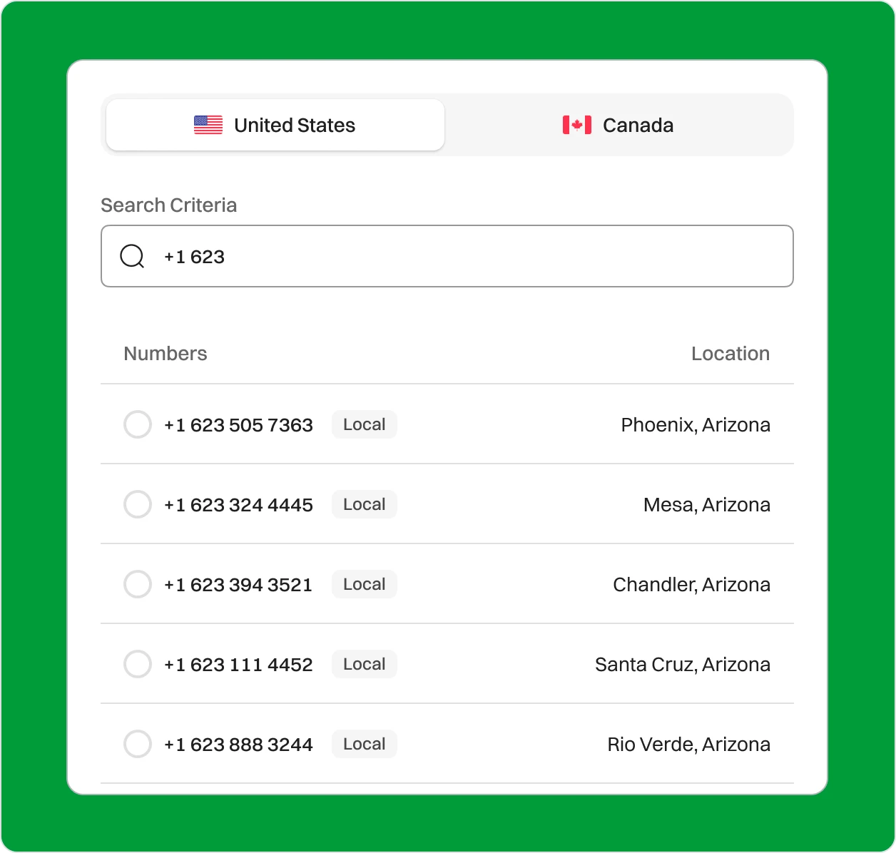 623 Area Code Virtual Phone Number in Arizona – Get Yours Today! Searching for an effortless way to establish a reliable local presence for your business in Arizona? Look no further. We’re here to guide you step-by-step. Sign upRequest a Demo Endorsed by top industry leaders Trusted by industry experts for excellence and innovation. What is the 623 area code? The 623 area code serves the western Phoenix metropolitan area in Arizona, covering cities like Glendale, Peoria, and Sun City. It’s part of the Mountain Standard Time zone, ensuring seamless communication within the region. Introduced in March 1999, the 623 area code was established to meet the growing demand for phone numbers in Arizona as an overlay to the 602 area code. This addition allowed residents and businesses to access a larger pool of numbers. By choosing the 623 area code with Dialaxy, you can effortlessly build a local presence in Arizona, expanding your reach without needing a physical location. This helps create meaningful connections with local customers and supports your business growth. Country USA State Arizona Major City Phoenix, Mesa, Tucson, Yuma Time Zone Mountain Time Zone (MT) or Mountain Standard Time (MST) Zone Telephone Number Format +1 (623) XXX-XXXX Example of 623 phone number +1-623-572-3563 Zip Code 85001 to 85396 How to get a 623 Area Code Phone Number? To get a 623 area code number, choose Dialaxy as your VoIP provider and follow these steps: Sign up via the Dialaxy website or mobile app. Log in with your credentials to access the dashboard. Select “My Number” under the “Portal” menu. Click on “Buy Number.” Choose “US” as the country and select the desired 623 area code. Complete the payment and submit any required documents. How does a 623 business phone number work? The 623 area code is part of the North American Numbering Plan, serving regions in Arizona, USA. Businesses can allocate 623 area code numbers to team members, enabling effective communication management and activity tracking. This helps establish a local presence and build rapport with communities across Arizona. When dialing a number like 572-6789, you would dial 1-623-572-6789. The ‘1’ serves as the country code for the USA,while ‘623’ directs the call to Arizona, and ‘572’ is the exchange code identifying the local carrier. Lastly, ‘6789’ represents the unique subscriber number. Dialaxy offers local 623 area code numbers with advanced features like call handling, IVR, SMS, number porting, and more, tailored for your business communication needs. Starting at just $20 per user per month, Dialaxy’s plans provide excellent value for businesses. Who is doing business in area code 623? The 623 area code covers Arizona’s bustling western Phoenix metropolitan region, making it a prime location for businesses of all sizes. With Dialaxy, companies in this area gain access to exceptional communication solutions for local and international connections. Whether you’re a startup or an established enterprise, the 623 area code connects you with Arizona’s vibrant business communities. The 623 area code supports diverse industries, such as: Technology Companies like Honeywell Aerospace and ON Semiconductor thrive in this region Healthcare Banner Health and Abrazo Health provide vital healthcare services Education Glendale Community College plays a significant role in shaping local academia Retail Arizona’s major shopping centers like Westgate Entertainment District attract diverse retailers Tourism & Hospitality The area features popular resorts and attractions, supporting a dynamic tourism industry With an estimated population of over 4.7 million in the Phoenix metro area and a median household income of $61,968, the 623 area code offers a thriving market. Unlock business potential in Arizona with a 623 virtual phone number from Dialaxy. Why Choose a 623 Area Code Number for Your Business? Establish a local presence in Arizona, U.S. Build trust and credibility with a local presence in Arizona using the 623 area code. Reach your target audience effortlessly and capitalize on local opportunities. Boost acceptance rates and sales Use the 623 area code to enhance customer trust, simplify agents' communication tasks, and improve sales conversion rates. No special equipment is needed The Dialaxy app allows you to use your 623 area code on your current devices without requiring additional hardware. Separate work and personal numbers Keep personal contacts confidential with a dedicated 623 number for business. Access it on any device and disable notifications when off duty. Improve Customer Service Experience Enhance customer interactions using your 623 area code number with call routing, automated responses, and real-time analytics. Access to Advanced Communication Analytics With a 623 area code number from Dialaxy, monitor call metrics and customer interactions to refine marketing strategies and drive business success. Enjoy 100+ Dialaxy’s features with local phone number Call, SMS, & Contact in one easy to use app. Phone Numbers Global Calling SMS Voicemail Number Sharing Contacts All Features Phone Numbers Expand your reach with Virtual Phone Numbers International Numbers: Establish a local presence of your business with our international phone numbers . Toll Free Numbers: Elevate your sales strategy and drive business growth with Toll Free Numbers. Multiple Phone Numbers: Use multiple phone numbers in one single dashboard. Explore our apps Global Calling Connect globally with effortless calls Extended Reach: Enables businesses to expand their market by reaching international customers. Flexibility: Allows employees to make international calls from anywhere. Seamless Communication: Ensures clear and reliable communication with international contacts. Learn More SMS Enhance communication with SMS capabilities A2P 10DLC: Register your number in A2P 10DLC to send sms within US and Canada. Schedule SMS: S