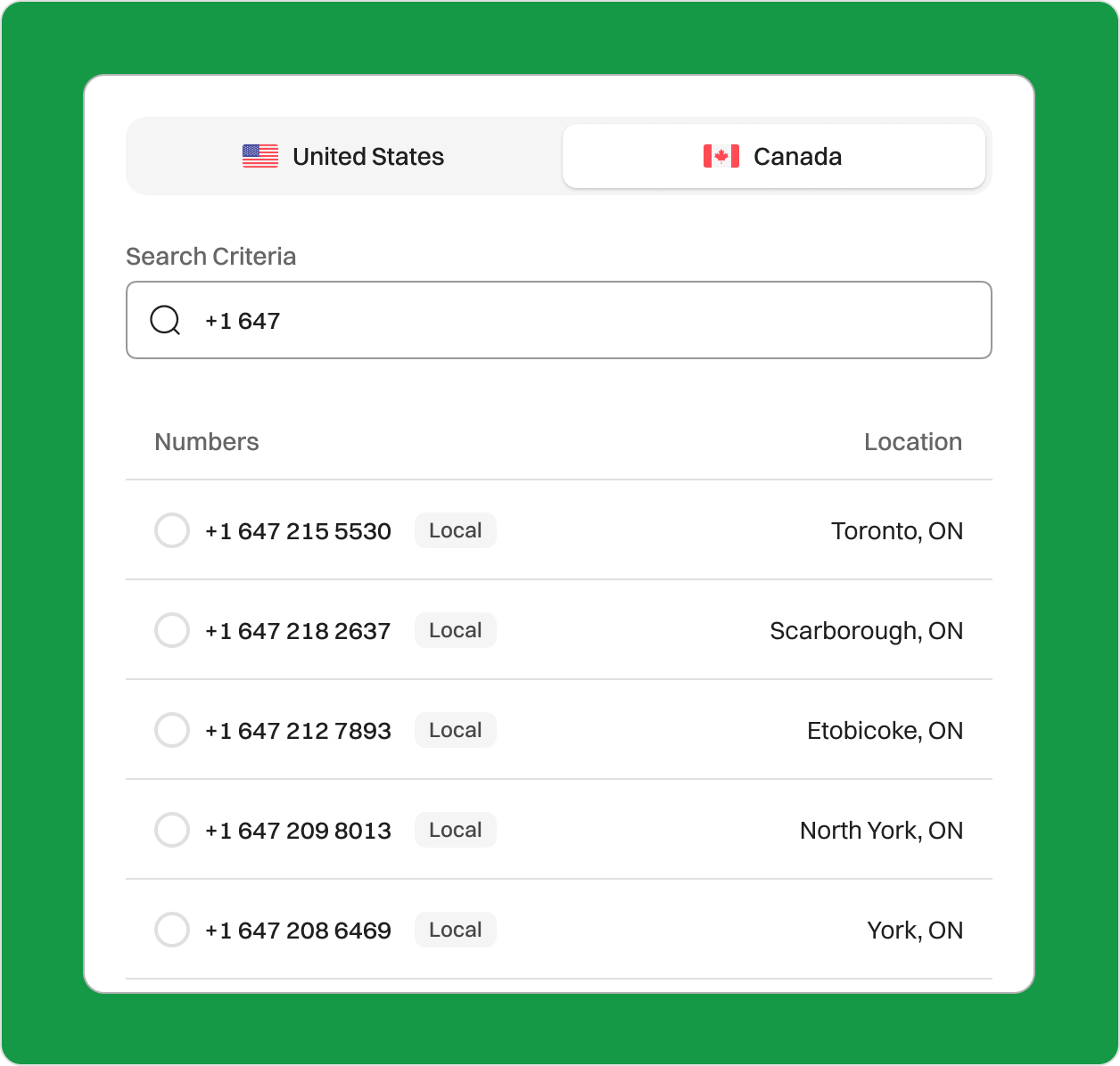 Get a 647 Area Code Local Virtual Number for Toronto, Ontario Get a 647 area code virtual number for your business in Toronto, Ontario. Strengthen your local presence, build customer trust, and ensure seamless communication with a dependable virtual phone number. Sign upRequest a Demo Endorsed by top industry leaders Trusted by industry experts for excellence and innovation. What is the 647 Area Code? The 647 area code is part of the North American Numbering Plan (NANP) and serves Toronto and parts of the Greater Toronto Area in Ontario, Canada. Introduced in 2001 as an overlay to the 416 area code, it helps meet the growing demand for phone numbers in the region. The 647 area code was later overlaid by area code 437 to further expand number availability. Toronto, covered by this area code, lies in the Eastern Time Zone (ET) — UTC-5 during standard time and UTC-4 during daylight saving time. Country Canada Province Ontario City Toronto Time Zone Eastern Time Zone Telephone Number Format +1(647)-XXX-XXXX Example of 647 Phone Number +1(647)-555-6789 Where is the 647 Area Code? The 647 area code covers Toronto and nearby municipalities within the Greater Toronto Area (GTA), including North York, Scarborough, Etobicoke, and York. It functions as an overlay to the original 416 area code and shares the region with the newer 437 overlay. This means all three area codes serve the same geographic location, helping meet high demand for phone numbers in one of Canada’s most densely populated urban centers. Because of this overlay system, 10-digit dialing is mandatory for local calls across the region. A virtual number with a 647 area code allows businesses to establish a trusted presence in Toronto while managing calls from anywhere. Combined with tools like an AI call summary, companies can improve call handling, save time on note-taking, and boost customer service without sacrificing their local identity. A Brief History of the 647 Area Code The 647 area code was introduced in 2001 as the first overlay for Toronto’s original 416 area code. The decision to implement an overlay, rather than split the geographic region, reflected Toronto’s rapid growth and the rising demand for phone numbers driven by cell phones, fax machines, and internet-connected devices. Prior to this, area code 416 had served the region exclusively since 1947. As the population expanded and businesses flourished, the need for additional numbering options became clear. The introduction of 647 allowed existing numbers to remain unchanged while supporting new connections. In 2013, area code 437 was added as a second overlay to accommodate continued demand. Today, the 647 code is widely recognized and remains a key part of Toronto’s communication infrastructure, used by residents, businesses, and organizations alike to maintain a strong local presence. How to get a 647 Area Code Phone Number? You can purchase a 647 area code phone number from a VoIP service provider like Dialaxy. Follow these simple steps: Sign up on the official Dialaxy website or mobile app. Log in to your Dialaxy account. Search “My Number” from the “Portal” menu. Click on “Buy Number.” Choose Canada as your country and search for the 647 area code. Complete the payment and submit any required documents. How does a 647 Area Code Business Phone Number work? A 647 area code business phone number uses VoIP (Voice over Internet Protocol) technology to connect calls over the internet. This allows businesses to communicate using smartphones, computers, or desk phones while appearing locally based in Toronto. Whether you’re operating from within the city or remotely, a 647 number helps establish a credible local presence. With providers like Dialaxy, businesses can access features such as call forwarding, voicemail-to-email, SMS, and auto-attendants. These tools streamline communication and ensure customers are always connected to the right person or team. A 647 virtual number offers flexibility, affordability, and reliability for businesses looking to grow within the Greater Toronto Area. Dialing a 647 Number Country Code (1): Indicates Canada Area Code (647): Routes the call to the Toronto region Local Exchange (e.g., 555): Refers to a specific area in the city (e.g., downtown Toronto) Subscriber Number (e.g., 6789): A unique 4-digit personal or business number A 647 business number helps establish your brand professionally within the Greater Toronto Area. Who’s doing business in the 647 Area Code? Toronto is one of Canada’s most dynamic economic hubs. A 647 number connects you with the city’s thriving sectors: Finance & Banking Toronto is the financial capital of Canada. Major institutions like RBC, TD Bank, and Manulife use local numbers to serve clients and coordinate regional services. Technology & Startups With innovation clusters like the MaRS Discovery District, Toronto’s tech sector includes both startups and global leaders like Shopify and Google Canada. These firms rely on 647 numbers to stay connected with users and partners. Healthcare & Medical Services Home to institutions like the University Health Network and SickKids Hospital, Toronto’s extensive medical community uses 647 numbers for patient outreach and care coordination. Real Estate & Construction Toronto’s booming real estate market includes firms like Tridel and Colliers. Agents use local 647 numbers to attract buyers and communicate with clients. Media & Entertainment As a center for film, television, and digital content, production houses and agencies in Toronto maintain 647 numbers for managing casting, bookings, and public relations. Education & Research Universities such as the University of Toronto and Ryerson University (TMU) rely on 647 lines for student services, academic departments, and administrative support. Why Does Your Business Need a 647 Area Code Number? Establish a Local Presence in Toronto Using a 647 area code helps your business appear l