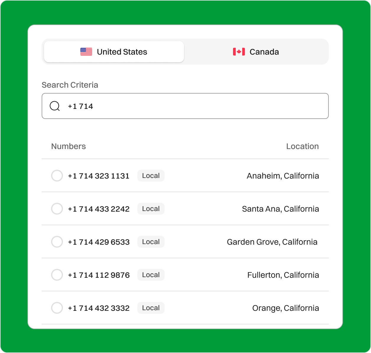 Expand Your Business with a 714 Area Code Phone Number Looking to expand your business in Orange County, California? Dialaxy offers a convenient solution to acquire a 714 area code number. You may easily and effectively engage with local customers and improve your local presence with the help of our guide. Sign upRequest a Demo Endorsed by top industry leaders Trusted by industry experts for excellence and innovation. What is the 714 area code? The 714 area code is situated in Southern California and covers a considerable portion of Orange County. Key cities within this area code include Anaheim, Santa Ana, Huntington Beach, Fullerton, Garden Grove, Orange, Tustin, Westminster, Costa Mesa, Placentia, Buena Park, Cypress, Stanton, Villa Park, and Yorba Linda. Additionally, the 714 area code extends into La Mirada, located in Los Angeles County, and Chino Hills, which is part of San Bernardino County. Region 714 has a history in the North American Numbering Plan (NANP) and was first implemented in 1951 shortly after 213 was split off from it. As demand increased, 714 was split again in 1998 to create 949, and in 2008, area code 657 was overlaid to cover the same service area. Area codes 714 and 657 are currently used to cover central Orange County and surrounding areas. Neighboring codes include 626, 562, 951, and 949. All these area codes follow the North American Numbering Plan, which helps organize phone numbers across the U.S. and other participating countries. With large cities and a high population, the 714 area code California region offers strong business potential. Anaheim alone has approximately 346,000 residents, Santa Ana has 334,000, and Huntington Beach has nearly 190,000, offering a vast pool of customers to target for any local or expanding business. Country USA State California Major City Anaheim Time Zone Pacific Time Zone Telephone Number Format +1 (714 ) XXX-XXXX 714 Area Code Phone Number Example +1-714-662-0515 Zip Code 90602-92899 How does a 714 business phone number work? The 714 business phone number works in the same way as any other number in the United States. The North American Numbering Plan (NANP) includes the 714 area code. The caller must dial a 10-digit number, including the area code, while placing a call. For example, calling 662-0515 would follow the dialing sequence of +1-714-662-0515; meaning +1 is the country code for the United States, 714 is the area code for the area location, 662 is a central code (exchange) to route your call to the provider, and 0515 is the subscriber number identifying the business or person you’re calling. With every Dialaxy plan, you’ll receive a local phone number with the 714 area code. Enjoy a variety of advanced features, including IVR, SMS messaging, call forwarding, number sharing, and much more. It’s the perfect solution for all your communication needs! Who’s doing business in the 714 area code? The 714 area code plays a central role in Orange County’s business growth. Here’s a look at key industries and companies thriving in the region: Tourism & Entertainment This region, home to Anaheim's Disneyland Resort, welcomes millions of tourists each year. 714 phone numbers are used by hotels, tour companies, and event coordinators to manage reservations and customer support. For both visitors and locals, a local number boosts phone response rates and fosters trust. Healthcare & Medical Services With facilities like UCI Medical Center, 714 area code phone numbers are essential for clinics, hospitals, and specialist offices. Whether booking appointments or routing urgent incoming calls, reliable local numbers facilitate fast and clear communication with patients across Santa Ana, Garden Grove, and Tustin. Retail & Food Services Retail hubs, such as South Coast Plaza, and popular restaurants in Fullerton, Huntington Beach, and Seal Beach require local phone numbers as points of contact. Restaurants and boutiques rely on text messaging, call forwarding, booking, and customer service. Tech & Electronics Companies like Panasonic and fast-growing startups across Irvine and La Mirada choose 714 area code numbers to build local trust. With advanced phone systems, teams can scale support, forward calls, and route messages to the right departments instantly. Education & Learning Centers 714 area code lines are being used for parent outreach, student announcements, and administrative support in schools, tutoring programs, and local colleges and universities in Yorba Linda, Villa Park, and Costa Mesa. Local numbers help create familiarity and increase the likelihood of eliciting a timely response from our community. Home Services & Contractors From plumbing and electrical to landscaping and HVAC, local contractors in Midway City, Stanton, and Buena Park use 714 phone numbers to attract local leads. One example: a plumbing business in Villa Park saw a spike in call pick-up rates after switching to a local 714 number via a VoIP app, because customers are more likely to answer familiar-looking calls. What are the benefits of using Dialaxy’s 714 phone number for your business? Establish a local presence in Anaheim To establish a local presence for your company, use the 714 area code. Simply use the local phone number to make business calls, regardless of your location. Dialaxy makes it easier for you to do this. Establish connections with local clients, understand their needs, and deliver valuable services. Enhance the business's professional image Select a phone number with the 714 area code to enhance your business's professional image. Local businesses frequently generate more trust and preference among customers. Utilizing a local phone number gives your business an authentic appearance and helps establish trust with your clientele. Keep work and personal phone numbers separate Keep your personal information secure with a specific 714 phone number for your business, which you can access from your device from any location