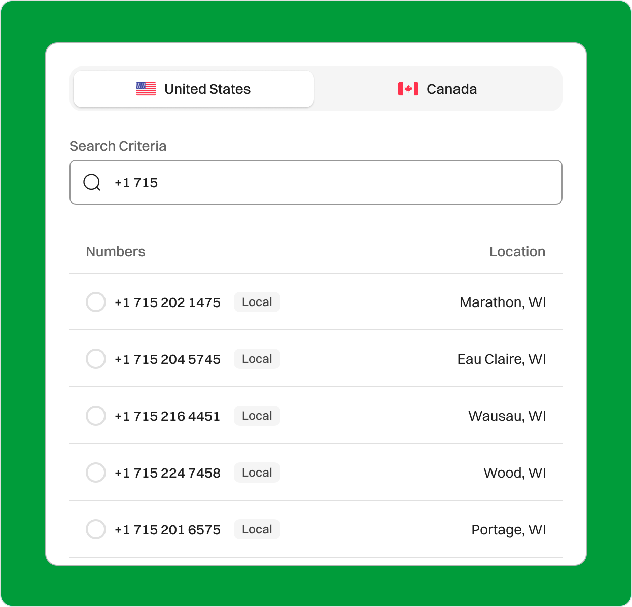 • Choose “US” as the country and select the desired 715 area code from the list.