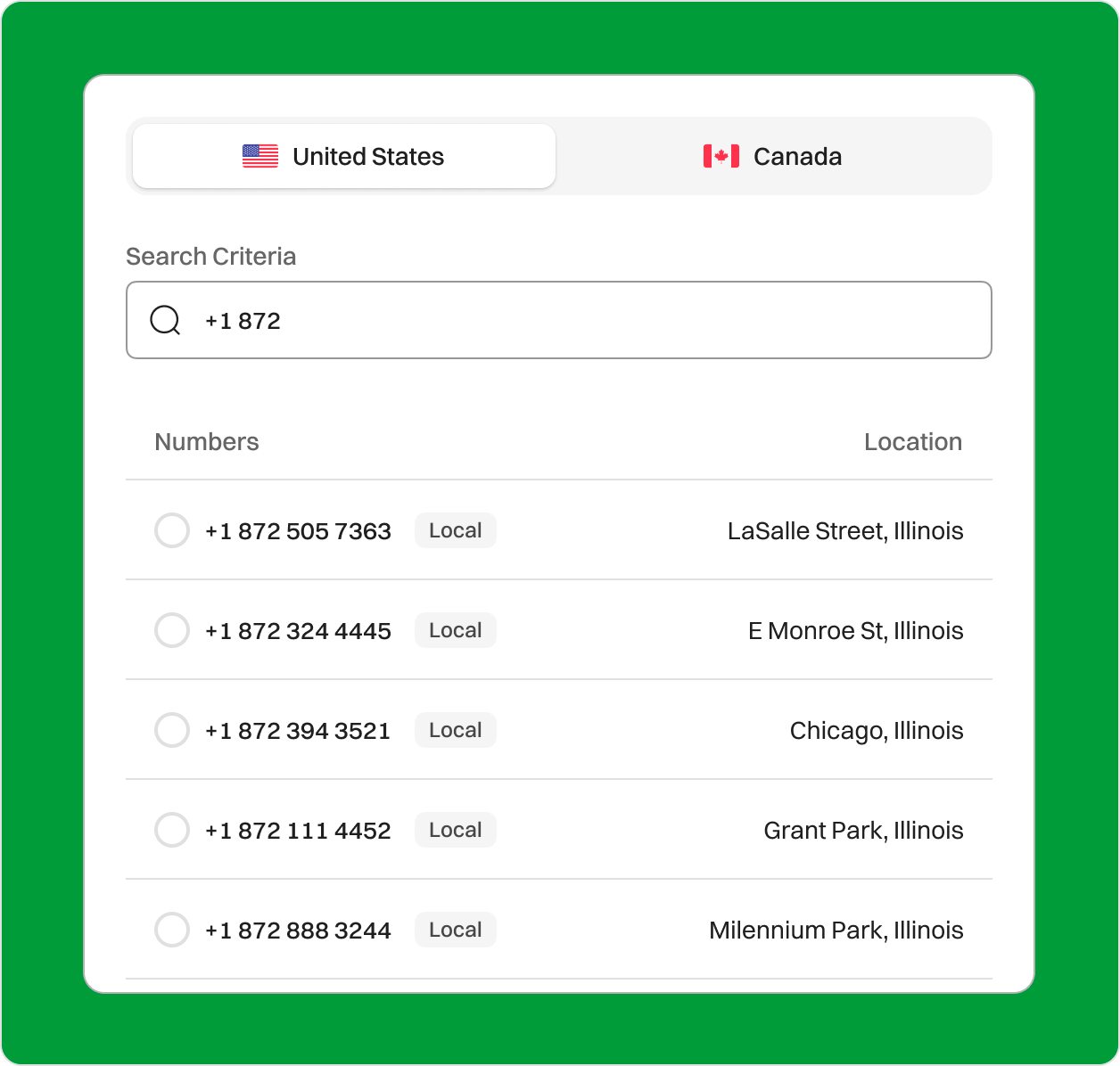 Boost Your Business with an 872 Area Code Phone Number in Chicago Improve your business presence in Chicago and the surrounding areas by using an 872 area code number through Dialaxy. Whether you’re operating in the heart of Chicago or the nearby communities, having an 872 number helps to establish a strong local presence, building trust and credibility among the customers. Sign upRequest a Demo Endorsed by top industry leaders Trusted by industry experts for excellence and innovation. Which Region Uses the 872 Area Code? The 872 area code is located in Cook County of Chicago City, USA. It follows the Central Time Zone, which is also referred to as America/Chicago. This area code was introduced on November 7, 2009, as an overlay of area code 312 and area code 773. Telecommunication authorities introduced it as one of the original area codes in 1947. Although it was not in operation in 1998, a new area code 323 was in use to serve Los Angeles California.Area Code 872 serves Chicago,Illinois,USA.Now both the area code 872 and 323 covers the same area. The major city area code 872 serves include 219 for Hammond, IN (Indiana), 224/847 for Elgin, IL (Illinois), 312 for Chicago, IL (Illinois), 331/630 for Aurora, IL (Illinois), 708 for Cicero, IL (Illinois), 773 for Chicago, IL (Illinois), and 779/815 for Rockford, IL (Illinois). Country USA State Illinois Major City Chicago Time Zone Central Time Zone Telephone Number Format +1 (872)-XXX-XXXX Example of 872 phone number +1 (872)-233-4321 Zip Code 90001 to 90249 How to get an 872 Area Code Phone Number? You can purchase an 872 area code phone number from a VoIP service provider like Dialaxy. You can follow these steps. Sign up through the Dialaxy website or mobile app. Log in with your credentials to access your dashboard. Click the “My Number” option under the “Portal” menu. Select the “Buy Number” option. Choose “US” as the country and select the desired 872 area code from the list. Complete the payment process and provide any necessary documentation if required. How does an 872 business Phone Number work? The North American Numbering Plan (NANP) allocates continents into various area codes, known as Numbering Plan Areas (NPAs). When making a call, the callers must dial the 10-digit number, including the area code. For example, to call the number 233-4321 you can dial 1-872-233-4321, where 1 is the country code for the United States, whereas the 872 area code routes call to the relevant region, the 233 is an exchange code, also known as the central office code that sends calls to a particular carrier or service provider. The subscriber number which is the last 4321, designates the particular company or person being phoned. With every Dialaxy plan, you can get a local number with the local 872 area code. These 872 prefix numbers come with enterprise-grade features like number sharing, number porting, text messages (SMS), multimedia messages (MMS), call blocking, and more. Who’s doing business in the 872 Area code? The population of Chicago is 2.7 million, it makes advantageous for enterprises looking to expand their reach and boost sales. All kinds of businesses relocate to Chicago because of its numerous buildings, busy streets and better opportunities for all sizes of companies. Illinois is home to people of many ethnicities. The city offers extensive opportunities for corporate growth, innovation, and collaboration, as well as better banking, manufacturing, technology, and healthcare facilities. Along with several Fortune 500 corporations, Illinois is considered home to the creative little enterprises that have achieved remarkable success in the state. Some prominent businesses and organizations in the region include: Healthcare Rush University Medical Center, Northwestern Memorial Hospital Educational Institutions University of Chicago, DePaul University Real Estate @properties, Baird & Warner Food & Beverage Lou Malnati’s, Giordano’s, The Berghoff Tourism & Hospitality Navy Pier, Willis Tower, Millennium Park Other Businesses Groupon, Motorola Solutions, McDonald’s Corporation Why Does Your Business Need an 872 Area Code Number? Establish Local Credibility An 872 number gives your business a local identity, helping you build trust with Chicago residents. It ensures that your customers know you are accessible and part of the community, fostering stronger connections. No need for special equipment With an 872 business number, no special equipment is required. You can easily handle communications using the devices you currently use, such as laptops, tablets, PCs, and mobile phones. Reach out to millions of customers Provide your business with an opportunity to connect to over 3.7 million people in Chicago with Chicago area code 872. Make your brand more relevant and accessible to the local community, enhancing customer trust and increasing sales Separate work and personal number Maintain your number private by having a separate 872 phone number for your business, accessible from anywhere on your device. Mute notifications for your business number outside of work hours, ensuring your line remains unaffected and maintains a work-life balance. Improve your Business Credibility and Trustworthiness You can improve your business credibility significantly by utilizing a specific 872 area code phone number. This area code phone number offers your business a professional image, instilling customer trust and credibility. With this dedicated business number, your clients will more likely recognize your company as a reliable investment in software or tools. Remote Work Flexibility Dialaxy enables your business to maintain a local presence while your team works remotely. An 872 area code allows smooth customer engagement across Northern Illinois, regardless of where your team members are located. Enjoy 100+ Dialaxy’s features with local phone number Call, SMS, & Contact in one easy to use app. Phone Numbers Global Calling SMS
