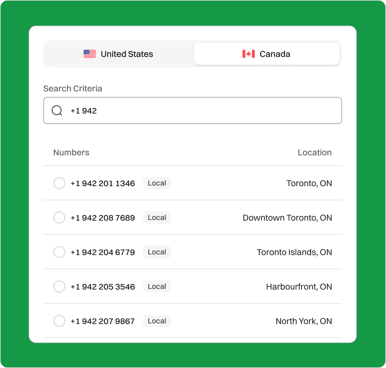 Get a 942 Area Code Local Virtual Number for Central and Northeastern Ontario Get a 942 area code virtual number for your business in Ontario. Strengthen your local presence, build customer trust, and ensure seamless communication with a dependable virtual phone number. Sign upRequest a Demo Endorsed by top industry leaders Trusted by industry experts for excellence and innovation. What is the 942 Area Code? The 942 area code is one of Canada’s newest area codes, serving parts of central and northeastern Ontario. Introduced in 2023, it acts as an overlay for the 705 and 249 area codes, covering key cities such as Barrie, Sudbury, North Bay, and Peterborough. Ontario is located in the Eastern Time Zone (ET), which is UTC-5 during standard time and UTC-4 during daylight saving time. The overlay system allows 942 to provide new phone numbers without changing existing ones, and 10-digit dialing is required for all local calls in the region. Country Canada Province Ontario Cities Barrie, Sudbury, North Bay, Peterborough Time Zone Eastern Time Zone (UTC-5 / UTC-4 DST) Telephone Number Format +1 (942) XXX-XXXX Example Phone Number +1 (942) 555-6789 Where is the 942 Area Code? The 942 area code is located in Ontario, Canada, and serves as an overlay for the existing 519 and 226 area codes. It covers southwestern Ontario, including cities such as London, Windsor, Kitchener, Waterloo, and surrounding regions. Introduced in May 2022, the 942 area code was implemented to meet the increasing demand for phone numbers driven by population growth, mobile device usage, and business expansion in the area. As an overlay, the 942 area code allows for new phone numbers to be assigned without changing existing ones, ensuring continuity for current users. With the overlay in place, 10-digit dialing (area code + phone number) is required for all calls within the region. The 942 area code ensures reliable communication across both urban and rural parts of southwestern Ontario. Whether you are a business or an individual, having a local phone number with a 942 area code helps you establish a trusted presence throughout this dynamic and expanding part of the province. A Brief History of the 942 Area Code The 942 area code was introduced in southwestern Ontario, Canada, as an overlay to the existing 519 and 226 area codes. Implemented in May 2022, its creation was driven by the rapid growth in demand for new phone numbers due to population increases, the rise in mobile devices, and expanding business needs in the region. The 519 area code, established in 1953, originally covered a large portion of southwestern Ontario, but as the area grew, the 226 overlay was added in 2006 to address number exhaustion. Despite this, continued demand led to the addition of 942 as a second overlay. This system allows for new numbers to be assigned without disrupting existing phone services. The introduction of 942 also mandated 10-digit dialing for all local calls in the region, ensuring a seamless transition while maintaining reliable communication across southwestern Ontario. How to Get a 942 Area Code Phone Number? You can purchase a 942 area code phone number from a VoIP service provider like Dialaxy. Follow these simple steps: Sign up on the official Dialaxy website or mobile app. Log in to your Dialaxy account. Search “My Number” from the “Portal” menu. Click on “Buy Number.” Choose Canada as your country and search for the 942 area code. Complete the payment and submit any required documents. How Does a 942 Area Code Business Phone Number Work? A 942 area code business phone number uses VoIP (Voice over Internet Protocol) technology to connect your company with customers throughout Ontario. Instead of relying on traditional phone lines, VoIP transmits voice and data over the internet, allowing you to operate from anywhere while maintaining a local Ontario presence. Calls can be made and received on smartphones, desktops, tablets, or VoIP phones. In addition to voice calls, your 942 number supports advanced features like call forwarding, voicemail-to-email, text messaging, and auto-attendants. These tools help streamline communication, improve customer service, and give your business a professional image in cities like Calgary and Red Deer. Whether you’re local or remote, a 942 phone number helps you build trust and expand your reach in Ontario. Dialing a 942 Number Country Code (1): Indicates Canada Area Code (942): Routes the call to Ontario Local Exchange (e.g., 555): Identifies a specific locality (e.g., London) Subscriber Number (e.g., 6789): A unique four-digit personal or business number With a 942 area code business number, you gain a flexible, cost-effective, and professional communication solution tailored to the Ontario market. Who’s Doing Business in the 942 Area Code? The 942 area code supports a wide range of industries that drive Ontario’s economy. Here’s a look at some of the region’s leading sectors: Energy & Oil Services Ontario is home to several energy companies, including Ontario Power Generation and Enbridge. These firms use 942 numbers to manage operations, logistics, and customer service across the province and beyond. Construction & Real Estate Ontario’s booming housing and commercial real estate sectors include companies like Mattamy Homes and EllisDon. They rely on 942 numbers to connect buyers, sellers, agents, and contractors in cities like Toronto, Ottawa, and Hamilton. Agriculture & Agri-Business Southern Ontario is a key agricultural region, with farms, co-ops, and agri-tech firms such as Vineland Research and Innovation Centre and Greenbelt using 942 numbers to manage supply chains and customer communications. Finance & Professional Services From accounting firms like MNP LLP to financial advisors such as Investors Group, service providers across Ontario depend on 942 numbers to handle appointments and client interactions. Healthcare & Wellness Hospitals and clinics in