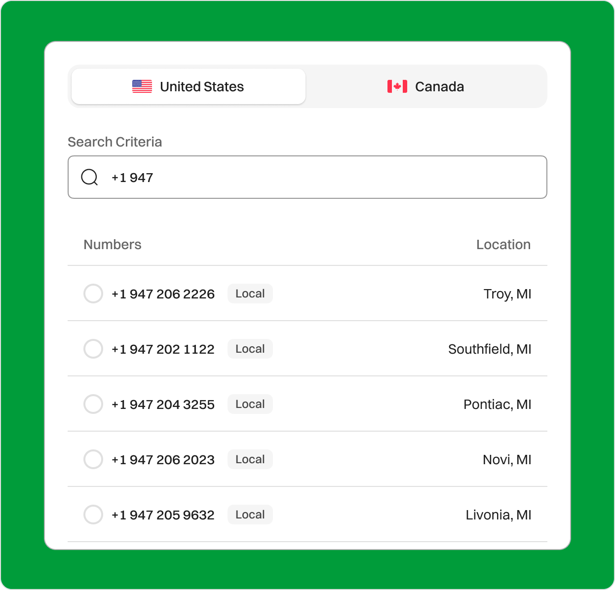 Expand Your Business Reach with a 947 Area Code in Michigan Looking to establish a presence in southeastern Michigan? A 947 area code phone number can help your business connect with clients in cities like Troy, Southfield, Farmington Hills, and Rochester Hills. Sign upRequest a Demo Endorsed by top industry leaders Trusted by industry experts for excellence and innovation. What is area code 947? Area code 947 is a telephone area code serving southeastern Michigan, primarily the Oakland County region. It overlays the 248 area code, which means both codes serve the same geographic area. Major cities and towns within this region include Southfield, Troy, Pontiac, Royal Oak, Farmington Hills, and Rochester Hills. Established in 2002 as an overlay to the 248 area code, 947 supports the growing demand for phone numbers in this economically significant region. The area is known for its diverse economy, with strengths in automotive, healthcare, technology, and education. Country USA State Michigan Major City Troy Time Zone Eastern Time Zone Telephone Number Format +1 (947)-XXX-XXXX Example of 947 phone number +1 (947)-203-4567 Zip Code 48009-48462 How to get a 947 Area Code Phone Number? You can purchase a 947 area code phone number from a VoIP service provider like Dialaxy. You can follow these steps. Sign up on the official Dialaxy website or mobile app. Log in to your account and navigate to the dashboard. Select “My Number” from the “Portal” menu. Click on “Buy Number.” Choose the US as your country and select the 947 area code from the list. Complete the payment and submit any required documents. How does a 947 Area Code Business Phone Number work? An area code 947 phone number functions like other numbers in the North American Numbering Plan (NANP). For instance: If your number is 203-4567, customers can reach you at +1 (947)-203-4567. Here’s the breakdown: Country Code (+1): Represents the United States. Area Code (947): The area codes are specific to central and northeastern Michigan. Local Exchange (e.g., 203): The exchange code for routing calls within the region. Subscriber Number (e.g.,4567): The unique subscriber number assigned to your line. Who’s doing business in the 947 Area code? The 947 area code covers parts of Oakland County and surrounding communities in Michigan, where a variety of industries fuel local growth and opportunity. Here’s a closer look at some of the key sectors and organizations driving the region’s economy: Automotive Oakland County is a significant player in Michigan’s automotive sector. Significant centers of manufacturing, supply chain, engineering, etc., activities from large organizations, such as Magna International and Lear Corporation, are located here and allow the support of global car brands. These activities create jobs and opportunities for local suppliers and service providers. Education The area, including Oakland University and Lawrence Technological University, draws thousands of students and staff to the area, while helping to stimulate research and development and training, and introducing the area's workforce. Local companies also create educational partnerships and project development, including internships for students and access to talent pipelines. Healthcare The area is also served by leading healthcare systems, such as Beaumont Health and Henry Ford Health System, which provide quality care to residents in the 947 area code. These services are large employers, utilizing health care professionals and support staff in large hospitals and clinics. Retail and Tourism Destination locations in the area, including Downtown Royal Oak and Great Lakes Crossing Outlets, attract visitors from all parts of Michigan and beyond for dining, shopping, and entertainment. While the available shopping and dining contribute to the local spending economy, they also provide opportunities for local businesses, stakeholders, and entrepreneurs. The combination of these industries creates the vibrant business environment of the 947 area code and a place that attracts new companies and supports the existing development in Oakland County. Why Does Your Business Need a 947 Area Code Number? Look Local and Build Trust When you have an area code 947 number, it helps your business establish a local presence, especially in the diverse and vibrant suburban communities of southeast Michigan. A local area code gives your business a more familiar and trustworthy feel to the community. People are more likely to relate to and utilize businesses they think are based in the same area. This scope helps build credibility. Tap into Successful Urban Markets The area code 947 is not just limited to local areas; it connects to successful cities like Troy, Southfield, and Novi, which are all very active business locations. They include consumers of wealth, as well as numerous businesses of all sizes, from the nascent startup stage to large corporations. Having a 947 area code allows you to tap into these urban markets, bringing your business to a promising area of the country. Affordable Communication Solutions An area code 947 number using VoIP technology provides a host of benefits for dominating communication at an affordable cost. Businesses have access to state-of-the-art communication features such as virtual receptionists, forwarding calls, detailed call analysis, and companies can do this without the excessive and expensive analog or digital phone systems that waste a lot of money. Enhance Branding with Vanity Numbers If your business has a 947 area code, it will be easier to build a brand with vanity numbers such as 947-TECH or 947-MOVERS. Vanity phone numbers are easy to remember and catchy enough for customers to remember them instantly, giving your business the advantage over competitors. When it is easy for people to remember your number, it makes it that much more likely they are going to reach out to use your services. Create a Consistent Brand