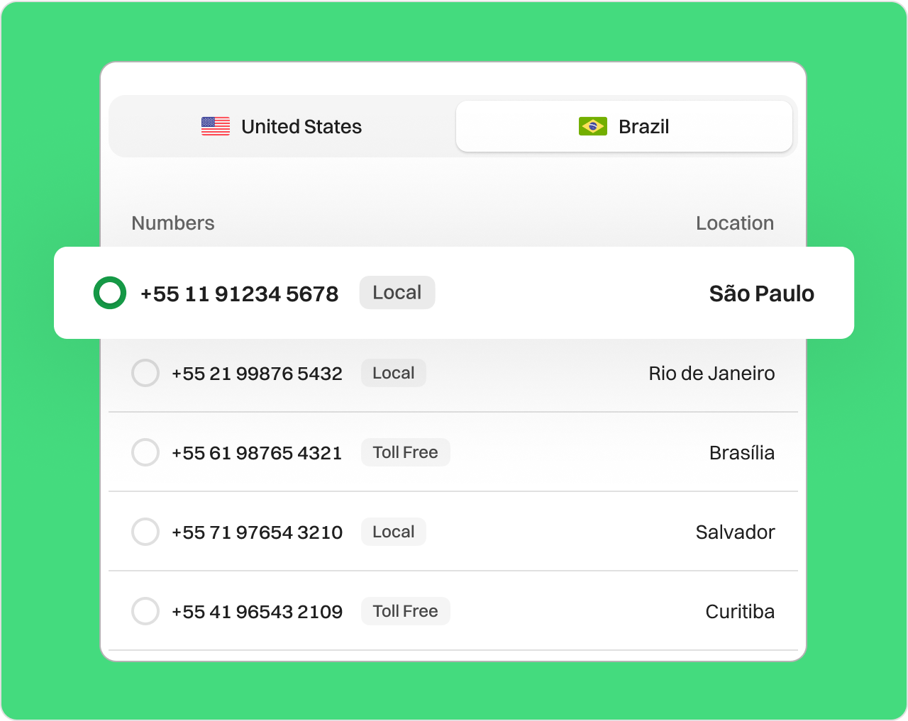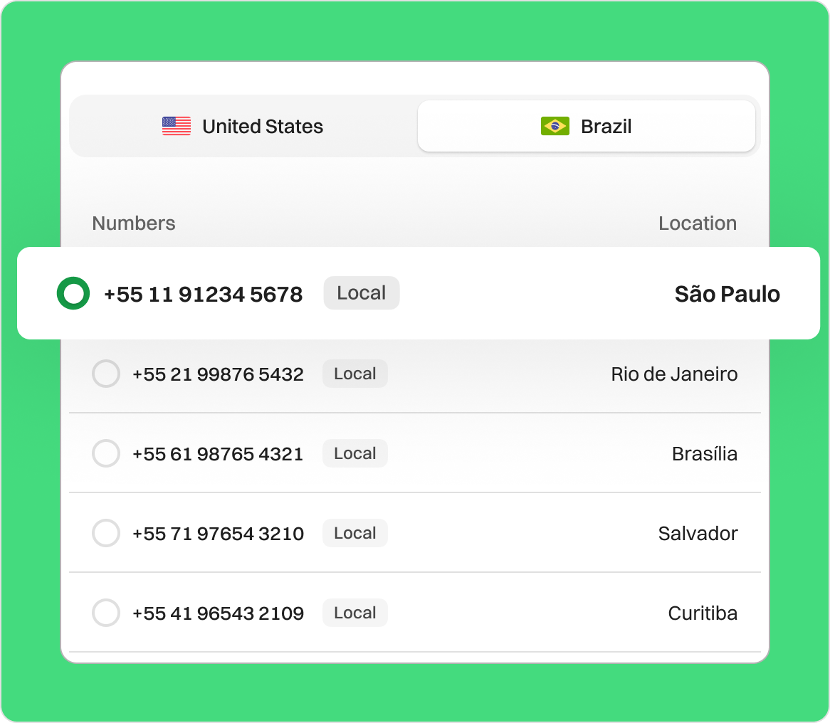 Activate Your Brazil Virtual Phone Number Online Looking to expand your reach in Brazil or stay connected with local customers? Now’s the perfect time to move to the cloud. Getting a Brazil virtual phone number online is a smart move for both personal use and growing businesses. Register through the official website or mobile app. Monitor, record, and manage incoming calls instantly. Set up your Brazil virtual number to forward calls to any device worldwide. Sign upRequest a Demo Endorsed by top industry leaders Trusted by industry experts for excellence and innovation. How to Buy a Brazil Virtual Number from Dialaxy You can easily get a virtual number with a Brazilian area code (like São Paulo’s 11 or Rio de Janeiro’s 21) using a VoIP provider. Dialaxy makes the process quick and reliable. Here’s how to get started: Sign up via the official website or mobile app. Log in with your credentials to access the dashboard. Click the “My Number” option under the “Portal” menu. Select the “Buy Number” option. Select “Brazil” as your country and pick the area code you need. Complete your payment and upload any required identification documents. What Is a Brazil Virtual Phone Number? A Brazil virtual number is a cloud phone number. It works like a normal landline or mobile number in Brazil. But it’s not tied to a fixed location or physical line, so you can carry remote communication easily. It uses VoIP technology. That means you can call and text using the internet. No SIM card needed. Brazilian numbers look like this: +55 (country code) + two-digit area code + local number. For example, +55 11 91234-5678 is a mobile number in São Paulo. How Do Brazil Virtual Numbers Work? Brazil virtual numbers don’t need traditional phone lines. Instead, they send your voice as data over the internet. When someone calls your number, their voice is converted to digital data. This data travels through the internet to your device. It turns back into audio so you hear the call clearly. You can answer calls on your mobile phone, laptop, or VoIP desk phone. Wherever you are, you stay connected. Why Buy a Brazil Virtual Phone Number from Dialaxy? Easy Setup, No Hassle Whether you need a number for family calls or want to grow your business in Brazil, Dialaxy makes it quick. Choose your area, connect your device, and start right away. Appear Local, Build Trust With a local virtual number Calls from local codes like 21 (Rio de Janeiro) or 31 (Belo Horizonte) feel familiar. Customers and contacts see you as local, even if you work from abroad. Simple Number Selection Pick Brazil as your country, then browse area codes and numbers. Whether you want one city code or several, finding the right number is easy. Share Instantly Once active, share your number with customers, family, or colleagues. They can call or text you directly. Calls come straight to your mobile or VoIP device. Affordable Local Rates Dialaxy offers fair prices compared to other providers. Brazil virtual numbers for calls and SMS start at about R$50 per month, depending on features and location. Trusted Presence in Brazil Having a local number helps your brand connect with people across Brazil. It improves marketing results and customer support in cities like São Paulo, Curitiba, Salvador, and more. Enjoy 100+ Dialaxy’s features with local phone number Call, SMS, & Contact in one easy to use app. Phone Numbers Global Calling SMS Voicemail Number Sharing Contacts All Features Phone Numbers Expand your reach with Virtual Phone Numbers International Numbers: Establish a local presence of your business with our international phone numbers . Toll Free Numbers: Elevate your sales strategy and drive business growth with Toll Free Numbers. Multiple Phone Numbers: Use multiple phone numbers in one single dashboard. Learn More Global Calling Connect globally with effortless calls Extended Reach: Enables businesses to expand their market by reaching international customers. Flexibility: Allows employees to make international calls from anywhere. Seamless Communication: Ensures clear and reliable communication with international contacts. Learn More SMS Enhance communication with SMS capabilities A2P 10DLC: Register your number in A2P 10DLC to send sms within US and Canada. Schedule SMS: Schedule SMS as per your customer timezone so they don’t miss an update. Personalised Messaging: Personalise SMS depending upon your user and its behaviour. Learn More Voicemail Easily manage messages with Voicemail Voicemail Recording: Personalized voicemail greetings for different departments Message Management: Messages are stored in the cloud, allowing for easy access. Access and Playback: Listen to voicemails from any internet-connected device. Learn More Number Sharing Enhance collaboration with effortless Number Sharing Unified communication: With number sharing, multiple devices can use the same phone number. Convenience: Seamlessly switch between devices without missing calls or texts. Cost Efficiency: Reduce costs by eliminating the need for multiple phone plans. Learn More Contacts Effortlessly manage your contacts Add and delete contact: Add and delete new contacts as the business grows. Centralized Information: Stores all relevant contact details in one place, making it easy to access and manage. Improved Organization: Helps organize contacts into groups or categories, enabling better management. Learn More Frequently Asked Questions Can I port(transfer) my existing Brazilian mobile or landline number to a virtual phone service?Yes, ANATEL allows number portability in Brazil. You can keep your current number when switching to Dialaxy. The process takes a few business days and needs approval. Are Brazilian virtual phone numbers compatible with SMS and WhatsApp verification?Most virtual numbers support SMS messages. WhatsApp may not How stable is VoIP call quality in Brazil, especially outside major cities?Cities like São Paulo have good i