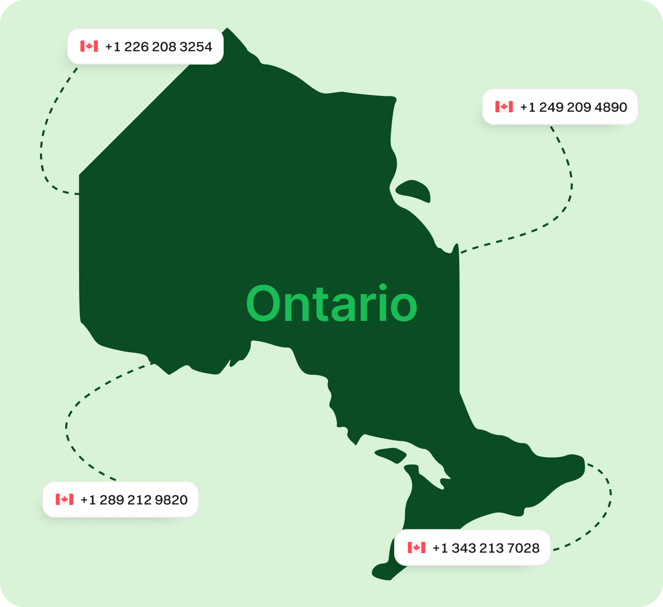 Get an Ontario Virtual Phone Number Today! Secure an Ontario virtual phone number to build a strong local identity and boost customer confidence. Cut down on long-distance charges, streamline your communications, and stay accessible from anywhere—no physical office in Ontario required. Sign upRequest a Demo Endorsed by top industry leaders Trusted by industry experts for excellence and innovation. What is an Ontario Phone Number? An Ontario virtual phone number uses cloud technology to transmit calls over the Internet rather than traditional phone lines. When someone calls your Ontario number, their voice is digitized, sent through the web, and reassembled in real time—delivering smooth, reliable conversations. This modern solution helps businesses handle calls efficiently while enhancing customer experience. Ontario virtual phone numbers eliminate the need for legacy phone hardware and work seamlessly on apps, computers, or dedicated VoIP devices. How Does an Ontario Virtual Phone Number Work? Ontario virtual phone numbers operate through internet-based systems to process calls. When someone dials your number, their voice is converted into data packets, transmitted online, and turned back into audio at the other end. This digital process ensures clear, real-time communication without the limits of standard phone lines. With this setup, your business can manage calls more flexibly while projecting a professional Ontario presence. Use your Ontario number on mobile apps, VoIP phones, or desktop platforms—no bulky equipment needed. How to Make the Most of Ontario Phone Numbers Make & Receive Calls Send & Receive Texts Keep Work & Personal Separate Establish Local Presence Boost Marketing Efforts Make & Receive Calls Handle customer calls with a local Ontario number to enhance your local appeal. Get Started Send & Receive Texts Communicate via SMS with clients across Ontario for quick, convenient updates. Get Started Keep Work & Personal Separate Use your Ontario number exclusively for business to maintain privacy. Get Started Establish Local Presence Build trust with Ontario customers using a familiar area code, even remotely. Get Started Boost Marketing Efforts Ontario numbers give your campaigns a local edge, increasing response rates. Get Started Specific Area Codes for Ontario Area Code Region Covered 226 Southwestern Ontario, including Windsor and London 249 Overlay for northeastern and central Ontario, including Sudbury 289 Overlay for Golden Horseshoe region 343 Overlay for eastern Ontario, including Ottawa 416 Downtown Toronto 437 Overlay for Toronto 519 Southwestern Ontario, including Kitchener, Windsor 613 Eastern Ontario, including Ottawa and Kingston 647 Overlay for Toronto 705 Central and northeastern Ontario, including Barrie 807 Northwestern Ontario, including Thunder Bay 905 Greater Toronto Area, excluding Toronto proper Why Choose Dialaxy for an Ontario Virtual Phone Number? Flexible Plan Options Multiple pricing tiers tailored to your business or personal needs. Select only the features you require. Quick Setup Process Get started in minutes with a straightforward setup—no hardware or technical expertise necessary. Scalable for Growth Easily add more Ontario numbers as your business expands, ensuring you stay connected. 24/7 Customer Assistance Round-the-clock support for technical issues or general queries—so you’re never left waiting. Advanced Call Tools Access features like voicemail-to-email, call routing, and analytics to boost productivity. Budget-Friendly Pricing Enjoy top-tier service at a competitive price point, with no hidden fees. How to Get an Ontario Number for Your Business Step 1 Create an Account Sign up on the virtual phone number provider’s website using your email or preferred credentials. Step 2 Navigate to "Add New Number" Access your dashboard and select the “Add New Number” option. Step 3 Choose Canada and Select Ontario Select Canada as your country, then pick Ontario and your desired area code. Step 4 Pick Your Ontario Number Browse available Ontario numbers and choose the one that fits your needs. Step 5 Make Payment and Verify Details Complete your purchase and confirm your account information. Step 6 Activate and Start Using Your Number Once activated, your Ontario virtual number is ready for immediate use. Explore More Provinces Alberta British Columbia Manitoba New Brunswick Newfoundland Nova Scotia Northwest Territories Nunavut Prince Edward Island Quebec Saskatchewan Yukon View all Frequently Asked Questions What is an Ontario virtual phone number?It’s a cloud-based virtual number with an Ontario area code, allowing you to make and receive calls online rather than through traditional phone lines. Can I pick a specific Ontario area code?Yes. When registering with Dialaxy, you can choose from available area codes like 416, 613, 905, 289, 807, and others. Do I have to be in Ontario to use the number?No, you can use your Ontario virtual phone number from anywhere with an internet connection. How much does an Ontario VoIP number cost?Pricing depends on features and the provider. Dialaxy offers affordable plans with no hidden fees. Can I text from my Ontario VoIP number?Yes, most Ontario virtual numbers support SMS for easy customer communication. Is number porting available?Absolutely. You can transfer your existing Ontario number to Dialaxy without hassle.