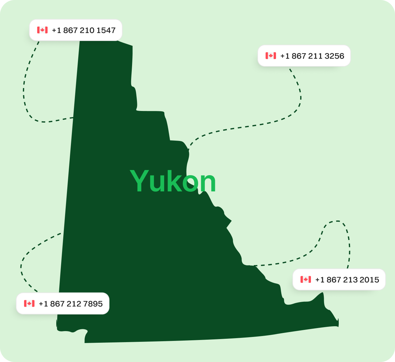 Get a Yukon Virtual Phone Number Today! Establish a reliable local presence in Yukon with a virtual phone number. Whether you’re expanding your business or supporting clients in the territory, a Yukon VoIP number helps reduce communication costs, enhances customer trust, and allows you to stay connected from anywhere, without needing a physical location in Yukon. Sign upRequest a Demo Endorsed by top industry leaders Trusted by industry experts for excellence and innovation. What is a Yukon Phone Number? A Yukon virtual phone number is a cloud-based telephone number that uses internet technology (VoIP) instead of traditional landlines. It comes with a local Yukon area code and allows you to make and receive calls from any device, anywhere in the world. These virtual numbers are perfect for businesses that want to reach Yukon residents or project a local identity without setting up a physical office. All you need is an internet connection—no cables, phone jacks, or legacy hardware. How Does a Yukon Virtual Phone Number Work? Yukon virtual phone numbers operate over the internet using VoIP (Voice over Internet Protocol). When someone calls your number, their voice is digitized into data packets, securely transmitted online, and then converted back into voice on your device. This technology provides high-quality, real-time communication whether you’re using a desktop app, mobile phone, or VoIP device. Calls can be routed to your team anywhere in the world, enabling you to provide support or do business in Yukon efficiently, without being physically there. How to Make the Most of Yukon Phone Numbers Make & Receive Calls Send & Receive Texts Keep Work & Personal Separate Establish Local Presence Boost Marketing Efforts Make & Receive Calls Use a local Yukon number to appear accessible and customer-friendly. Get Started Send & Receive Texts Communicate with Yukon customers instantly via SMS for fast service. Get Started Keep Work & Personal Separate Use your Yukon number for business purposes to stay organized and professional. Get Started Establish Local Presence Build trust with a recognizable Yukon area code—even if your team is remote. Get Started Boost Marketing Efforts Local numbers make your campaigns more relatable and engaging for Yukon residents. Get Started Specific Area Code for Yukon Area Code Region Covered 867 Covers all three northern territories: Yukon, Northwest Territories, and Nunavut Why Choose a Yukon Virtual Phone Number Provider? Flexible Plans Choose the features and pricing that match your business needs. Fast Setup Activate your Yukon number in minutes—no complex installation needed. Scalable Solutions Easily add more 867 numbers as your team grows. 24/7 Support Get help anytime with setup, technical issues, or account management. Advanced Call Features Includes voicemail-to-email, call forwarding, auto-attendants, analytics, and more. Cost-Effective Enjoy premium communication tools without premium pricing. How to Get a Yukon Number for Your Business Step 1 Create an Account Sign up on the virtual phone number provider’s website using your email or preferred credentials. Step 2 Navigate to "Add New Number" Access your dashboard and select the “Add New Number” option. Step 3 Choose Canada and Select Yukon Select Canada as your country, then pick Yukon and your desired area code. Step 4 Pick Your Yukon Number Browse available Yukon numbers and choose the one that fits your needs. Step 5 Make Payment and Verify Details Complete your purchase and confirm your account information. Step 6 Activate and Start Using Your Number Once activated, your Yukon virtual number is ready for immediate use. Explore More Provinces Alberta British Columbia Manitoba New Brunswick Newfoundland Saskatchewan Northwest Territories Nunavut Ontario Prince Edward Island Quebec Nova Scotia View all Frequently Asked Questions What is a Yukon virtual phone number?A Yukon virtual phone number is a VoIP-based number with the 867 area code that works over the internet, not traditional landlines. Can I choose area code 867 when signing up?Yes, most providers let you select a specific area code, including 867 for Yukon. Do I need to be in Yukon to use this number?No, you can use your Yukon number from anywhere in the world with an internet connection. Can I send texts using my Yukon number?Yes, many virtual phone providers support SMS functionality for area code 867 numbers. How much does a Yukon virtual number cost?Pricing varies by provider and features, but most offer affordable and flexible plans. Can I port my existing Yukon number?In most cases, yes. Many providers support number porting from your current service.