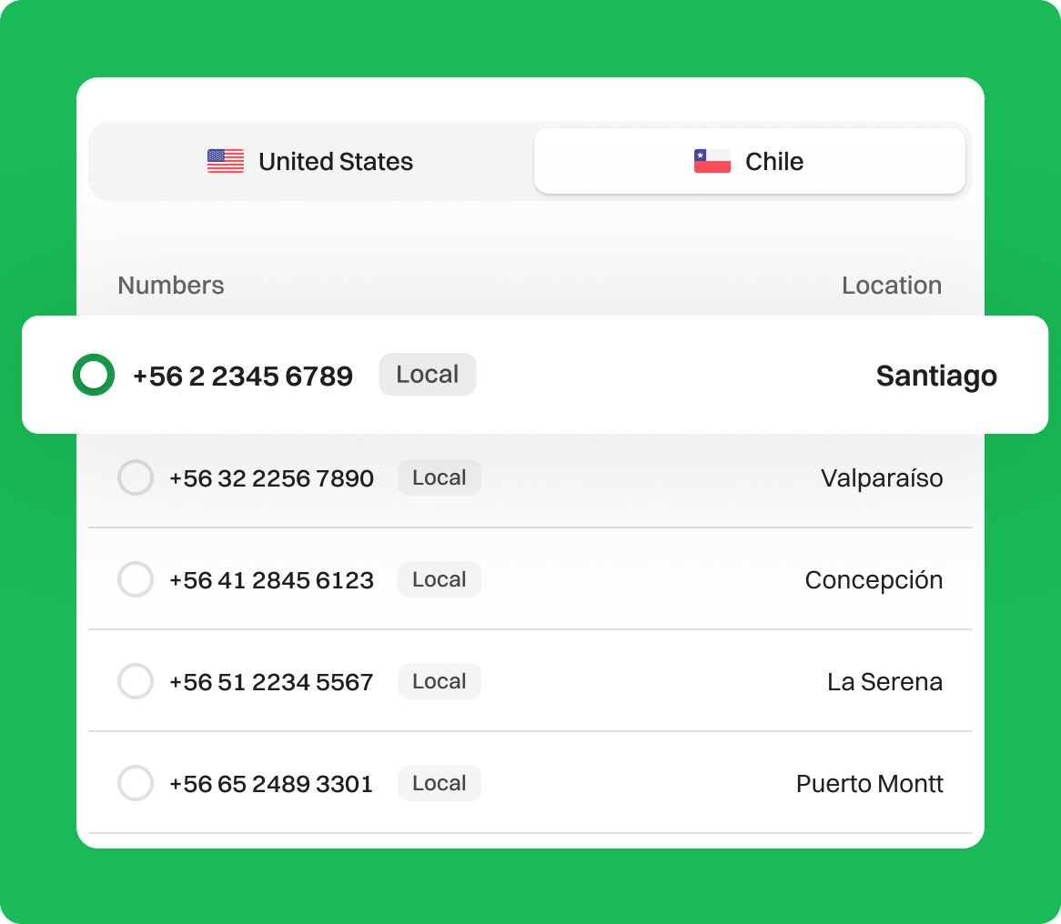 Get Chile Virtual Phone Number Online Want a Chile virtual phone number for your business? There’s never been a better time to move to the cloud. A Chile virtual phone number is a smart solution for both personal and professional use. Sign up easily through the official website or mobile app. Track, record, and handle incoming calls in real-time. Configure your Chile virtual number to forward calls to any device, anywhere in the world. Sign upRequest a Demo Endorsed by top industry leaders Trusted by industry experts for excellence and innovation. How to Buy a Chile Virtual Number from Dialaxy? If you’re in need of a Chilean virtual phone number, Dialaxy offers a straightforward solution. To acquire your number, simply follow these steps for a seamless purchasing process: Sign up via the official website or mobile app. Log in with your credentials to access the dashboard. Click the “My Number” option under the “Portal” menu. Select the “Buy Number” option. Select “Chile” as the country and choose your preferred Chilean area code. Complete your payment and upload any required identification documents. What is the Chile Virtual Phone Number? A Chile virtual phone number is a telephone number that is not tied to a physical location. Instead, it operates over the internet using VoIP (Voice over Internet Protocol) technology. This allows users, whether individuals or businesses, to make and receive calls from anywhere in the world, as long as they have an internet connection. These numbers resemble standard Chilean phone numbers, featuring local area codes. However, they offer greater flexibility and features compared to traditional landlines. With a Chile virtual number, your business can appear local even if you’re based remotely. Chile virtual numbers follow a local number format, beginning with the country code +56, followed by an area code (1-2 digits) and a 7-8 digit subscriber number, depending on the region. Numbers can be set up for major cities like Santiago, Valparaíso, and Concepción. How Does a Chile Phone Number Work? Chile virtual phone numbers operate entirely over the internet, eliminating the need for physical phone lines or hardware at your location. All you need is an internet connection. Unlike traditional phones that rely on physical infrastructure, virtual phone systems use VoIP (Voice over Internet Protocol) technology. When a customer calls your Chile virtual phone number, the voice is instantly converted into digital data packets. These packets are transferred over the Internet and reassembled into sound at the recipient’s end. This process occurs in real time, so the person you’re speaking to hears you just as clearly and immediately as they would on a regular phone call. Why Buy Local Chile Phone Numbers From Dialaxy? Build Trust with a Local Presence It is in human nature to prefer familiarity. Customers tend to answer calls and do business with companies that use familiar and local area codes. A Chile virtual phone number makes your business appear local, even if you are based elsewhere. This boosts credibility and improves connection rates with local clients. Save on Communication Cost International phone lines can be expensive. With Dialaxy’s Chile virtual numbers, both you and your customers can save money on communication. Calls are routed over the internet using VoIP technology, reducing long-distance charges but still maintaining high call quality. Quick Setup, No Physical Equipment There is no need for physical infrastructure. Dialaxy virtual numbers work via the cloud and can be activated instantly. All you need is an internet connection to start making and receiving calls from anywhere in the world. Flexible Call Routing to Any Device Dialaxy allows you to forward calls to mobile phones, landlines, or softphones, wherever your team is located. Whether you are working from an office, remotely, or across different time zones, your Chilean number will reach your desired person without interruption. Easily Scalable for Growing Teams You could be a solo entrepreneur entering the Chilean market or a growing business expanding across regions like Santiago, Concepción, or Antofagasta. Dialaxy makes it simple to add new numbers and users as needed, without additional infrastructure. Professional Features to Enhance Customer Experience Your Chile virtual number comes with powerful business features, such as voicemail-to-email, auto-attendants, call recording, call routing, and call analytics. These features enable uninterrupted and 24/7 communication for customers, enhancing their experience with your company. Enjoy 100+ Dialaxy’s features with local phone number Call, SMS, & Contact in one easy to use app. Phone Numbers Global Calling SMS Voicemail Number Sharing Contacts All Features Phone Numbers Expand your reach with Virtual Phone Numbers International Numbers: Establish a local presence of your business with our international phone numbers . Toll Free Numbers: Elevate your sales strategy and drive business growth with Toll Free Numbers. Multiple Phone Numbers: Use multiple phone numbers in one single dashboard. Learn More Global Calling Connect globally with effortless calls Extended Reach: Enables businesses to expand their market by reaching international customers. Flexibility: Allows employees to make international calls from anywhere. Seamless Communication: Ensures clear and reliable communication with international contacts. Learn More SMS Enhance communication with SMS capabilities A2P 10DLC: Register your number in A2P 10DLC to send sms within US and Canada. Schedule SMS: Schedule SMS as per your customer timezone so they don’t miss an update. Personalised Messaging: Personalise SMS depending upon your user and its behaviour. Learn More Voicemail Easily manage messages with Voicemail Voicemail Recording: Personalized voicemail greetings for different departments Message Management: Messages are stored in the cloud,