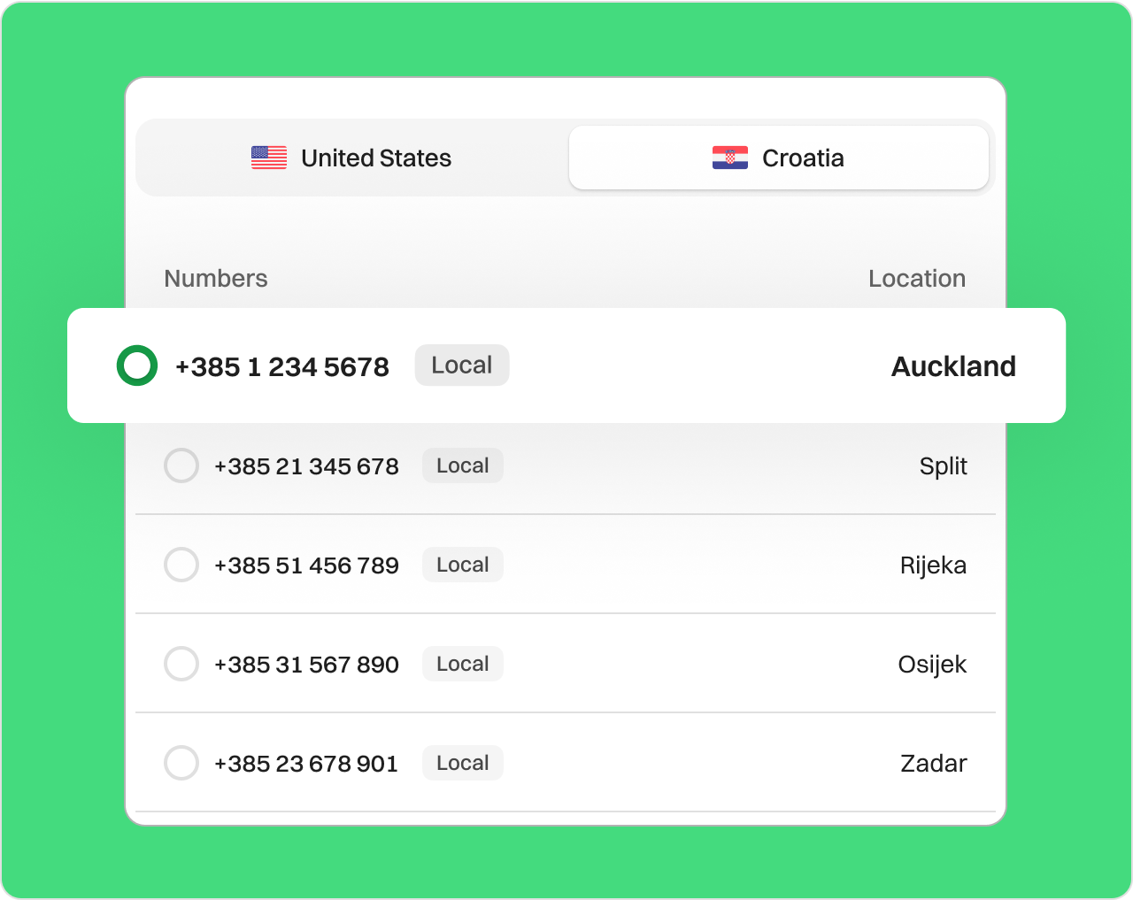 Get Croatia Virtual Phone Number Online Need a Croatia phone number for texts or business calls? These days, everything’s online, so having a virtual Croatia number just makes life easier. Whether you’re running a business or signing up for services, it’s a simple way to stay connected without actually being in Croatia. Sign up using the official website or mobile app. Track, record, and manage incoming calls in real-time. Configure your Croatia virtual number to redirect calls to any device globally. Sign upRequest a Demo Endorsed by top industry leaders Trusted by industry experts for excellence and innovation. How to Buy a Croatia Virtual Number from Dialaxy? You can obtain a Croatia virtual phone number through various VoIP service providers. Dialaxy is a reliable and trusted option for securing Croatia virtual numbers. Just follow the easy steps below to secure your Austrian virtual number and start using it immediately. Sign up via the official website or mobile app. Log in with your credentials to access the dashboard. Click the “My Number” option under the “Portal” menu. Select the “Buy Number” option. Choose “Croatia” as the country and select the desired Croatian area code from the list. Make payment and submit necessary documents if necessary. What is the Croatia Virtual Phone Number? A Croatia virtual phone number is a cloud-based phone number that works just like a landline number. It uses VoIP technology to let you make and receive calls and messages over the internet without needing a SIM card. Croatia phone numbers begin with the country code +385, followed by a 1 or 2-digit area code, and then the subscriber number. Virtual numbers follow this same format, providing a genuine Croatian number that functions exactly like any local phone number. Though virtual, these numbers offer features, including call forwarding, SMS/MMS, and voicemail. They also often come with advanced tools such as call monitoring, recording, and seamless integration with business communication systems. How does a Croatia Phone Number Work? A Croatia virtual phone number uses internet-based technology to handle calls, rather than relying on traditional phone lines. This allows you to make and receive calls from anywhere in the world using your preferred device. Here’s how it works: 1. Select Your Croatia Number Select a virtual number with a Croatian area code, such as Zagreb (1) or Split (21), through your VoIP provider. It gives your number a local identity and builds trust with regional contacts. 2. Connect via Internet-Enabled Device Use your smartphone or computer to place and receive calls. All you need is an internet connection and access to your provider’s app or dashboard. 3. Voice becomes Digital Instantly When you place a call, your voice is converted into digital data using VoIP (Voice over Internet Protocol) technology. 4. Data Travels Over the Internet The data packets are securely transmitted over the Internet to the recipient. This ensures efficient, long-distance communication without relying on traditional telephone infrastructure. 5. Reassembled into Audio The data packets are reassembled and converted back into sound. The recipient hears your voice just as clearly as they would through a regular phone line. 6. Real-Time Communication The entire process happens instantly, just like a regular phone call. This enables smooth conversations without noticeable delays or interruptions. Why buy Local Croatia Phone Numbers from Dialaxy? Easy Setup Get a Croatian number within minutes. No new device needed, just sign up, choose your region, and start making calls with voicemail included for missed messages. Global Access Dialaxy’s Croatia virtual phone numbers work worldwide. Make and receive calls from anywhere with an internet connection while maintaining a local Croatian presence. Flexible Number Options Select from a wide range of Croatian area codes, including multiple number options to suit personal and business needs. Affordable Pricing Enjoy cost-effective plans starting from just $10/month for both SMS and voice services. Ideal for startups, freelancers, and global teams. Boost Business Credibility Establish a strong local presence in Croatia, improve customer engagement, and run location-targeted marketing campaigns with ease. Reliable Customer Support Dialaxy offers dedicated and responsive customer support to assist you with setup, troubleshooting, and any inquiries, ensuring a smooth and hassle-free experience. Enjoy 100+ Dialaxy’s features with local phone number Call, SMS, & Contact in one easy to use app. Phone Numbers Global Calling SMS Voicemail Number Sharing Contacts All Features Phone Numbers Expand your reach with Virtual Phone Numbers International Numbers: Establish a local presence of your business with our international phone numbers . Toll Free Numbers: Elevate your sales strategy and drive business growth with Toll Free Numbers. Multiple Phone Numbers: Use multiple phone numbers in one single dashboard. Learn More Global Calling Connect globally with effortless calls Extended Reach: Enables businesses to expand their market by reaching international customers. Flexibility: Allows employees to make international calls from anywhere. Seamless Communication: Ensures clear and reliable communication with international contacts. Learn More SMS Enhance communication with SMS capabilities A2P 10DLC: Register your number in A2P 10DLC to send sms within US and Canada. Schedule SMS: Schedule SMS as per your customer timezone so they don’t miss an update. Personalised Messaging: Personalise SMS depending upon your user and its behaviour. Learn More Voicemail Easily manage messages with Voicemail Voicemail Recording: Personalized voicemail greetings for different departments Message Management: Messages are stored in the cloud, allowing for easy access. Access and Playback: Listen to voicemails from any internet-connected device. Learn More Nu