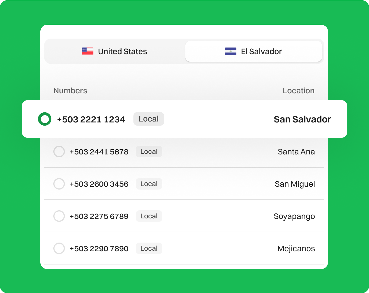 Get an El Salvador Virtual Phone Number Online Need a Business Phone Number in El Salvador? You’re not alone. Most businesses are going virtual today.If you’re looking to connect with customers in El Salvador, getting a cloud-based phone number is a smart move.Perfect for business or personal use, your virtual number keeps you local in El Salvador. Sign up in minutes. Register through the official website or mobile app. Instantly monitor, record, and manage your incoming calls from a single dashboard. Set up your El Salvador virtual phone number to forward calls to any device worldwide. Sign upRequest a Demo Endorsed by top industry leaders Trusted by industry experts for excellence and innovation. How to Buy an El Salvador Virtual Number from Dialaxy? Getting started is easy with Dialaxy. Just follow these simple steps: Sign up via the official website or mobile app. Log in with your credentials to access the dashboard. Click the “My Number” option under the “Portal” menu. Select the “Buy Number” option. Choose “El Salvador” as the country and select your desired area or region from the list. Complete your payment and upload any required identification documents. What is the El Salvador Virtual Phone Number? Think of it like a regular number, but smarter. An El Salvador virtual phone number works just like a local landline or mobile phone number, but it is not tied to any physical location. Instead, it runs on the internet using VoIP (Voice over Internet Protocol) technology. That means you can make and receive calls from anywhere, on your smartphone, laptop, or even your desktop while you are online. You could be in any part of the world, but you remain connected to your customers. These numbers usually start with +503, just like any local Salvadoran number. To your callers, it feels like you’re right next door, even if you’re halfway across the globe. How Does an El Salvador Phone Number Work? It’s simpler than you think! Unlike traditional phones that rely on physical infrastructures, El Salvador virtual numbers run entirely over the internet. All you need is a stable connection. Here’s what happens when you make a call: Your voice gets transformed into tiny digital packets that travel through the internet. Then, these packets are converted back into clear sound on the recipient’s end. The best part? The whole process happens so fast that your conversation feels just like a normal phone call, crisp, smooth, and in real-time. No bulky equipment, only smooth, uninterrupted communication wherever you are. Why Buy Local El Salvador Phone Numbers from Dialaxy? Trusted Local Presence When customers see your Salvadoran local phone number, it instantly develops a sense of familiarity and trust. It makes your business feel closer and more approachable. Global Access With a Dialaxy El Salvador virtual number, you are not tied down to a specific location; you can connect as if you were there in El Salvador. No Equipment Needed Dialaxy’s cloud-based system requires no physical infrastructure. All you need is an internet connection and a compatible device, and you are ready to go. Budget Calling Dialaxy uses VoIP technology, and you can enjoy every call for a fraction of the cost. This means you reduce your phone bills while still maintaining clear call quality. Smart Features You can access advanced features, including global calling, call forwarding, voicemail-to-email, and call routing. These tools help you run your business smartly. Scalable Solution Dialaxy scales with you. You can add more numbers or users effortlessly whenever your team grows or you want to cover different Salvadoran regions. Enjoy 100+ Dialaxy’s features with local phone number Call, SMS, & Contact in one easy to use app. Phone Numbers Global Calling SMS Voicemail Number Sharing Contacts All Features Phone Numbers Expand your reach with Virtual Phone Numbers International Numbers: Establish a local presence of your business with our international phone numbers . Toll Free Numbers: Elevate your sales strategy and drive business growth with Toll Free Numbers. Multiple Phone Numbers: Use multiple phone numbers in one single dashboard. Learn More Global Calling Connect globally with effortless calls Extended Reach: Enables businesses to expand their market by reaching international customers. Flexibility: Allows employees to make international calls from anywhere. Seamless Communication: Ensures clear and reliable communication with international contacts. Learn More SMS Enhance communication with SMS capabilities A2P 10DLC: Register your number in A2P 10DLC to send sms within US and Canada. Schedule SMS: Schedule SMS as per your customer timezone so they don’t miss an update. Personalised Messaging: Personalise SMS depending upon your user and its behaviour. Learn More Voicemail Easily manage messages with Voicemail Voicemail Recording: Personalized voicemail greetings for different departments Message Management: Messages are stored in the cloud, allowing for easy access. Access and Playback: Listen to voicemails from any internet-connected device. Learn More Number Sharing Enhance collaboration with effortless Number Sharing Unified communication: With number sharing, multiple devices can use the same phone number. Convenience: Seamlessly switch between devices without missing calls or texts. Cost Efficiency: Reduce costs by eliminating the need for multiple phone plans. Learn More Contacts Effortlessly manage your contacts Add and delete contact: Add and delete new contacts as the business grows. Centralized Information: Stores all relevant contact details in one place, making it easy to access and manage. Improved Organization: Helps organize contacts into groups or categories, enabling better management. Learn More Frequently Asked Questions Is an El Salvador virtual number suitable for international business?Yes. If you are expanding into Central America or want to serve Salvadoran c