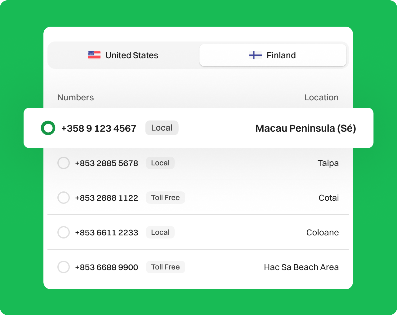 Get a Finland Virtual Phone Number Online Looking for a business phone number in Finland? These days, everything’s going digital. Whether you’re starting a business, staying in touch with people in Finland, or just want to keep things simple, a virtual Finland number can make life a lot easier. Register through the official website or mobile app. Monitor, record, and manage all incoming calls instantly. Forward your Finland virtual number to any device worldwide. Sign upRequest a Demo Endorsed by top industry leaders Trusted by industry experts for excellence and innovation. How to buy a Finland Virtual Number from Dialaxy? A Finland virtual phone number can be easily obtained through any reputable VoIP service provider. Dialaxy is one of the most trusted platforms for acquiring Finland virtual numbers. To get started, follow these simple steps: Sign up via the official website or mobile app. Log in with your credentials to access the dashboard. Click the “My Number” option under the “Portal” menu. Select the “Buy Number” option. Choose “Finland” as the country and select the desired Finland area code from the list. Make payment and submit necessary documents if necessary. What is the Finland Virtual Phone Number? The Finland virtual phone number is a cloud-based number that appears to be a regular mobile or landline phone number. It is not associated with any physical address or conventional phone line. Finland virtual phone numbers begin with the country code +358, followed by a local area code (such as 9 for Helsinki, 2 for Turku, or 3 for Tampere) and the 7-digit subscriber number. The +358 code is vital for international connectivity, as it routes calls through the Finland telecommunications network. This setup allows businesses and individuals to create a local presence in Finland, even if they’re based somewhere else. When you’re working remotely or expanding internationally, a Finland virtual number lets you stay connected. Many providers support phone number porting, making the switch to a virtual setup simple and stress-free. How does a Finland phone number work? A Finland virtual phone number leverages internet technology to manage calls rather than relying on conventional phone lines. This allows you to make and receive calls from anywhere, using the device of your choice. Here’s how it works: 1. Select Your Finland Number Select a virtual number with a Finland area code, such as Helsinki (09) or Espoo (020), through your VoIP (Voice Over Internet Protocol) provider. It gives your number a local identity and builds trust with regional contacts. 2. Connect Using an Internet-Enabled Device Use your smartphone, computer, or any internet-connected device to place and receive calls. All you need is a stable internet connection and access to your provider’s app or platform. 3. Voice Digitized Instantly When you make a call, your voice is converted into digital data packets via VoIP technology. 4. Data Travels Over the Internet These data packets are transmitted securely over the internet to the recipient, bypassing traditional copper wire phone lines. 5. Data Reassembled into Audio On the recipient’s end, the data packets are converted back into sound waves, allowing them to hear your voice clearly. 6. Real-Time Communication This entire process happens instantly, enabling smooth, natural conversations just like on a regular phone call. Why buy local Finland phone numbers from Dialaxy? Easily Get a Finland Number Whether it’s for work or personal use, getting a Finland phone number doesn’t have to be complicated. With Dialaxy, you can keep your current phone, choose the region you want, and get started in just a few minutes. Your Calls Feel Local When people see a familiar Finland number, they’re more likely to pick up. With a local virtual number, your calls look like they’re coming from within Finland. This helps you build trust and stay connected, even if you’re miles away. Fast and Flexible Number Selection Just choose your country and region, and you’ll get a list of available numbers. Want something easy to remember, or need more than one line? You’ve got options, and setting it up is a breeze. Share the number right away Once your number’s ready, you can share it with friends, clients, or coworkers instantly. They can call, text, or leave a voicemail just like they would with any regular number, and everything comes straight to your phone. Affordable pricing Dialaxy offers Finnish virtual numbers starting at just $10 a month, with voice and SMS included. Simple, clear pricing with no hidden fees Build a Local Presence from Anywhere Having a Finland number helps you feel local, even if you’re not there. It’s a great way to build customer trust, run local campaigns, and stay connected to people in different regions. Enjoy 100+ Dialaxy’s features with local phone number Call, SMS, & Contact in one easy to use app. Phone Numbers Global Calling SMS Voicemail Number Sharing Contacts All Features Phone Numbers Expand your reach with Virtual Phone Numbers International Numbers: Establish a local presence of your business with our international phone numbers . Toll Free Numbers: Elevate your sales strategy and drive business growth with Toll Free Numbers. Multiple Phone Numbers: Use multiple phone numbers in one single dashboard. Learn More Global Calling Connect globally with effortless calls Extended Reach: Enables businesses to expand their market by reaching international customers. Flexibility: Allows employees to make international calls from anywhere. Seamless Communication: Ensures clear and reliable communication with international contacts. Learn More SMS Enhance communication with SMS capabilities A2P 10DLC: Register your number in A2P 10DLC to send sms within US and Canada. Schedule SMS: Schedule SMS as per your customer timezone so they don’t miss an update. Personalised Messaging: Personalise SMS depending upon your 