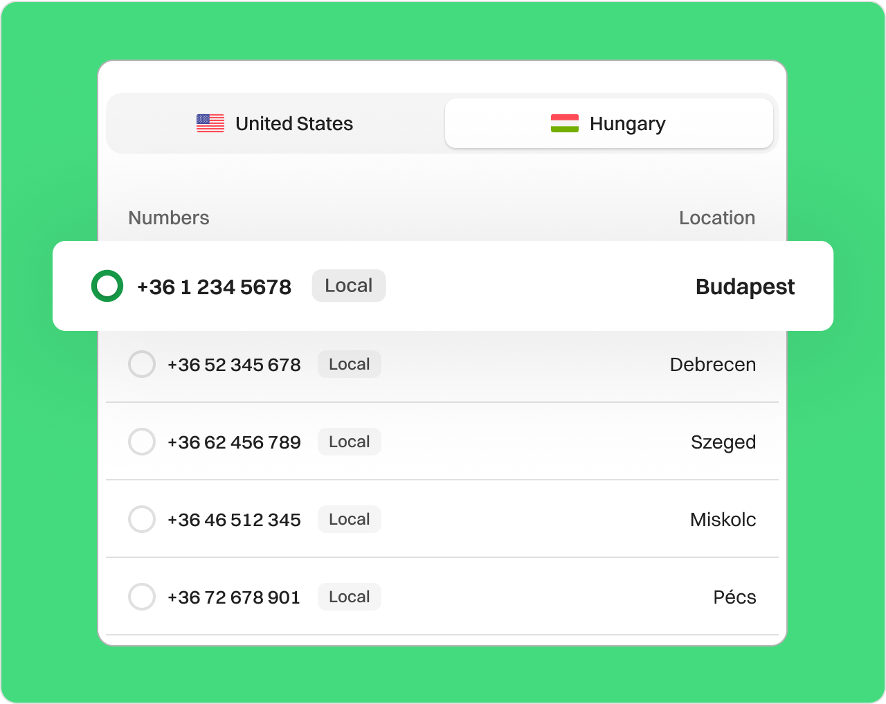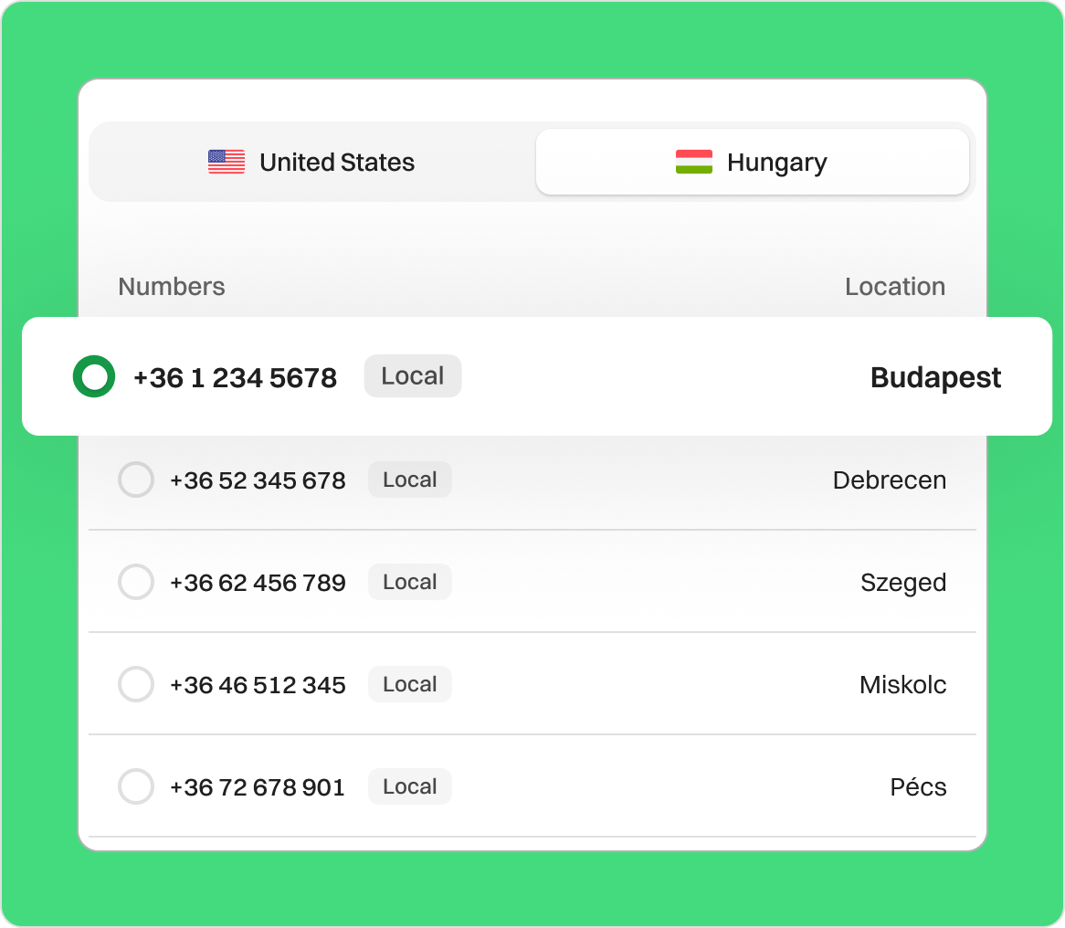 Get a Hungary Virtual Phone Number Online Need a phone number in Hungary for personal or business use? With everything going digital, it’s smart to get a virtual number. A Hungary virtual number makes it easy to stay connected from anywhere. Register through the official website or mobile app. Instantly manage, forward, or record calls. Use your Hungarian virtual number on any device worldwide Sign upRequest a Demo Endorsed by top industry leaders Trusted by industry experts for excellence and innovation. How to buy a Hungary Virtual Number from Dialaxy? You can get a Hungarian virtual number through many VoIP services. Dialaxy is one of the easiest and most trusted platforms to do this. Just follow these simple steps: Sign up via the official website or mobile app. Log in with your credentials to access the dashboard. Click the “My Number” option under the “Portal” menu. Select the “Buy Number” option. Choose “Hungary” as the country and select the desired Israel area code from the list. Complete your payment and upload any required identification documents. What is the Hungary Virtual Phone Number? A Hungary virtual phone number appears to be a local mobile or landline number. However, it works through the internet, not a regular phone line. It’s cloud-based and doesn’t require a physical SIM or location. It uses VoIP technology. This allows users to make calls or send texts from their mobile phones, computers, or tablets, regardless of their location. The number follows the Hungarian phone format. It starts with +36, which is the country code for Hungary. Then, it includes an area code (1–2 digits) and a local number (6–7 digits), depending on the region. How does a Hungary phone number work? When someone calls your Hungary virtual phone number, the call is routed over the internet. It does not use traditional phone lines. Your voice is changed into digital data. It is sent over a secure network. When it reaches the recipient, it is converted back into audio. This process happens in real-time and is powered by VoIP technology. It makes your virtual number sound and work just like a real Hungarian landline or mobile number. No delays. No dropped calls. Just crystal-clear communication. You can receive and make calls, as well as send SMS and MMS messages, through supported apps, depending on your plan. Additionally, you can forward calls to your personal number in another country, without the caller being aware. Why buy local Hungary phone numbers from Dialaxy? Quick and Easy Setup Need a Hungary business number fast? With Dialaxy, you can get started in just minutes. No hardware, no paperwork, and no waiting. Simply sign up, choose your Hungarian region, and your number will go live right away. Make Calls Appear Local When you contact customers in Hungary, your number looks local. This builds immediate trust and increases the likelihood that your calls will get answered. It also boosts results for local sales or marketing campaigns. Fast and Flexible Number Selection Dialaxy offers a wide range of area codes from key Hungarian cities like Budapest (1), Debrecen, or Szeged. You can even choose vanity numbers that reflect your brand or select multiple numbers for different teams. Share and Use Instantly As soon as your Hungary virtual number is active, you can share it on websites, business cards, or email footers. Customers can call, leave voicemails, or send messages—all forwarded straight to your device. Budget-Friendly Plans Need a number that fits your budget? Dialaxy offers virtual numbers in Hungary starting from just $10 per month. Plans include SMS, voicemail, call forwarding, and more, without hidden fees or long-term contracts. Build Local Presence and Trust Using a local Hungarian number strengthens your business image. It helps you connect with customers more effectively and supports regional campaigns by allowing you to focus on specific cities or areas. Enjoy 100+ Dialaxy’s features with local phone number Call, SMS, & Contact in one easy to use app. Phone Numbers Global Calling SMS Voicemail Number Sharing Contacts All Features Phone Numbers Expand your reach with Virtual Phone Numbers International Numbers: Establish a local presence of your business with our international phone numbers . Toll Free Numbers: Elevate your sales strategy and drive business growth with Toll Free Numbers. Multiple Phone Numbers: Use multiple phone numbers in one single dashboard. Learn More Global Calling Connect globally with effortless calls Extended Reach: Enables businesses to expand their market by reaching international customers. Flexibility: Allows employees to make international calls from anywhere. Seamless Communication: Ensures clear and reliable communication with international contacts. Learn More SMS Enhance communication with SMS capabilities A2P 10DLC: Register your number in A2P 10DLC to send sms within US and Canada. Schedule SMS: Schedule SMS as per your customer timezone so they don’t miss an update. Personalised Messaging: Personalise SMS depending upon your user and its behaviour. Learn More Voicemail Easily manage messages with Voicemail Voicemail Recording: Personalized voicemail greetings for different departments Message Management: Messages are stored in the cloud, allowing for easy access. Access and Playback: Listen to voicemails from any internet-connected device. Learn More Number Sharing Enhance collaboration with effortless Number Sharing Unified communication: With number sharing, multiple devices can use the same phone number. Convenience: Seamlessly switch between devices without missing calls or texts. Cost Efficiency: Reduce costs by eliminating the need for multiple phone plans. Learn More Contacts Effortlessly manage your contacts Add and delete contact: Add and delete new contacts as the business grows. Centralized Information: Stores all relevant contact details in one place, making it easy to access and manage. Improv