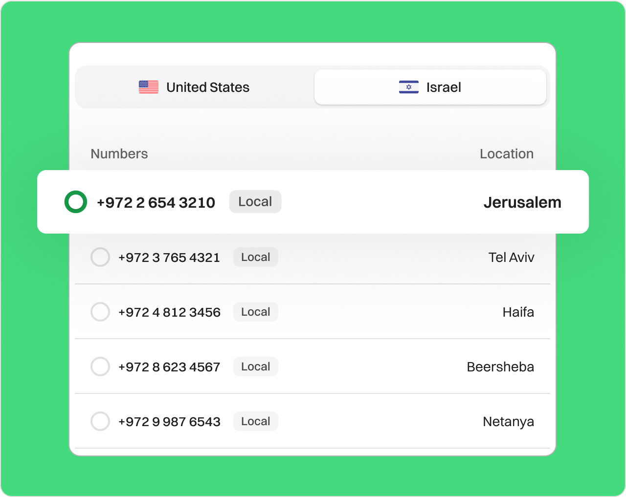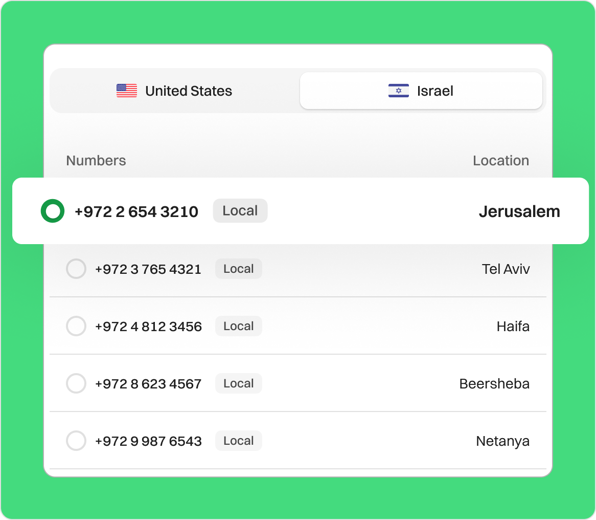 Get Free Israel Virtual Phone Number Online Need an Israeli business phone number? As digital tools become increasingly essential, transitioning to a virtual system is a smart move. A free virtual phone number for Israel can be a powerful tool for both personal and professional needs. Sign up through our official website or mobile app. Instantly monitor, manage, and record incoming calls. Set up call forwarding from your Israeli number to any device worldwide. Sign upRequest a Demo Endorsed by top industry leaders Trusted by industry experts for excellence and innovation. How to buy an Israel Virtual Number from Dialaxy? Getting an Israeli virtual phone number is easy with a VoIP service. Dialaxy is a trusted service provider for obtaining Israeli virtual numbers. Just follow the steps below: Sign up via the official website or mobile app. Log in with your credentials to access the dashboard. Click the “My Number” option under the “Portal” menu. Select the “Buy Number” option. Choose “Israel” as the country and select the desired Israel area code from the list. Complete your payment and upload any required identification documents. What is the Israel Virtual Phone Number? An Israeli virtual number looks like a normal Israeli mobile or landline number. However, it is hosted in the cloud. It’s not tied to a physical line or address. Using VoIP (Voice over Internet Protocol), you can make and receive calls or texts online, and no local SIM card is needed. It usually follows this format: +972 (Israel’s international code) + area code + 7-digit personal number. You can use this number on your phone, desktop, or any internet-connected device. How does an Israel phone number work? Unlike traditional phone lines that rely on wires and physical hardware, a virtual Israel phone number works entirely online. It sends voice data over the internet using digital signals. When you call or receive a call, your voice is instantly turned into data packets. These are sent through the web and decoded on the other end, so it feels just like a regular phone call. All you need is a stable internet connection: no extra hardware, no cables—just smooth communication. Why buy local Israel phone numbers from Dialaxy? Easy Setup for an Israeli Number Setting up a virtual number in Israel is quick and straightforward with Dialaxy. No technical experience is required—just sign up, pick your region, and start making calls in minutes. Calls Look Local to Your Contacts Your Israeli virtual number ensures all outgoing calls appear local. This helps you create a strong presence in the region. It builds trust quickly and helps you connect better with customers in Israel. Quick Number Selection Choose your ideal Israeli phone number quickly. Select your preferred region, find regular or vanity numbers, and even get multiple lines to suit your personal, business, or team needs. Share It with Your Network Instantly Once your Israeli number is active, share it with friends, clients, or coworkers right away. They can call, text, or leave voicemails just like with a traditional local number. Affordable Pricing Plans Dialaxy offers budget-friendly virtual numbers for Israel with voice and SMS features. Plans start at just $10 per month, providing you with professional tools at a fraction of the cost of traditional telecom service Build a Local Presence A local Israeli number builds credibility and supports your marketing strategy. It strengthens regional trust, boosts engagement, and lets your brand feel local—even when you’re operating remotely. Enjoy 100+ Dialaxy’s features with local phone number Call, SMS, & Contact in one easy to use app. Phone Numbers Global Calling SMS Voicemail Number Sharing Contacts All Features Phone Numbers Expand your reach with Virtual Phone Numbers International Numbers: Establish a local presence of your business with our international phone numbers . Toll Free Numbers: Elevate your sales strategy and drive business growth with Toll Free Numbers. Multiple Phone Numbers: Use multiple phone numbers in one single dashboard. Learn More Global Calling Connect globally with effortless calls Extended Reach: Enables businesses to expand their market by reaching international customers. Flexibility: Allows employees to make international calls from anywhere. Seamless Communication: Ensures clear and reliable communication with international contacts. Learn More SMS Enhance communication with SMS capabilities A2P 10DLC: Register your number in A2P 10DLC to send sms within US and Canada. Schedule SMS: Schedule SMS as per your customer timezone so they don’t miss an update. Personalised Messaging: Personalise SMS depending upon your user and its behaviour. Learn More Voicemail Easily manage messages with Voicemail Voicemail Recording: Personalized voicemail greetings for different departments Message Management: Messages are stored in the cloud, allowing for easy access. Access and Playback: Listen to voicemails from any internet-connected device. Learn More Number Sharing Enhance collaboration with effortless Number Sharing Unified communication: With number sharing, multiple devices can use the same phone number. Convenience: Seamlessly switch between devices without missing calls or texts. Cost Efficiency: Reduce costs by eliminating the need for multiple phone plans. Learn More Contacts Effortlessly manage your contacts Add and delete contact: Add and delete new contacts as the business grows. Centralized Information: Stores all relevant contact details in one place, making it easy to access and manage. Improved Organization: Helps organize contacts into groups or categories, enabling better management. Learn More Frequently Asked Questions What is an Israeli virtual phone number?It’s a phone number that works over the internet but appears to be a local Israeli number. You can use it worldwide. Can I use an Israeli virtual number on my mobile phone?Yes! Simply install a co