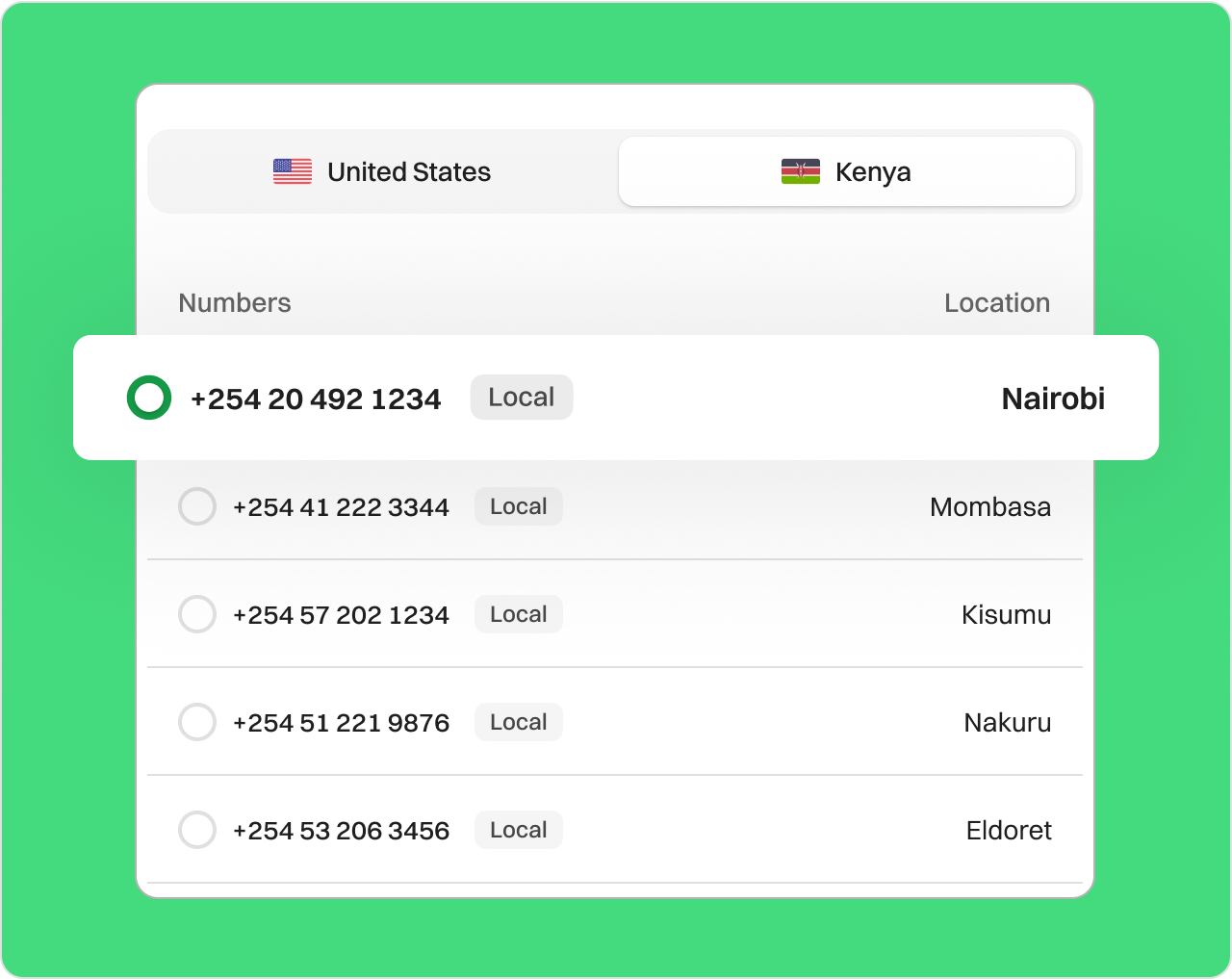 Get a Kenya Virtual Phone Number Online Need a business phone number in Kenya? With digital communication on the rise, now is the perfect time to switch to cloud-based telephony. A free virtual phone number for Kenya is an excellent tool for entrepreneurs, remote teams, and personal users alike. Register with the official website or through the mobile application. Monitor, record, and manage incoming calls instantly. Set up your Kenya virtual number to forward calls to any device worldwide. Sign upRequest a Demo Endorsed by top industry leaders Trusted by industry experts for excellence and innovation. How to Buy a Kenya Virtual Number from Dialaxy? You can purchase a Kenya virtual phone number through any reputable VoIP service provider. Dialaxy simplifies the process, giving you full control over your new number. Follow these steps to get started: Sign up via the official website or mobile app. Log in with your credentials to access the dashboard. Click the “My Number” option under the “Portal” menu. Select the “Buy Number” option. Choose “Kenya” as your country and pick your preferred area code. Complete your payment and upload any required identification documents. What is the Kenya Virtual Phone Number? A Kenya virtual phone number is a cloud-powered number that works over the internet. It appears like a regular Kenyan mobile or landline number, but does not rely on physical phone lines or SIM cards. Instead, it uses VoIP technology to make and receive calls and messages online. Kenya virtual numbers typically follow this format: Begin with +254 (Kenya’s country code) Include a network-specific or geographic code End with a subscriber number (e.g., +254 20 XXX XXXX for Nairobi landlines) You can use it on any internet-connected device without being in Kenya. How Does a Kenyan Phone Number Work? Kenya virtual numbers operate using VoIP (Voice over Internet Protocol) rather than traditional telecom lines. All you need is a reliable internet connection to make or receive calls globally. Here’s how it works: Your voice is converted into data using a VoIP platform These voice data packets are sent over the internet securely The recipient’s device converts the packets back into audio in real time This process ensures your calls are fast, reliable, and clear without needing any local telecommunications infrastructure. Why Buy Local Kenya Phone Numbers from Dialaxy? Simple Way to Get a Kenyan Phone Number Need a local number for Kenya? Dialaxy provides quick registration and easy setup, so you can go live in minutes using your existing device. Your Contacts Can Make Local Phone Calls Having a Kenyan number helps ensure all calls look local to your clients or customers, helping build instant trust and familiarity. A Rapid Number Selection Method Dialaxy offers a fast way to pick local or vanity numbers. Just select Kenya, your area code, and the number you prefer, all in one dashboard. Share the Number with Those You Know You can easily share your Kenyan number with customers, friends, or family. They can call, leave messages, or send SMS with no delays. Cost-effective Virtual Numbers for Kenya Looking for low-cost communication? Kenya virtual numbers start at only $17 per month, including features like voice and SMS. Local Presence and Customer Trust A local Kenyan number boosts your credibility and builds stronger ties with local clients, partners, and support networks. Enjoy 100+ Dialaxy’s features with local phone number Call, SMS, & Contact in one easy to use app. Phone Numbers Global Calling SMS Voicemail Number Sharing Contacts All Features Phone Numbers Expand your reach with Virtual Phone Numbers International Numbers: Establish a local presence of your business with our international phone numbers . Toll Free Numbers: Elevate your sales strategy and drive business growth with Toll Free Numbers. Multiple Phone Numbers: Use multiple phone numbers in one single dashboard. Learn More Global Calling Connect globally with effortless calls Extended Reach: Enables businesses to expand their market by reaching international customers. Flexibility: Allows employees to make international calls from anywhere. Seamless Communication: Ensures clear and reliable communication with international contacts. Learn More SMS Enhance communication with SMS capabilities A2P 10DLC: Register your number in A2P 10DLC to send sms within US and Canada. Schedule SMS: Schedule SMS as per your customer timezone so they don’t miss an update. Personalised Messaging: Personalise SMS depending upon your user and its behaviour. Learn More Voicemail Easily manage messages with Voicemail Voicemail Recording: Personalized voicemail greetings for different departments Message Management: Messages are stored in the cloud, allowing for easy access. Access and Playback: Listen to voicemails from any internet-connected device. Learn More Number Sharing Enhance collaboration with effortless Number Sharing Unified communication: With number sharing, multiple devices can use the same phone number. Convenience: Seamlessly switch between devices without missing calls or texts. Cost Efficiency: Reduce costs by eliminating the need for multiple phone plans. Learn More Contacts Effortlessly manage your contacts Add and delete contact: Add and delete new contacts as the business grows. Centralized Information: Stores all relevant contact details in one place, making it easy to access and manage. Improved Organization: Helps organize contacts into groups or categories, enabling better management. Learn More Frequently Asked Questions How do I get a virtual phone number in Kenya?Sign up with a provider like Dialaxy, select Kenya, and activate your number in minutes. Can I use a Kenya virtual number for WhatsApp Business?Yes, virtual numbers that support SMS or voice work for WhatsApp Business verification. Are Kenya's virtual numbers good for international businesses?Absolutely. They help businesses connect lo