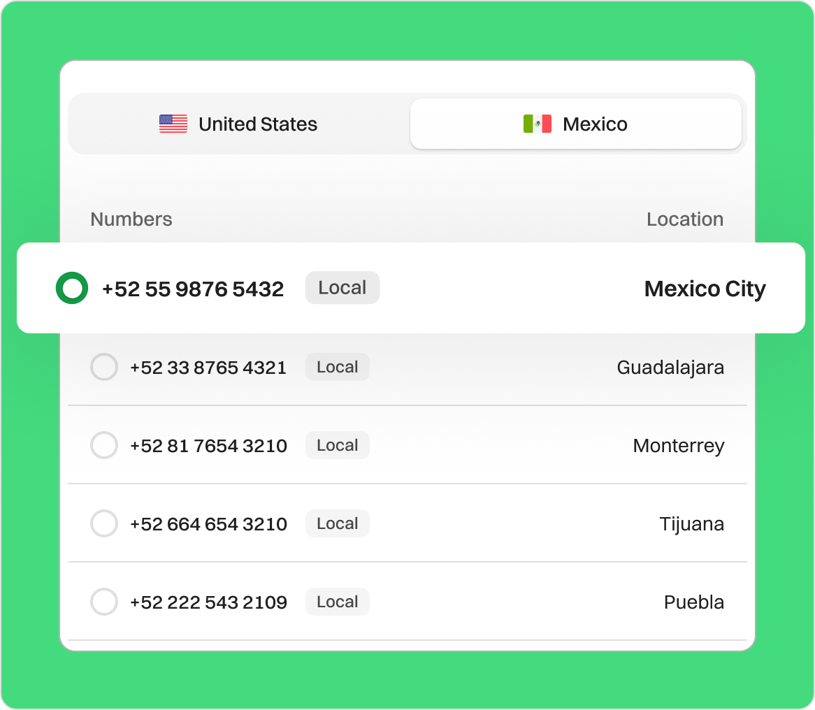 Get a Mexico Virtual Phone Number Online Want a Mexico virtual phone number for your business? There’s never been a better time to move to the cloud. A Mexico virtual phone number is a smart solution for both personal and professional use. Sign up easily through the official website or mobile app. Track, record, and handle incoming calls in real-time. Configure your Mexico virtual number to forward calls to any device, anywhere in the world. Sign upRequest a Demo Endorsed by top industry leaders Trusted by industry experts for excellence and innovation. How to Buy a Mexico Virtual Number from Dialaxy? If you’re in need of a Mexican virtual phone number, Dialaxy offers a straightforward solution. To acquire your number, simply follow these steps for a smooth purchasing process: Register on the official Dialaxy website or through the mobile app. Log in with your credentials to access the dashboard. Click the “My Number” option under the “Portal” menu. Click on “Buy Number.” Select “Mexico” as the country and choose your preferred Mexican area code. Make the payment and upload any required documents if asked. What is the Mexico Virtual Phone Number? A Mexico virtual phone number is a telephone number not tied to a specific physical address. Instead, it functions over the internet using VoIP (Voice over Internet Protocol) technology. This means users can make and receive calls from anywhere in the world using an internet connection. These numbers resemble standard Mexican phone numbers, including a local area code. But they offer enhanced flexibility and advanced features not found in traditional landlines. Mexico virtual numbers follow the country’s number format: they begin with the country code +52, followed by a 2–3 digit area code and a 7–8 digit subscriber number depending on the region. Popular area codes include Mexico City (55), Guadalajara (33), and Monterrey (81). How Does a Mexican Phone Number Work? Mexico virtual phone numbers work entirely online, so you don’t need traditional landlines or on-site hardware. All you need is an internet connection. Unlike conventional phones, virtual numbers transmit calls using VoIP (Voice over Internet Protocol). When someone dials your Mexico number, the voice is transformed into digital data packets, sent over the internet, and converted back into sound on the other end. The call happens in real time, so it’s just as clear and responsive as a regular phone call. Why Buy Local Mexico Phone Numbers From Dialaxy? Build Trust with a Local Presence People trust local numbers. A Mexico area code makes your company look local, even if you’re operating from abroad. This builds credibility and increases call answer rates with potential customers in cities like Mexico City or Monterrey. Save on Communication Cost Traditional international calling can get expensive. Dialaxy’s virtual numbers use VoIP, so you and your clients avoid steep fees.st, sustain your device, and establish an identity in various places. Enjoy high-quality calls without worrying about cost. Quick Setup, No Physical Equipment Forget about wiring and devices. Dialaxy virtual numbers work through the cloud and can be activated almost instantly. With just an internet connection, you can start calling from anywhere. Flexible Call Routing to Any Device Forward calls to smartphones, desk phones, or softphones—whatever your team uses. No matter where your team is, your Mexico virtual number ensures you never miss a call. Easily Scalable for Growing Teams Whether you're testing the waters in Guadalajara or scaling in multiple states, Dialaxy helps you expand effortlessly. Add more numbers and users without needing extra equipment. Professional Features to Enhance Customer Experience Each Mexico virtual number includes business-ready tools like voicemail-to-email, IVR menus, call routing, recording, and analytics. These tools help create a polished experience for your clients, day or night. Enjoy 100+ Dialaxy’s features with local phone number Call, SMS, & Contact in one easy to use app. Phone Numbers Global Calling SMS Voicemail Number Sharing Contacts All Features Phone Numbers Expand your reach with Virtual Phone Numbers International Numbers: Establish a local presence of your business with our international phone numbers . Toll Free Numbers: Elevate your sales strategy and drive business growth with Toll Free Numbers. Multiple Phone Numbers: Use multiple phone numbers in one single dashboard. Learn More Global Calling Connect globally with effortless calls Extended Reach: Enables businesses to expand their market by reaching international customers. Flexibility: Allows employees to make international calls from anywhere. Seamless Communication: Ensures clear and reliable communication with international contacts. Learn More SMS Enhance communication with SMS capabilities A2P 10DLC: Register your number in A2P 10DLC to send sms within US and Canada. Schedule SMS: Schedule SMS as per your customer timezone so they don’t miss an update. Personalised Messaging: Personalise SMS depending upon your user and its behaviour. Learn More Voicemail Easily manage messages with Voicemail Voicemail Recording: Personalized voicemail greetings for different departments Message Management: Messages are stored in the cloud, allowing for easy access. Access and Playback: Listen to voicemails from any internet-connected device. Learn More Number Sharing Enhance collaboration with effortless Number Sharing Unified communication: With number sharing, multiple devices can use the same phone number. Convenience: Seamlessly switch between devices without missing calls or texts. Cost Efficiency: Reduce costs by eliminating the need for multiple phone plans. Learn More Contacts Effortlessly manage your contacts Add and delete contact: Add and delete new contacts as the business grows. Centralized Information: Stores all relevant contact details in one place, making it easy
