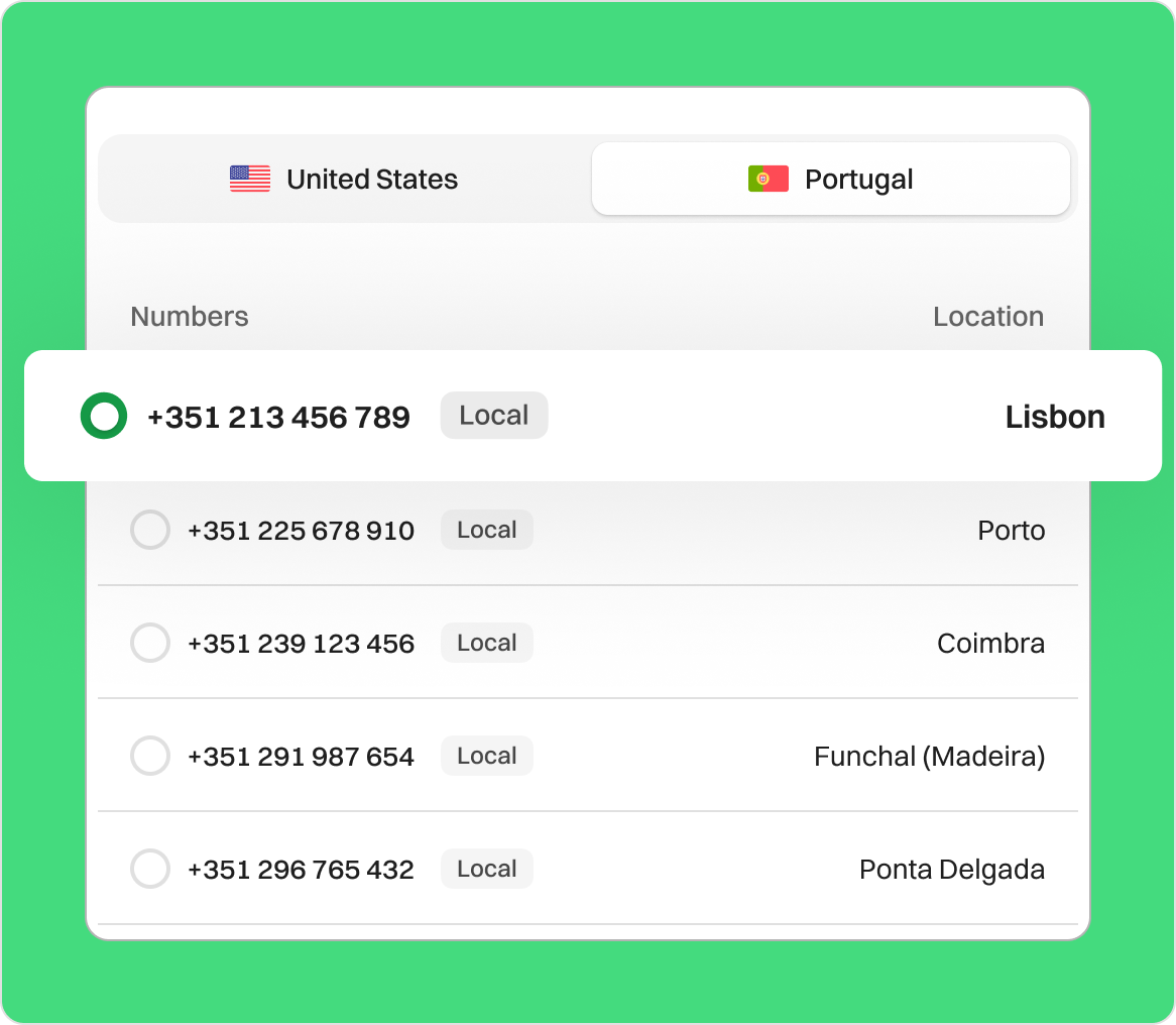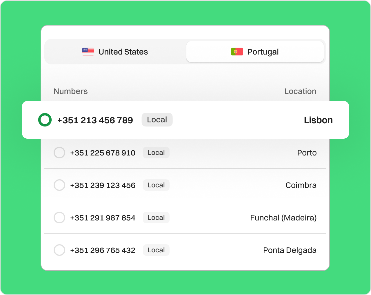 Get a Portugal Virtual Phone Number Online Looking to set up a business phone number in Portugal? With cloud-based VoIP solutions on the rise, now is the perfect time to switch to a virtual phone number in Portugal. It’s fast, flexible, and fits perfectly into today’s remote workflows. Register with the official website or through the mobile application. Monitor and instantly respond to incoming calls with the call recording feature. Set up your virtual number to forward calls to any device worldwide, enabling international calling. Sign upRequest a Demo Endorsed by top industry leaders Trusted by industry experts for excellence and innovation. How to Buy a Portugal Virtual Number from Dialaxy? Want to get your Portugal VoIP number easily? Follow these steps to set up your Portugal virtual number with Dialaxy. Dialaxy is a trusted service provider for obtaining Portuguese virtual phone numbers. To get one, follow the given steps: Sign up via the official website or mobile app. Log in with your credentials to access the dashboard. Click the “My Number” option under the “Portal” menu. Select the “Buy Number” option. Choose "select Portugal" as the country and select the desired Portugal number from the list. Complete your payment and upload any required identification documents. What is the Portugal Virtual Phone Number? A Portugal virtual phone number appears to be a regular local number, but it functions over the internet using VoIP (Voice over Internet Protocol). You can make and receive calls or business texts from anywhere, without needing a SIM card or physical phone line. Portugal employs a closed numbering plan with geographic indicators, enabling you to select a number for a specific region, such as Lisbon (prefix 21) or Porto (prefix 22). A full Portuguese phone number looks like this: +351 XXX XXX XXX Where: +351 = Portugal (country code) XXX XXX XXX = The 9-digit local subscriber number (starting with ‘2’ for landlines or ‘9’ for mobiles). How Does a Portuguese Phone Number Work? Virtual phone numbers in Portugal work entirely online, no physical hardware required. With just an internet connection, calls flow seamlessly over digital networks, rather than traditional lines. Scenario: You pick up your calling device and dial a Portuguese virtual number. Your voice is instantly transformed into tiny data packets, akin to digital postcards, with the aid of a digital converter. These data packets zip across the internet, zooming through networks worldwide without getting lost or changed. On the other side, they turn back into sound waves, letting the person you called hear your voice crystal clear, just like a regular phone call. Did you know? According to the Digital 2024 report, as of early 2024, Portugal had approximately 14.26 million active cellular mobile connections, which is about 139.3% of the total population. Why Use Local Portugal Phone Numbers from Dialaxy? Get Your Portugal Number in Minutes When you buy Portugal virtual numbers, Dialaxy makes it fast. Enjoy features such as caller ID and a custom greeting. Join up today and begin in a few minutes. Make Every Call Feel Local Establish a local presence in Portugal to ensure that your phone calls consistently appear to originate from within the country. This facilitates seamless outbound calls and fosters trust with your Portuguese customers. Choose Your Perfect Number with Ease Select your country and region, and pick a number that suits your needs. You can even effortlessly get a vanity number or multiple numbers, perhaps using an auto attendant to manage busy calls. Share and Start Communicating Instantly Instantly share your new virtual phone number with anyone. They can call, leave voice messages, or send and receive SMS (including bulk SMS capabilities) right away. Affordable Plans, Powerful Features Dialaxy offers a variety of virtual numbers, often with advanced features such as call analytics, call transcription, and call recording, as well as potentially tools like a power dialer or predictive dialer, at budget-friendly rates. Build Trust with a Local Identity Acquiring local phone numbers enhances a business's presence in Portugal, fosters trust among Portuguese customers, and enables targeted marketing. This helps improve campaign tracking and engagement in specific regions. Enjoy 100+ Dialaxy’s features with local phone number Call, SMS, & Contact in one easy to use app. Phone Numbers Global Calling SMS Voicemail Number Sharing Contacts All Features Phone Numbers Expand your reach with Virtual Phone Numbers International Numbers: Establish a local presence of your business with our international phone numbers . Toll Free Numbers: Elevate your sales strategy and drive business growth with Toll Free Numbers. Multiple Phone Numbers: Use multiple phone numbers in one single dashboard. Learn More Global Calling Connect globally with effortless calls Extended Reach: Enables businesses to expand their market by reaching international customers. Flexibility: Allows employees to make international calls from anywhere. Seamless Communication: Ensures clear and reliable communication with international contacts. Learn More SMS Enhance communication with SMS capabilities A2P 10DLC: Register your number in A2P 10DLC to send sms within US and Canada. Schedule SMS: Schedule SMS as per your customer timezone so they don’t miss an update. Personalised Messaging: Personalise SMS depending upon your user and its behaviour. Learn More Voicemail Easily manage messages with Voicemail Voicemail Recording: Personalized voicemail greetings for different departments Message Management: Messages are stored in the cloud, allowing for easy access. Access and Playback: Listen to voicemails from any internet-connected device. Learn More Number Sharing Enhance collaboration with effortless Number Sharing Unified communication: With number sharing, multiple devices can use the same phone number. Convenience: Seam