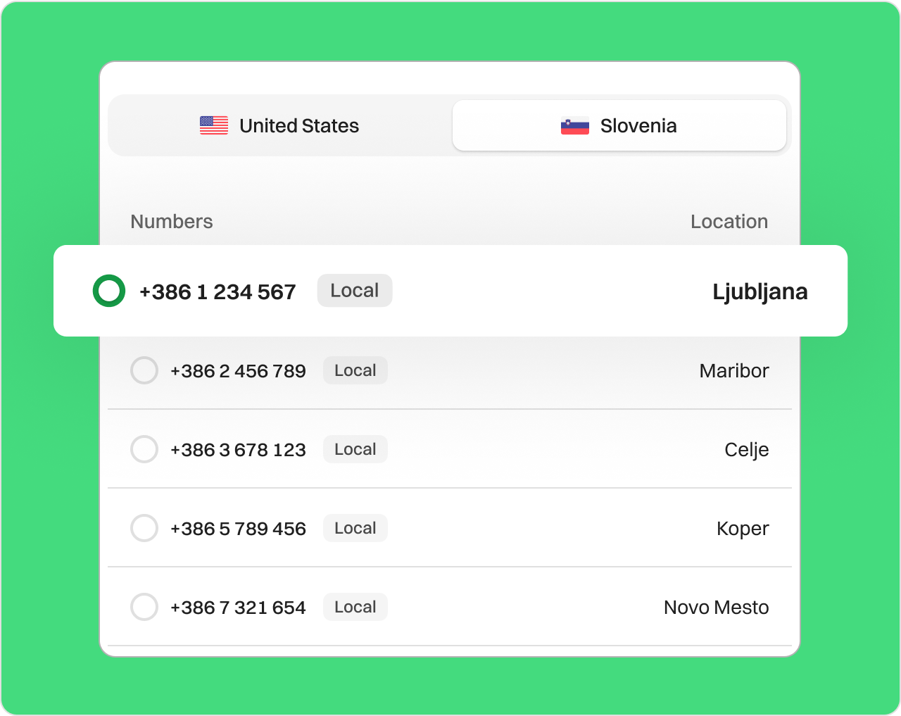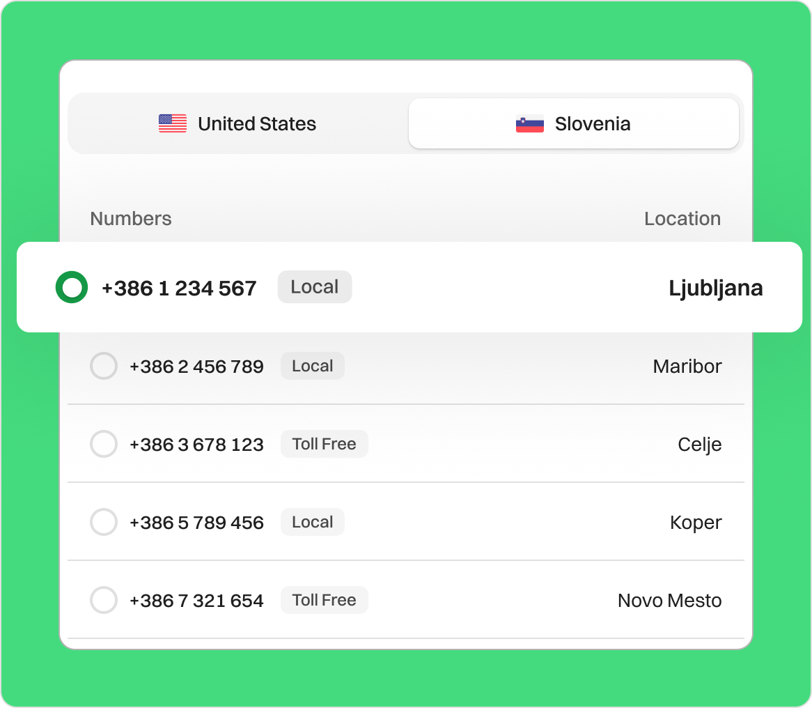 Get a Slovenia Virtual Phone Number Online Need a business phone number in Slovenia? With everything moving online, now is the ideal time to adopt cloud communications. A free virtual phone number for Slovenia can be incredibly useful for both business and personal needs. Register through the official website or mobile app. Monitor, record, and manage incoming calls instantly. Set up your Slovenia virtual number to forward calls to any device worldwide. Sign upRequest a Demo Endorsed by top industry leaders Trusted by industry experts for excellence and innovation. How to Buy a Slovenia Virtual Number from Dialaxy? A Slovenian virtual phone number can be obtained through any trusted VoIP service provider. Dialaxy offers reliable Slovenia virtual numbers. These numbers are ideal for businesses aiming to establish a local presence or for individuals staying connected while abroad. To get started, follow these steps: Sign up via the official website or mobile app. Log in with your credentials to access the dashboard. Click the “My Number” option under the “Portal” menu. Select the “Buy Number” option. Select “Slovenia” as the country and pick your desired Slovenian area code. Make payment and submit necessary documents if necessary. What is the Slovenia Virtual Phone Number? A Slovenia virtual phone number is a cloud-based number that appears to be a standard mobile or landline number but isn’t tied to a physical phone line or address. Using VoIP ( Voice over Internet Protocol) technology, it lets you make and receive calls or messages over the internet on any device, including mobile phones, tablets, and desktops, no SIM card required. Slovenian numbers follow the international dialing format, starting with +386 (the country code), followed by the area-specific code (e.g., 1 for Ljubljana), and then a six- or seven-digit subscriber number. For example, a landline number in Ljubljana might look like +386 1 234 5678, while a mobile number could appear as +386 40 123 456. Area codes vary by region—02 is used for Maribor, and 05 for Koper. Mobile prefixes like 030, 040, or 070 indicate specific carriers, helping identify whether the number is tied to a mobile or landline service. How Does a Slovenia Phone Number Work? Slovenian virtual numbers work independently of physical infrastructure. All you need is a stable internet connection. Unlike conventional phone lines, which rely on copper cables, virtual numbers transmit calls over internet-based networks. Here’s how it works, step by step: 1. Select Your Slovenia Number Choose a virtual number with a Slovenian area code, such as Ljubljana (1) or Maribor (2), from your VoIP service provider. 2. Connect to the Internet Use any internet-enabled device, such as a smartphone, tablet, laptop, or VoIP desk phone, to access the service. 3. Make or Receive a Call When a call is placed, your voice is transformed into small digital data packets using VoIP technology. 4. Voice Travels Over the Internet These packets are transmitted securely over the internet to the recipient, where they’re reassembled into clear audio in real-time. This system allows you to communicate from anywhere while maintaining a local Slovenian identity, ideal for both business and personal use. Why Buy Local Slovenia Phone Numbers from Dialaxy? Easy Setup for a Slovenian Phone Number Need a Slovenian phone number for personal or professional use? Dialaxy makes setup fast and easy. Use your existing device, pick a region or operator, and start calling within minutes. Local Calls Without International Fees A Slovenia virtual number helps people in cities like Ljubljana, Maribor, or Celje call you without incurring international charges. It enhances your accessibility, builds trust, and boosts your local presence. Quick and Flexible Number Selection Get your Slovenian number quickly. Choose the country, then filter by region or mobile operator. You can even select a custom vanity number to reflect your brand identity. Start Communicating Instantly Once activated, your Slovenia number can be shared with colleagues, clients, or friends. They can reach you via call, voicemail, or text. All communication is routed to your selected device in real-time. Affordable Virtual Number Plans Looking for a cost-effective solution? Dialaxy offers Slovenian virtual numbers starting at just $10 per month. Plans include voice, text, and forwarding capabilities, ideal for businesses or frequent travelers. Local Presence and Customer Trust Owning a local Slovenian number enhances your regional credibility, especially when entering the European market. It enhances marketing reach, fosters customer trust, and facilitates localized campaign tracking. Enjoy 100+ Dialaxy’s features with local phone number Call, SMS, & Contact in one easy to use app. Phone Numbers Global Calling SMS Voicemail Number Sharing Contacts All Features Phone Numbers Expand your reach with Virtual Phone Numbers International Numbers: Establish a local presence of your business with our international phone numbers . Toll Free Numbers: Elevate your sales strategy and drive business growth with Toll Free Numbers. Multiple Phone Numbers: Use multiple phone numbers in one single dashboard. Learn More Global Calling Connect globally with effortless calls Extended Reach: Enables businesses to expand their market by reaching international customers. Flexibility: Allows employees to make international calls from anywhere. Seamless Communication: Ensures clear and reliable communication with international contacts. Learn More SMS Enhance communication with SMS capabilities A2P 10DLC: Register your number in A2P 10DLC to send sms within US and Canada. Schedule SMS: Schedule SMS as per your customer timezone so they don’t miss an update. Personalised Messaging: Personalise SMS depending upon your user and its behaviour. Learn More Voicemail Easily manage messages with Voicemail Voicemail Recording: Personalized voicem