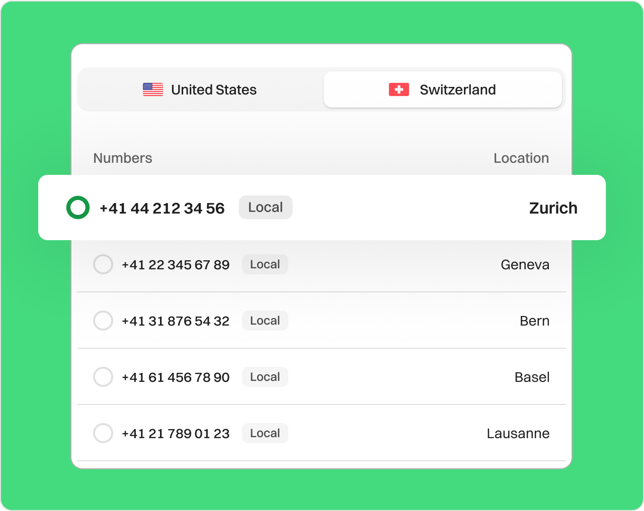 Get a Switzerland Virtual Phone Number with Dialaxy Looking to expand your reach in Switzerland or connect with local customers? Now’s the perfect time to go virtual. Getting a Switzerland virtual phone number online is a smart choice for both personal use and growing businesses. Register quickly via our website or mobile app. Monitor, record, and manage your Switzerland calls instantly. Forward your Swiss number to any device worldwide. Sign upRequest a Demo Endorsed by top industry leaders Trusted by industry experts for excellence and innovation. How to Buy a Swiss Virtual Number from Dialaxy You can easily get a virtual number with a Switzerland area code (like Zurich’s 043 or Geneva’s 022) using a VoIP provider. Dialaxy makes the process fast and reliable. Here’s how to get started: Sign up via the official website or mobile app. Log in with your credentials to access the dashboard. Click the “My Number” option under the “Portal” menu. Select the “Buy Number” option. Select “Switzerland” as your country and pick the area code you need. Complete your payment and upload any required identification documents. What Is a Switzerland Virtual Phone Number? A Swiss virtual number is a cloud-based phone number. It works like a regular landline or mobile number in Switzerland. But it’s not tied to a fixed location or physical phone line, making remote communication easy. It uses VoIP technology, so you can call and text using the internet. No SIM card is required. Note: Switzerland numbers follow this format: +41 (country code) + area code + number For example, +41 43 123 4567 is a landline number in Zurich. How Do Swiss Virtual Numbers Work? Switzerland’s virtual numbers don’t rely on traditional phone lines. Instead, calls are transmitted as digital data over the Internet. When someone calls your number, their voice converts into data packets. The internet delivers these packets straight to your device. The data converts back into sound for a clear conversation. You can answer calls using your mobile phone, laptop, or device with a VoIP number. This keeps you connected no matter where you are. This seamless technology ensures you stay reachable and professional, wherever your business or life takes you. Why Buy a Switzerland Virtual Phone Number from Dialaxy? Easy Setup, No Hassle Whether you're a business owner, freelancer, or someone with personal ties to Switzerland, Dialaxy makes setup quick and user-friendly. Simply sign up, choose your Swiss region, activate your number, and start calling. No complex installations or hardware are needed. Appear Local, Build Trust Using a local Swiss area code like 022 (Geneva) or 044 (Zurich) helps build trust with your audience. Swiss clients are more likely to answer a local number. This adds credibility to your business or personal communication. Simple Number Selection Dialaxy offers a wide range of Swiss numbers. Choose Switzerland as your country, select the city or area code that fits your needs, and pick the number that suits your goals, whether it’s for personal use or expanding your brand in the Swiss market. Share Instantly Once activated, your Swiss number is ready for use. Share it immediately with clients, friends, or business partners. Receive calls, send messages, and stay connected across platforms like mobile apps, desktops, or VoIP phones. Affordable Local Rates Enjoy reliable service with transparent, competitive pricing. Dialaxy offers monthly plans for Swiss numbers that include voice and SMS, with no hidden fees. Perfect for both individuals and businesses looking for affordable communication tools. Trusted Presence Across Switzerland A local number boosts your visibility in Switzerland’s cities like Zurich, Geneva, Bern, Lausanne, and Basel. It's a smart way to grow your presence, strengthen customer support, and build lasting connections across Switzerland. Enjoy 100+ Dialaxy’s features with local phone number Call, SMS, & Contact in one easy to use app. Phone Numbers Global Calling SMS Voicemail Number Sharing Contacts All Features Phone Numbers Expand your reach with Virtual Phone Numbers International Numbers: Establish a local presence of your business with our international phone numbers . Toll Free Numbers: Elevate your sales strategy and drive business growth with Toll Free Numbers. Multiple Phone Numbers: Use multiple phone numbers in one single dashboard. Learn More Global Calling Connect globally with effortless calls Extended Reach: Enables businesses to expand their market by reaching international customers. Flexibility: Allows employees to make international calls from anywhere. Seamless Communication: Ensures clear and reliable communication with international contacts. Learn More SMS Enhance communication with SMS capabilities A2P 10DLC: Register your number in A2P 10DLC to send sms within US and Canada. Schedule SMS: Schedule SMS as per your customer timezone so they don’t miss an update. Personalised Messaging: Personalise SMS depending upon your user and its behaviour. Learn More Voicemail Easily manage messages with Voicemail Voicemail Recording: Personalized voicemail greetings for different departments Message Management: Messages are stored in the cloud, allowing for easy access. Access and Playback: Listen to voicemails from any internet-connected device. Learn More Number Sharing Enhance collaboration with effortless Number Sharing Unified communication: With number sharing, multiple devices can use the same phone number. Convenience: Seamlessly switch between devices without missing calls or texts. Cost Efficiency: Reduce costs by eliminating the need for multiple phone plans. Learn More Contacts Effortlessly manage your contacts Add and delete contact: Add and delete new contacts as the business grows. Centralized Information: Stores all relevant contact details in one place, making it easy to access and manage. Improved Organization: Helps organize contacts into