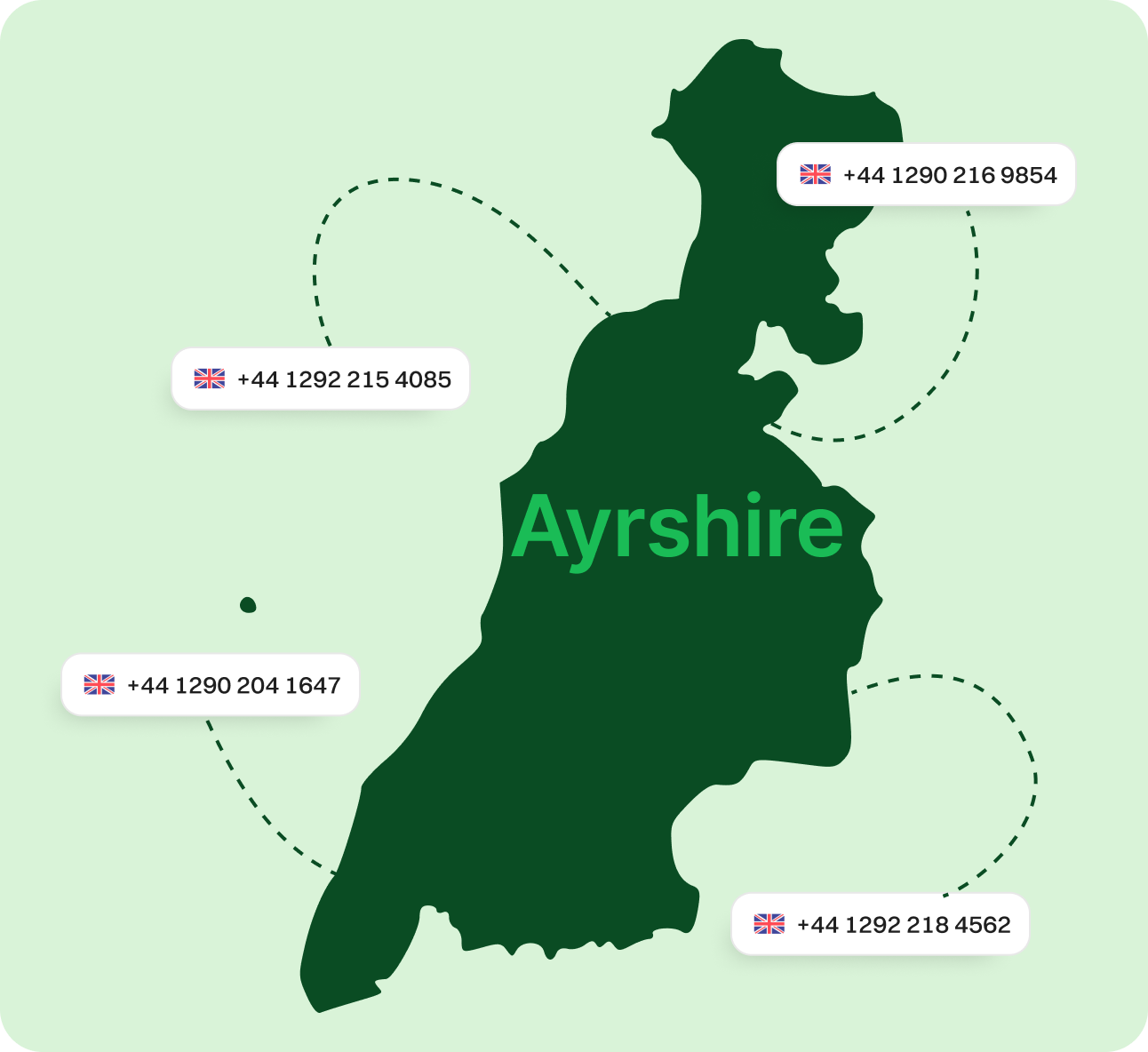 Obtain Your Ayrshire Virtual Phone Number Today Give your business a trusted, local voice in Scotland. An Ayrshire virtual phone number helps you build your local presence in towns like Ayr, Kilmarnock, and Irvine. Whether you’re based nearby or working remotely, a virtual number lets your UK business manage calls easily, connect with customers faster, and build lasting trust. Sign upRequest a Demo Endorsed by top industry leaders Trusted by industry experts for excellence and innovation. What Is an Ayrshire Phone Number? An Ayrshire virtual phone number is a cloud-based phone line that uses VoIP (Voice over Internet Protocol). You don’t need a landline or a physical office. Instead, you make and receive business calls through the internet using a local area code. This allows your business to appear local to customers in Ayrshire and nearby areas such as Glasgow, Lanarkshire, and Dumfries and Galloway. No matter where you work from, you’ll stay connected and sound like you’re just around the corner. How Does an Ayrshire Virtual Phone Number Work? Ayrshire virtual numbers run through a cloud phone system. When a customer dials your Ayrshire area code, the call is delivered over the internet to your device, whether that’s a laptop, a VoIP desk phone, or a mobile. This system converts voices into data, ensuring clear audio and fast delivery. You can forward calls, manage voicemail, send business texts, and control outgoing calls, all from one easy-to-use platform. What Can You Do With Ayrshire Phone Numbers? Make & Receive Calls Send & Receive Texts Separate Work & Personal Establish Local Presence Boost Marketing Efforts Make & Receive Calls Stay available across Ayrshire towns and business hubs like Ayr and Irvine. Get Started Send & Receive Texts Connect via SMS with customers throughout North, East, and South Ayrshire. Get Started Separate Work & Personal Keep calls professional without mixing with personal lines. Get Started Establish Local Presence Use a local Ayrshire number to gain trust, even from outside the region. Get Started Boost Marketing Efforts Improve campaign results with phone numbers that feel familiar to customers. Get Started More Ways Dialaxy Supports Your UK Business Better Engagement Customers respond better to familiar area codes. Local numbers in Ayrshire help increase answer rates and show that you’re part of the local community. Expand Across the UK You can add local virtual numbers across Scotland and the wider UK to support your growth. Keep Your Existing Number Already have a Scottish number? Easily transfer it to Dialaxy with zero disruption. Smart Business Tools Use features like call forwarding, voicemail-to-email, auto attendants, call recording, and analytics. CRM-Friendly Link your virtual number with your CRM to track interactions, manage leads, and build strong relationships. Professional Image Whether you're in Glasgow or remote in London, a local Ayrshire number helps customers take your business more seriously. Specific Area Codes for Ayrshire (Scotland) Area Code Region Covered 01292 Ayr and Prestwick 01290 Cumnock and the surrounding area Why Choose Dialaxy for Your Ayrshire Virtual Phone Number? Flexible Plans Choose what you need, great for solo founders, growing teams, or large call centres. Quick Setup Choose a local area code like 01292 or 01563 and activate your virtual number in minutes. Grow Easily Add more virtual numbers across Scotland as your business expands. 24/7 Support Our team is available round-the-clock to help, no matter your hours or time zone. All-in-One Platform Manage all your business calls, voicemails, and analytics in one place. Affordable Pricing Get a professional setup without high costs or long contracts. How to Get an Ayrshire Number with Dialaxy Step 1 Create an Account Register on Dialaxy using your preferred email and company name. Step 2 Go to "Add New Number" Access your unified dashboard to begin selecting your virtual number. Step 3 Select UK >Scotland >Ayrshire Choose Ayrshire as your region. You’ll see area code options for towns like Ayr, Kilmarnock, and Irvine. Step 4 Pick Your Area Code Choose a code like 01292, 01563, or 01294 to sound more local to your target area. Step 5 Pay & Verify Complete a quick payment and verification step to secure your new number. Step 6 Start Calling Your number is ready to go! Begin making and receiving business calls from your cloud phone system. Grow Your Business with an Ayrshire Area Code Strong Location Advantage Ayrshire is well-positioned near Glasgow and the west coast, making it a gateway for serving central Scotland and beyond. With one number, your UK business can reach local and regional customers alike. Local Trust and Recognition People are more likely to answer calls from numbers they recognize. A local Ayrshire number builds trust, boosts response rates, and helps your business connect better with customers. Suitable for Every Industry From tourism and healthcare to logistics, real estate, and education, businesses of all types can benefit from having a professional, reliable Ayrshire virtual number. Great for Remote Teams Work from home, on the go, or from anywhere in the world—your virtual number will still appear local to customers in Ayrshire. It’s ideal for modern teams, freelancers, and hybrid work models. Affordable and Scalable You don’t need to rent office space or install expensive systems. A virtual number gives you flexibility and scalability with minimal costs, backed by advanced call features that grow with your business. Smart Business Features Enjoy extras like call routing, voicemail-to-email, auto-attendants, and analytics, designed to streamline operations and enhance your customer experience. Explore More UK Regions Somerset Kent Hampshire Scottish Borders Cheshire Surrey Hertfordshire Essex South Yorkshire View all Frequently Asked Questions What is an Ayrshire virtual phone number?It’s a cloud-based number that 