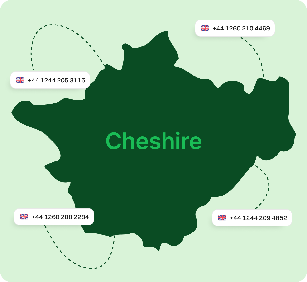 Give your business a local voice with a number that feels familiar to your customers. Build your local presence in Cheshire, covering towns like Congleton, Chester, and Warrington. A Cheshire virtual phone number helps you connect with customers, manage calls easily, and sound more local, even if you’re working from anywhere in the UK.