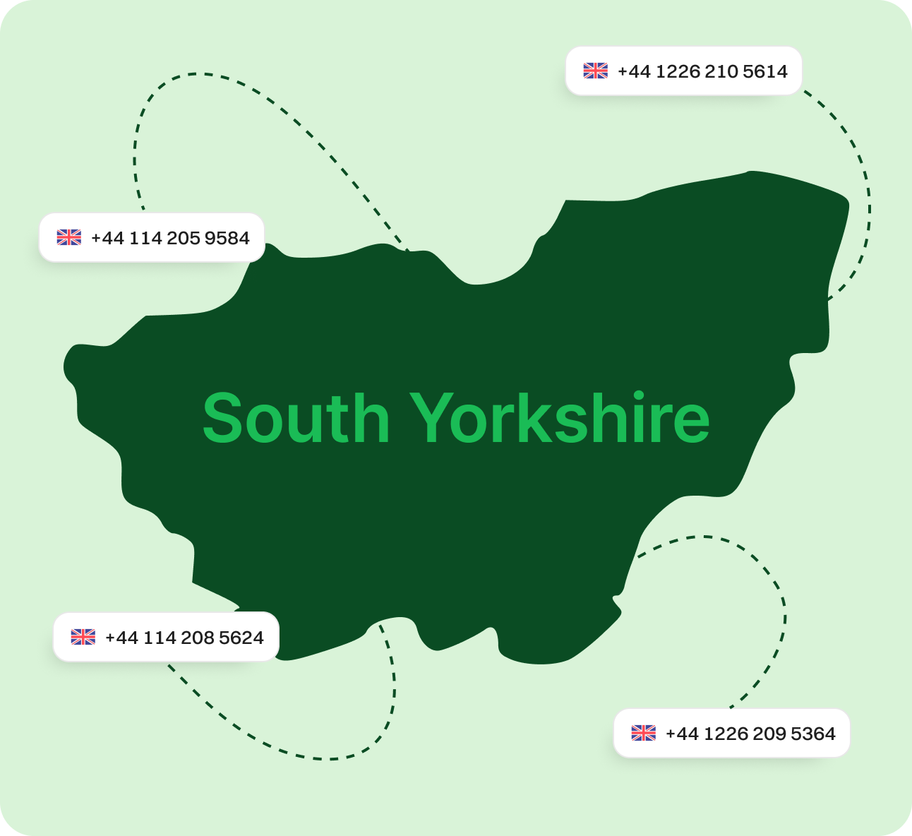 Get Your South Yorkshire Virtual Phone Number Today! Create a strong local presence in South Yorkshire by focusing on Sheffield, Barnsley, and Rotherham. A virtual phone number enhances accessibility and eliminates long-distance fees, allowing easy connection with UK customers without a physical office. Sign upRequest a Demo Endorsed by top industry leaders Trusted by industry experts for excellence and innovation. What Is a South Yorkshire Phone Number? A South Yorkshire virtual number is powered by VoIP (Voice over Internet Protocol) technology, transforming your voice into digital packets that travel over the internet. You can use it to handle calls from anywhere in the world, while maintaining a local South Yorkshire identity. This is ideal for businesses targeting customers across the UK and nearby areas like West Yorkshire, North Lincolnshire, and Derbyshire. You get the benefit of flexible communication tools and wider reach without being physically present. How Does a South Yorkshire Virtual Phone Number Work? South Yorkshire virtual numbers rely on internet connectivity rather than physical phone lines. When someone dials your South Yorkshire number, the system routes the call digitally using VoIP technology. This ensures low latency and crystal-clear communication. Your team can answer calls through mobile apps, desktops, or IP phones. Whether you’re operating a virtual team, managing a remote sales team, or running a customer service desk, these numbers ensure professional contact across Sheffield and Barnsley. What Can You Do With South Yorkshire Phone Numbers? Make & Receive Calls Send & Receive Texts Separate Work & Personal Establish Local Presence Boost Marketing Efforts Make & Receive Calls Stay connected with clients in Sheffield, Barnsley, and surrounding regions. Get Started Send & Receive Texts Use SMS to reach and engage your audience more effectively. Get Started Separate Work & Personal Keep your personal and professional communications distinct. Get Started Establish Local Presence Build trust using recognizable area codes like 0114 and 01226. Get Started Boost Marketing Efforts Improve outreach with localized caller IDs and SMS campaigns. Get Started More Ways Dialaxy Supports Your UK Business Improved Customer Engagement Customers are more likely to answer local calls. Increase your pickup and conversion rates across South Yorkshire. Nationwide UK Coverage Expand into nearby counties including West Yorkshire, Derbyshire, and Lincolnshire. Effortless Number Portability Keep your current number by porting it to Dialaxy with zero downtime. Industry-Specific Solutions Get tailored features for sectors like logistics, education, retail, and manufacturing. Enhanced Brand Consistency Use local caller IDs to align regional marketing with your brand. Specific Area Codes for South Yorkshire Area Code Region Covered 0114 Sheffield, including its major commercial zones 01226 Barnsley, a fast-growing business hub in South Yorkshire Why Choose Dialaxy for Your South Yorkshire Virtual Phone Number? Flexible Plans Whether you’re launching a startup, growing a mid-sized firm, or expanding a large enterprise, our pricing adapts to your scale. Choose monthly or annual plans with transparent rates. Quick Setup Select your desired South Yorkshire area code, complete a few easy steps, and get started within minutes. No long onboarding process, no technical delays. Scalable for Growth As your operations grow, so can your communication tools. Add multiple numbers, expand into new UK regions, or enable advanced features as needed. 24/7 Customer Assistance Our support team is available round-the-clock via phone, chat, or email. Whether you're in the UK or managing from overseas, help is always just a click away. Advanced Call Tools Take advantage of modern tools like call forwarding, call routing, voicemail-to-email, IVR menus, analytics dashboards, and CRM integrations. Manage everything through a centralized online dashboard. Affordable Pricing We believe in simplicity. No hidden charges, no surprise fees, just straightforward billing with excellent value for money. Pay only for what you need. How to Get a South Yorkshire Number with Dialaxy? Step 1 Create an Account Register on Dialaxy using your business or personal email. Step 2 Go to "Add New Number" Access your unified communications dashboard and select this option. Step 3 Choose United Kingdom > South Yorkshire Select South Yorkshire and then your preferred city, like Sheffield or Barnsley. Step 4 Pick Your Area Code Choose a local code, such as 0114 for Sheffield or 01226 for Barnsley. Step 5 Make Payment and Verify Securely complete your payment and verify your identity as prompted. Step 6 Activate and Use Your virtual number is ready within minutes for call centres, freelancers, and businesses. Grow Your Business with a South Yorkshire Area Code Strategic Location Located in Northern England with transport access and economic links. Local codes such as 0114 help create instant recognition. Industry Versatility South Yorkshire supports logistics, tech, education, and heavy industry; your number adapts to any sector. Market Expansion Build a presence in Sheffield, Barnsley, or Rotherham, even from abroad. Reliable Connectivity VoIP systems allow for multi-device compatibility and unified dashboards. Business-Friendly Region South Yorkshire’s growth and low operational costs make it a popular business location. Startup Ready Ideal for lean startups, use a 0114 or 01226 number to appear local and trustworthy. Explore More UK Regions Greater Manchester Lancashire West Yorkshire North Yorkshire West Midlands Hampshire Surrey Essex Cumbria View all Frequently Asked Questions What is a South Yorkshire virtual phone number?A South Yorkshire virtual number is a cloud-based VoIP phone number linked to local area codes like 0114 (Sheffield) or 01226 (Barnsley). It allows you to make and receive calls from anywhere while appearing 