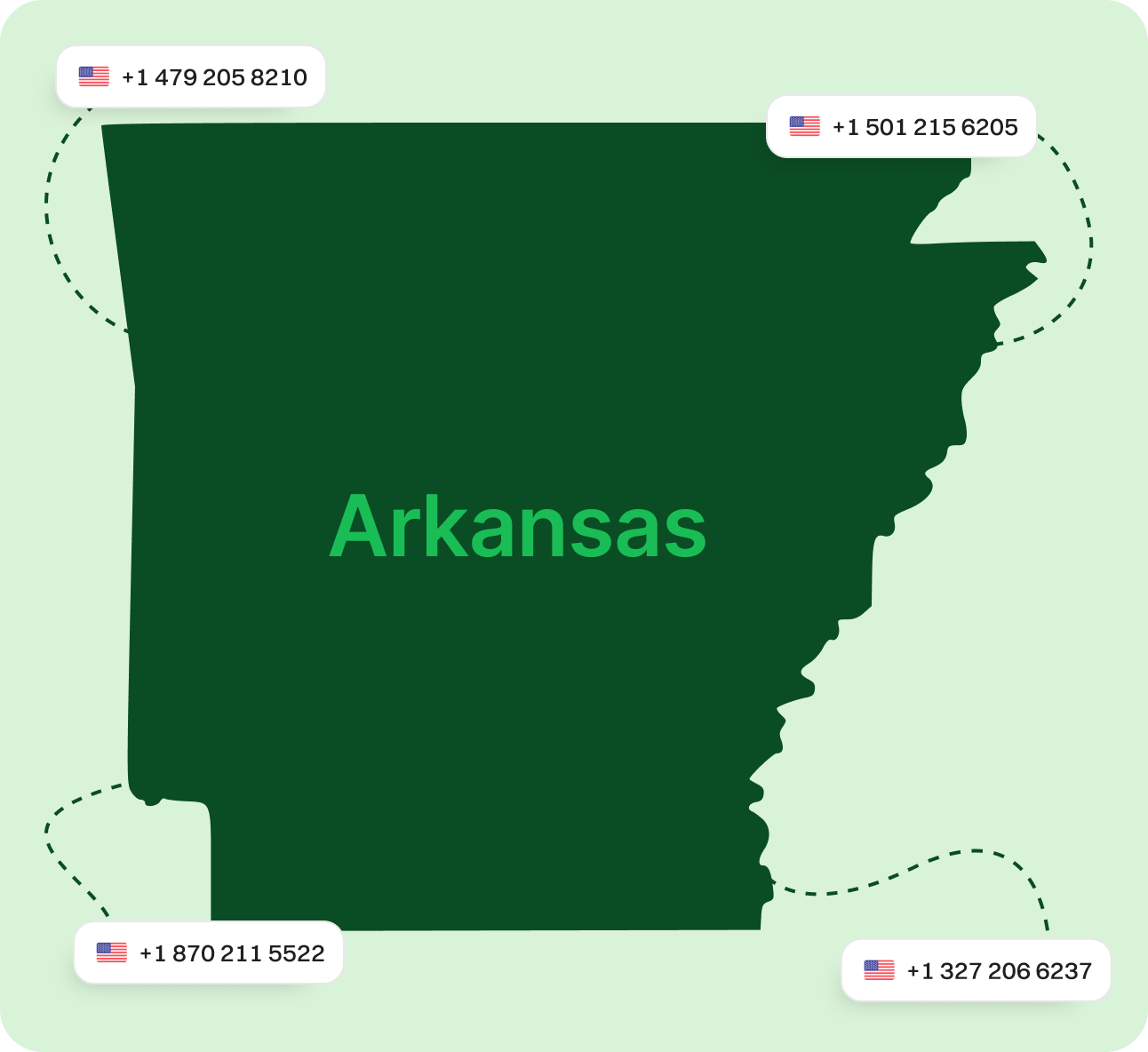 Get an Arkansas Virtual Phone Number Today! Establish a local presence and enhance customer trust with an Arkansas VoIP number. Reduce long-distance costs, manage business communications seamlessly, and stay connected from anywhere without requiring a physical office. Sign upRequest a Demo Endorsed by top industry leaders Trusted by industry experts for excellence and innovation. What is an Arkansas phone number? An Arkansas VoIP number utilizes cloud-based technology to route calls over the internet instead of traditional phone lines. When someone dials your Arkansas number, the call is converted into digital packets, transmitted over the internet, and received by the intended recipient. The call is then converted back into audio signals for real-time communication. This technology enables businesses to manage calls efficiently and ensure seamless customer interactions. An Arkansas VoIP number can be accessed through mobile apps, VoIP phones, or desktops, eliminating the need for physical phone systems. How does an Arkansas virtual phone number work? An Arkansas VoIP number operates using cloud-based technology, routing calls over the internet rather than traditional phone networks. When someone calls your Arkansas number, the call is transformed into digital data packets, sent through the internet, and delivered to the recipient. The data is then converted back into voice signals for real-time communication. This advanced technology enables businesses to streamline call management and maintain professional customer interactions. Arkansas VoIP numbers can be accessed via mobile apps, VoIP phones, or desktop applications, eliminating the need for traditional phone systems. How to make the most of Arkansas phone numbers? Make & Receive Calls Send & Receive Texts Keep Work & Personal Separate Establish Local Presence Boost Marketing Efforts Make & Receive Calls Use your Arkansas phone number for business calls while keeping your personal number private. Dialaxy lets you show your Arkansas number on caller ID, ensuring professionalism. Get Started Send & Receive Texts Leverage text messaging to connect with customers. Use your Arkansas number to send updates, promotions, and reminders, offering a convenient way to stay in touch. Get Started Keep Work & Personal Separate Dialaxy helps you maintain privacy by separating business and personal communications. Manage calls and messages for work without interruptions to your personal life. Get Started Establish Local Presence Build trust with a local Arkansas number, even if your business operates remotely. A recognizable area code helps you connect with customers more effectively. Get Started Boost Marketing Efforts Improve your campaigns by using your Arkansas number for outreach. Localized numbers increase customer engagement and response rates for promotions and offers. Get Started Specific area codes for Arkansas Area Code Area Served 479 Fayetteville, Fort Smith, Bentonville 501 Little Rock, Conway, Hot Springs 870 Jonesboro, Pine Bluff, Texarkana 327 Available for statewide allocation Why choose Dialaxy for an Arkansas virtual phone number? Customizable Plans for Flexibility Dialaxy offers a variety of pricing plans tailored to your needs, allowing you to choose features and services that best suit your personal or business requirements without overpaying. Quick Setup with Zero Hassle Setting up a virtual phone number with Dialaxy is simple and requires no additional hardware. Enjoy a seamless setup process and start making calls within minutes. Scalable Solutions for Growth As your business expands, Dialaxy grows with you. You can easily scale your services by adding multiple Arkansas numbers, ensuring smooth communication with your increasing customer base. Round-the-Clock Support Dialaxy provides 24/7 customer support to resolve any issues or answer questions promptly, keeping your business communication efficient and stress-free. Enhanced Call Management Features Leverage advanced features like call forwarding, voicemail-to-email, and analytics to manage calls more effectively and deliver exceptional customer service. Cost-Effective Pricing With Dialaxy, you get premium services at affordable prices. Whether you're a small business or a large enterprise, you can enjoy professional telephony solutions without exceeding your budget. How to buy an Arkansas number for your business? Step 1 Create an Account Sign up on Dialaxy by visiting their website and completing the simple registration process. Step 2 Navigate to the "Add New Number" Section Go to your account dashboard, find the "Add New Number" option, and select it. Step 3 Select USA and Search for Your Preferred Area Codes From the country list, choose "USA," then search area code according to your phone number need. Step 4 Pick Your Arkansas Island Number Browse through the list of available Arkansas numbers, select the one you want, and add it to your cart. Step 5 Make Payment and Verify Details Complete the payment process and submit any required documentation to verify your account. Step 6 Activate and Start Using Your Number Once activated, your Arkansas virtual phone number is ready to use to make and receive calls. Explore More States Alabama Delaware Florida Georgia Kentucky Louisiana Maryland Mississippi North Carolina Oklahoma South Carolina Tennessee Texas Virginia West Virginia Washington DC View all Frequently Asked Questions What is an Arkansas virtual phone number?An Arkansas virtual phone number is a cloud-based number with an Arkansas area code that allows users to make and receive calls over the Internet instead of traditional phone lines. Can I choose my preferred area code for an Arkansas number?Yes, you can select an available Arkansas area code (479, 501, 870, 327) when purchasing through Dialaxy. Do I need to be in Arkansas to use an Arkansas virtual phone number?No, you can use an Arkansas virtual phone number from anywhere with an internet connection. How m
