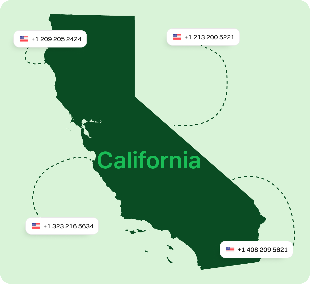 Get a California Virtual Phone Number Right Now! Get a local California phone number instantly and connect with your community effortlessly. Just one click away from building a strong regional presence! Sign upRequest a Demo Endorsed by top industry leaders Trusted by industry experts for excellence and innovation. What is a California Phone Number? A California virtual phone number is a cloud-based telephone number with a California area code (such as 213, 310, 415, and more) that allows users to make and receive calls without needing a physical phone line. These numbers work over the internet using VoIP (Voice over Internet Protocol) technology, making them ideal for businesses and individuals who want a local presence in California without being physically located there. With a California virtual number, businesses can establish credibility in the region, enhance customer trust, and provide cost-effective communication solutions. Calls made to these numbers can be forwarded to mobile phones, landlines, or VoIP systems anywhere in the world, ensuring seamless connectivity regardless of location. These virtual numbers are widely used by remote businesses, startups, and enterprises looking to expand into the California market. They offer flexibility, affordability, and scalability, making them a valuable tool for customer service, sales, and local engagement. How Does a California Virtual Phone Number Work? A California virtual phone number works through cloud-based technology, meaning it operates over the Internet instead of traditional phone lines. You don’t need a physical phone or SIM card to use it, and calls are routed to any device you choose, like your smartphone or computer. When someone calls your California virtual number, the call is turned into digital data and sent over the internet. This data reaches your device and is converted back into audio so you can communicate just like a regular phone call. It also allows you to send texts and voicemails. You don’t need any physical equipment, such as landlines or expensive hardware, to use a virtual number, which saves you money while maintaining a professional image. Additionally, you can use your California virtual number from anywhere in the world, providing you with a local presence no matter where you are. What you can do with California Phone Numbers? Make & Receive Calls Send & Receive Texts Keep Work & Personal Separate Establish Local Presence Boost Marketing Efforts Make & Receive Calls Use your California phone number for business calls while keeping your personal number private. Dialaxy lets you show your California number on caller ID, ensuring professionalism. Get Started Send & Receive Texts Leverage text messaging to connect with customers. Use your California number to send updates, promotions, and reminders, offering a convenient way to stay in touch. Get Started Keep Work & Personal Separate Dialaxy helps you maintain privacy by separating business and personal communications. Manage calls and messages for work without interruptions to individual life. Get Started Establish Local Presence Build trust with a local California number, even if your business operates remotely. A recognizable area code helps you connect with customers more effectively. Get Started Boost Marketing Efforts Improve your campaigns by using your California number for outreach. Localized numbers increase customer engagement and response rates for promotions and offers. Get Started Few More Ways Dialaxy Can Support Your Business Improved Customer Engagement Calls and texts from a local business number boost trust and response rates, making customers more likely to answer. Nationwide Coverage Get phone numbers from multiple cities and states to establish a local presence wherever your business operates. Effortless Number Portability Easily transfer your business phone number to another provider with no location restrictions, contracts, or commitments. Specific Area Code for California Primary Area CodeServed LocationsOverlay Area Code 209Stockton, Modesto, Tracy, Lodi, and Merced.- 213L.A. County, including Florence-Graham, Los Angeles, Huntington Park, Montebello, and South Gate.323 279Sacramento and nearby cities such as Rancho Cordova, Roseville, Elk Grove, and Folsom.916 310Coastal California, including Compton, Inglewood, Beverly Hills, Lynwood, Santa Monica, and Torrance.424 323L.A. County, including Florence-Graham, Los Angeles, Huntington Park, Montebello, and South Gate.213 341Bay Area cities such as Alameda, Berkeley, Fremont, Hayward, and Oakland.510 408Santa Clara County, covering Cupertino, Gilroy, Milpitas, San Jose, and Sunnyvale.669 415San Francisco, Marin County, and northeast San Mateo County.628 424Coastal California, including Compton, Inglewood, Beverly Hills, Lynwood, Santa Monica, and Torrance.310 442Southeastern California, including Carlsbad, Encinitas, Palm Desert, and Rancho Mirage.760 510Bay Area cities such as Alameda, Berkeley, Fremont, Hayward, and Oakland.341 530Northern California cities like Davis, Chico, Shasta, South Lake Tahoe, and Redding.- 559Central California, including Fresno, Hanford, and Kings Canyon National Park.- 562L.A. and Orange Counties, covering Bellflower, Lakewood, Long Beach, and Whittier.- 619Southern California, including San Diego, Chula Vista, El Cajon, and Coronado.619 626East of L.A., including Pasadena, West Covina, Alhambra, and Covina.- 628San Francisco, Marin County, and northeast San Mateo County.415 650South of San Francisco, covering Daly City, San Mateo, Mountain View, Palo Alto, and Pacifica.- 657Orange County, covering Anaheim and Santa Ana.714 661Bakersfield, Santa Clarita, Lancaster, Palmdale, and Mojave.- 669Santa Clara County, covering Cupertino, Gilroy, Milpitas, San Jose, and Sunnyvale.408 707Northern coast, including Santa Rosa, Arcata, Ukiah, Eureka, Benicia, and Vallejo.- 714Orange County, covering Anaheim, Huntington Beach, and Santa Ana.657 747Los Angeles an