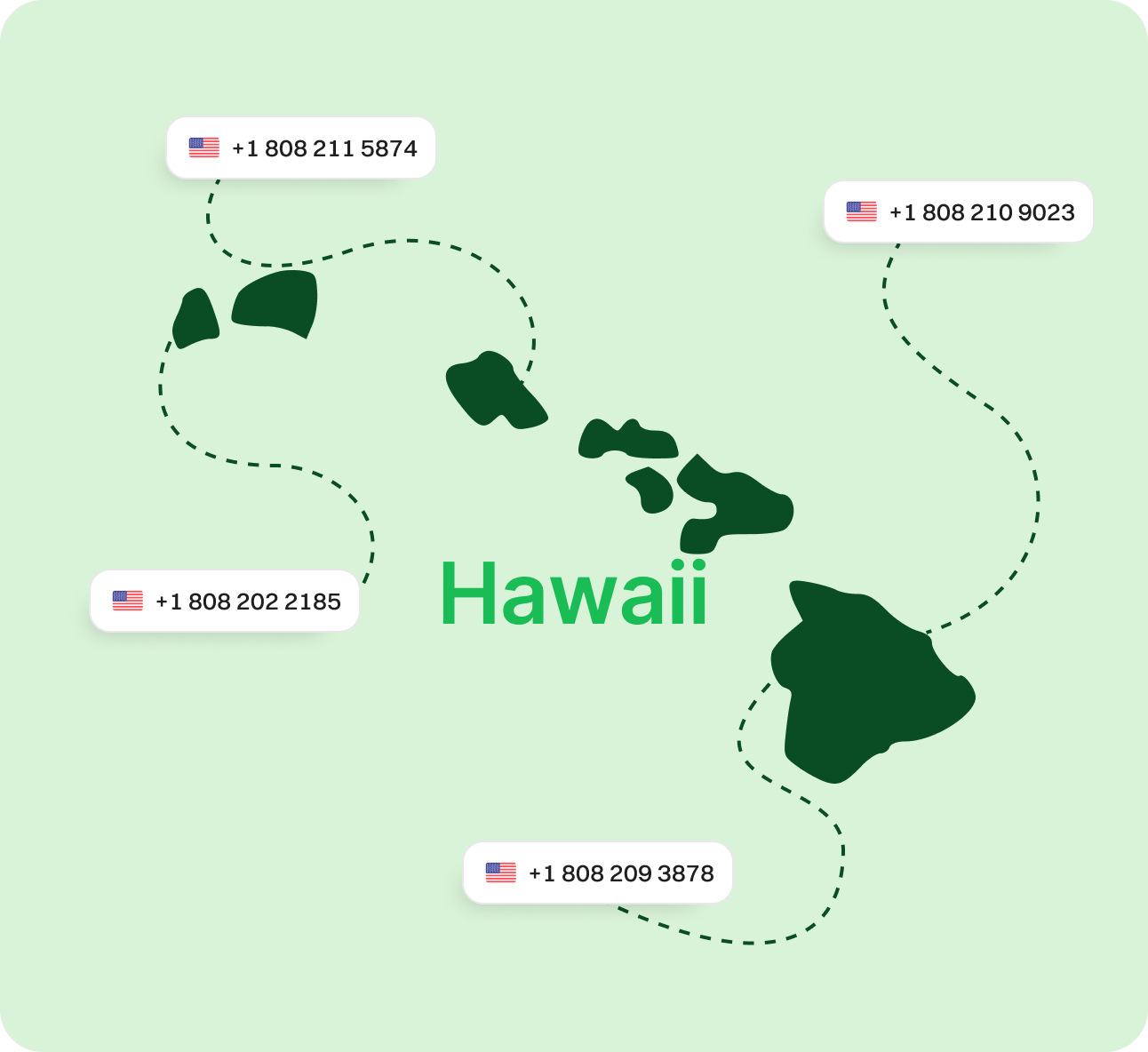 Get a Hawaii Virtual Phone Number Today! Get a local Hawaii phone number instantly and connect with your community effortlessly. Just one click away from building a strong regional presence! Sign upRequest a Demo Endorsed by top industry leaders Trusted by industry experts for excellence and innovation. What is a Hawaii Phone Number? A Hawaii virtual phone number is a cloud-based telephone number with a Hawaii area code that allows users to make and receive calls without needing a physical phone line. These numbers work over the internet using VoIP (Voice over Internet Protocol) technology, making them ideal for businesses and individuals who want a local presence in Hawaii without being physically located there. With a Hawaii virtual number, businesses can establish credibility in the region, enhance customer trust, and provide cost-effective communication solutions. Calls made to these numbers can be forwarded to mobile phones, landlines, or VoIP systems anywhere in the world, ensuring seamless connectivity regardless of location. These virtual numbers are widely used by remote businesses, startups, and enterprises looking to expand into the Hawaii market. They offer flexibility, affordability, and scalability, making them a valuable tool for customer service, sales, and local engagement. How Does a Hawaii Virtual Phone Number Work? A Hawaii virtual phone number operates through cloud-based technology, meaning it works over the internet instead of traditional phone lines. You don’t need a physical phone or SIM card to use it, and calls are routed to any device you choose, such as your smartphone, tablet, or computer. How It Works: Customer calls your Hawaii number, and the call is digitized and transmitted online. The call is forwarded to your preferred device, such as mobile, landline, or VoIP. The data is converted back into audio, enabling a clear and professional conversation. With a Hawaii virtual number, you can also send texts and voicemails, ensuring full communication capabilities without any physical equipment. What You Can Do with Hawaii Phone Numbers? Make & Receive Calls Send & Receive Texts Keep Work & Personal Separate Establish Local Presence Boost Marketing Efforts Make & Receive Calls Use your Hawaii number for business calls while keeping your personal number private. Dialaxy lets you display your Hawaii number on caller ID, ensuring professionalism. Get Started Send & Receive Texts Leverage text messaging to connect with customers. Use your Hawaii number to send updates, promotions, and reminders, offering a convenient way to stay in touch. Get Started Keep Work & Personal Separate Dialaxy helps you maintain privacy by separating business and personal communications. Manage calls and messages for work without interruptions in your personal life. Get Started Establish Local Presence Build trust with a local Hawaii number, even if your business operates remotely. A recognizable area code helps you connect with customers more effectively. Get Started Boost Marketing Efforts Improve your campaigns by using your Hawaii number for outreach. Localized numbers increase customer engagement and response rates for promotions and offers. Get Started Few More Ways Dialaxy Can Support Your Business Improved Customer Engagement Calls and texts from a local business number boost trust and response rates, making customers more likely to answer. Nationwide Coverage, Local Presence Get phone numbers from multiple cities and states to establish a local presence wherever your business operates. Effortless Number Portability Easily transfer your business phone number to another provider with no location restrictions, contracts, or commitments. Specific Area Codes for Hawaii Hawaii has a single statewide area code (808) covering all islands and cities. Area Code Area Served 808 The entire state of Hawaii, including Honolulu, Maui, Big Island, and Kauai Why Choose Dialaxy for Hawaii Virtual Phone Numbers? Customizable Plans for Flexibility Dialaxy offers a variety of pricing plans tailored to your needs, allowing you to choose features and services that best suit your personal or business requirements without overpaying. Quick Setup with Zero Hassle Setting up a Hawaii virtual phone number with Dialaxy is simple and requires no additional hardware. Enjoy a seamless setup process and start making calls within minutes. Scalable Solutions for Growth As your business expands, Dialaxy grows with you. You can easily scale your services by adding multiple Hawaii numbers, ensuring smooth communication with your increasing customer base. Round-the-Clock Support Dialaxy provides 24/7 customer support to resolve any issues or answer questions promptly, keeping your business communication efficient and stress-free. Enhanced Call Management Features Leverage advanced features like call forwarding, voicemail-to-email, and analytics to manage calls more effectively and deliver exceptional customer service. Cost-Effective Pricing With Dialaxy, you get premium services at affordable prices. Whether you're a small business or a large enterprise, you can enjoy professional telephony solutions without exceeding your budget. Grow Your Business with a Hawaii Phone Number Strategic Location Hawaii is a gateway between Asia and the U.S., making it a prime location for international business expansion. A local 808 area code helps companies tap into regional opportunities while maintaining accessibility. Industry Versatility From tourism and hospitality to finance and technology, Hawaii supports a wide range of industries. A local phone number allows businesses across different sectors to establish credibility and attract local clients. Market Expansion Even if your company operates outside of Hawaii, a local number creates a strong regional presence, making it easier to connect with customers and partners in the state. Reliable Communication Network Hawaii’s advanced telecommunications infrastructure ensures s