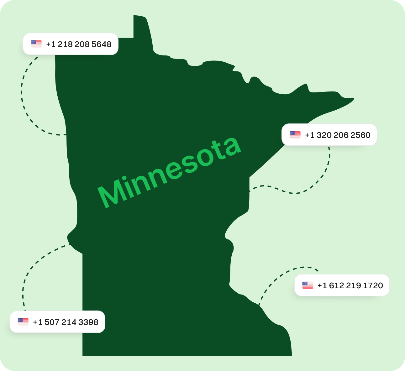 Obtain a Virtual Phone Number for Minnesota Now! Secure a Minnesota virtual phone number to cut down on long-distance charges. Make calls from anywhere, build a local presence, and gain customer trust without a physical office. Sign upRequest a Demo Endorsed by top industry leaders Trusted by industry experts for excellence and innovation. What is a Minnesota phone number? A Minnesota phone number is a digital number that operates through the internet, often using area codes such as 218, 320, 507, 612, 651, 763, and 952. It functions similarly to a traditional phone number but without reliance on physical phone lines, offering greater flexibility and convenience. With a Minnesota phone number, users can make and receive calls from anywhere, using the internet to connect. Unlike traditional numbers, Minnesota phone numbers aren’t tied to a specific location or device, giving businesses and individuals the ability to establish a local presence in Minnesota no matter where they are located globally. Whether for personal or business use, these numbers are easily accessible through various virtual phone service providers, eliminating the need for costly hardware or infrastructure. An example of a Minnesota phone number would be +1 612 123-4567. How does a Minnesota Virtual Phone Number Work? A Minnesota virtual phone number works by using cloud-based technology to route calls over the internet rather than relying on traditional phone lines. This allows users to make and receive calls through an internet connection instead of a physical phone or SIM card. When you dial a Minnesota virtual number, the voice data is converted into digital packets, transmitted over the internet, and received by the intended recipient. The call is then converted back into audio signals, allowing both parties to communicate in real-time. This seamless process ensures that virtual phone numbers function just like regular phone numbers, offering a flexible, cost-effective alternative to traditional phone systems. How to make the most of Minnesota phone numbers? Make & Receive Calls Send & Receive Texts Keep Work & Personal Separate Establish Local Presence Boost Marketing Efforts Make & Receive Calls Use your Minnesota phone number for business calls while keeping your personal number private. Dialaxy lets you show your Minnesota number on caller ID, ensuring professionalism. Get Started Send & Receive Texts Leverage text messaging to connect with customers. Use your Minnesota number to send updates, promotions, and reminders, offering a convenient way to stay in touch. Get Started Keep Work & Personal Separate Dialaxy helps you maintain privacy by separating business and personal communications. Manage calls and messages for work without interruptions to your personal life. Get Started Establish Local Presence Build trust with a local Minnesota number, even if your business operates remotely. A recognizable area code helps you connect with customers more effectively. Get Started Boost Marketing Efforts Improve your campaigns by using your Minnesota number for outreach. Localized numbers increase customer engagement and response rates for promotions and offers. Get Started Specific area codes for Minnesota Area Code Area Served 218 Covers northern Minnesota, including Duluth and Bemidji 320 Covers central Minnesota, including St. Cloud and Willmar 507 Covers southern Minnesota, including Rochester and Mankato 612 Covers Minneapolis and surrounding areas 651 Covers St. Paul and eastern Minnesota 763 Covers the northwest suburbs of Minneapolis 924 Newly assigned area code for Minnesota 952 Covers the southwest suburbs of Minneapolis Why choose Dialaxy for a Minnesota virtual phone number? Customizable Plans for Flexibility Dialaxy offers a variety of pricing plans tailored to your needs, allowing you to choose features and services that best suit your personal or business requirements without overpaying. Quick Setup with Zero Hassle Setting up a Minnesota virtual phone number with Dialaxy is simple and requires no additional hardware. Enjoy a seamless setup process and start making calls within minutes. Scalable Solutions for Growth As your business expands, Dialaxy grows with you. You can easily scale your services by adding multiple Minnesota numbers, ensuring smooth communication with your increasing customer base. Round-the-Clock Support Dialaxy provides 24/7 customer support to resolve any issues or answer questions promptly, keeping your business communication efficient and stress-free. Enhanced Call Management Features Leverage advanced features like call forwarding, voicemail-to-email, and analytics to manage calls more effectively and deliver exceptional customer service. Cost-Effective Pricing With Dialaxy, you get premium services at affordable prices. Whether you're a small business or a large enterprise, you can enjoy professional telephony solutions without exceeding your budget. How to buy a Minnesota number for your business? Step 1 Create an Account Sign up on Dialaxy by visiting their website and completing the simple registration process. Step 2 Navigate to the "Add New Number" Section Go to your account dashboard, find the "Add New Number" option, and select it. Step 3 Select USA and Search for Your Preferred Area Codes From the country list, choose "USA," then search area code according to your phone number need. Step 4 Pick Your Minnesota Number Browse through the list of available Minnesota numbers, select the one you want, and add it to your cart. Step 5 Make Payment and Verify Details Complete the payment process and submit any required documentation to verify your account. Step 6 Activate and Start Using Your Number Once activated, your Minnesota virtual phone number is ready to use to make and receive calls. Explore More States Illinois Indiana Kansas Iowa Michigan Missouri Nebraska North Dakota Ohio South Dakota Wisconsin View all Frequently Asked Questions What is a Minnesota virtual phon