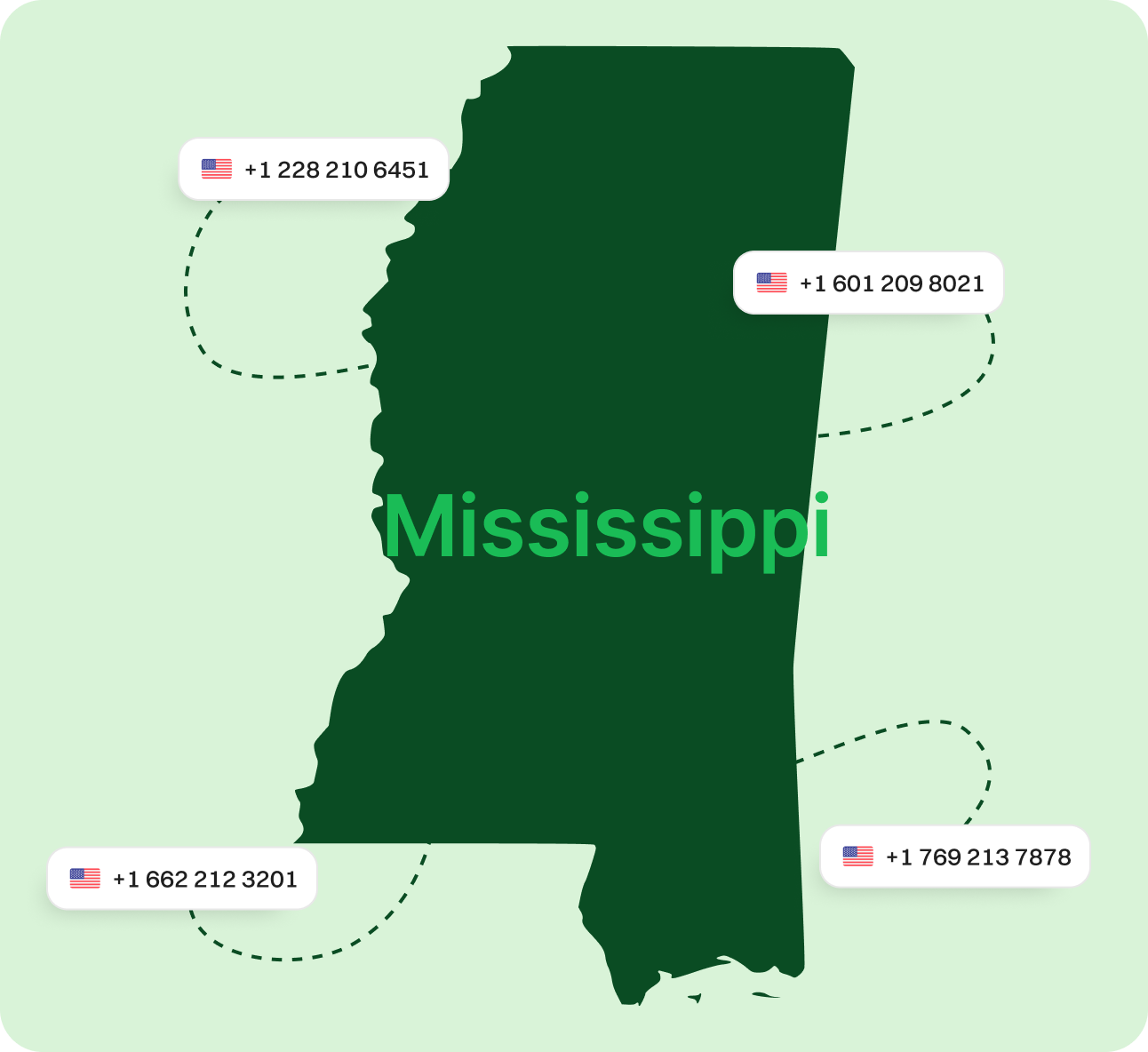Get a Mississippi Virtual Phone Number Today! Secure a Mississippi VoIP number to establish a strong local presence, build trust with your audience, and stay reachable—no matter where you are. Eliminate long-distance fees, streamline your communication, and keep your business agile without needing a physical location. Sign upRequest a Demo Endorsed by top industry leaders Trusted by industry experts for excellence and innovation. What is a Mississippi phone number? A Mississippi virtual phone number is a cloud-based telephone number that uses internet protocols to connect calls instead of traditional landlines. When someone dials your Mississippi number, the audio is converted into digital signals, sent over the web, and then reconstructed on the recipient’s end—allowing for instant, real-time conversations. This modern system enables businesses to handle customer calls more efficiently and flexibly. You can access your Mississippi VoIP number through apps on your smartphone, desktop software, or VoIP-enabled devices—no bulky phone systems are required. How does a Mississippi virtual number work? Mississippi virtual numbers work using VoIP (Voice over Internet Protocol) technology. Instead of traveling through the conventional telephone network, calls are transmitted via the Internet. When someone calls your Mississippi number, their voice is turned into data packets, delivered digitally, and then reassembled into audio for you to hear clearly. This seamless process enables high-quality communication with your clients and customers while giving you more control over call management. Whether you’re using your laptop, a mobile phone, or a VoIP-compatible device, you can enjoy reliable service without being tied to a traditional landline. How to make the most of your Mississippi phone number? Make & Receive Calls Send & Receive Texts Keep Work & Personal Separate Establish Local Presence Boost Marketing Efforts Make & Receive Calls Use your Mississippi number for professional calls while keeping your personal number private. Dialaxy shows your local number on caller ID, reinforcing a professional image. Get Started Send & Receive Texts Connect with clients through SMS messages using your Mississippi number. Send appointment reminders, notifications, or promotions easily. Get Started Keep Work & Personal Separate Keep your business conversations separate from personal ones. Manage work communication in one place without cross-contamination. Get Started Establish Local Presence Whether you're in-state or not, a local Mississippi area code helps you look more approachable and trustworthy to customers. Get Started Boost Marketing Efforts Use your Mississippi number in your local marketing strategies. Customers tend to engage more with familiar local numbers. Get Started Mississippi area codes at a glance Area Code Area Served 228 Gulf Coast, including Biloxi and Gulfport 601 Central and southern Mississippi, including Jackson 662 Northern Mississippi, including Tupelo and Oxford 769 Overlay for 601 – covers the same areas (Jackson and surroundings) Why choose Dialaxy for a Mississippi virtual number? Flexible Plans for Every Need Dialaxy provides a range of pricing options that cater to individuals, startups, and growing businesses. Choose the features you need—no unnecessary extras or hidden charges. Simple Setup Process Getting your Mississippi virtual phone number is fast and stress-free. There’s no hardware to install. You’ll be up and running in just a few minutes. Ready to Grow With You Dialaxy is designed to scale with your business. Add multiple Mississippi numbers or expand to other states as your team or customer base grows. 24/7 Customer Support Questions or technical issues? No problem. Dialaxy’s support team is available around the clock to ensure you stay connected. Smart Call Management Tools Enjoy modern features like call forwarding, auto-attendants, voicemail-to-email, and detailed call analytics—all designed to keep you organized and responsive. Affordable & Reliable Dialaxy delivers top-tier voice services at competitive rates. Whether you're running a side hustle or managing a multi-person team, you’ll get the reliability you need—without breaking the bank. How to get a Mississippi virtual number for your business? Step 1 Create an Account Sign up on the virtual phone number provider’s website. Use your email address or other required credentials to get started. Step 2 Navigate to the "Add New Number" Section Go to your account dashboard, find the “Add New Number” option, and select it. Step 3 Select USA and Choose Mississippi Select USA as your country and then choose Mississippi area code from the list of numbers. Step 4 Pick Your Mississippi Number Browse the list of available Mississippi numbers and pick the one that fits your needs. Step 5 Make Payment and Verify Details Proceed with the payment for your selected number. Double-check your account info and confirm everything is correct. Step 6 Activate and Start Using Your Number Once the number is activated, you can start using your Mississippi virtual number right away. Explore Other Available States Alabama Arkansas Delaware Florida Georgia Kentucky Louisiana Maryland North Carolina Oklahoma South Carolina Tennessee Texas Virginia West Virginia Washington DC View all Frequently Asked Questions What is a Mississippi virtual phone number?A Mississippi virtual number is a cloud-based VoIP number that uses Mississippi’s area codes to connect calls over the internet without the need for physical landlines. Can I select my preferred Mississippi area code?Absolutely. During the signup process, you can choose from available Mississippi area codes like 228, 601, 662, or 769. Do I need to be physically in Mississippi to use the number?Not at all. As long as you have a stable internet connection, you can use your Mississippi VoIP number from anywhere. Can I send texts with my Mississippi virtua