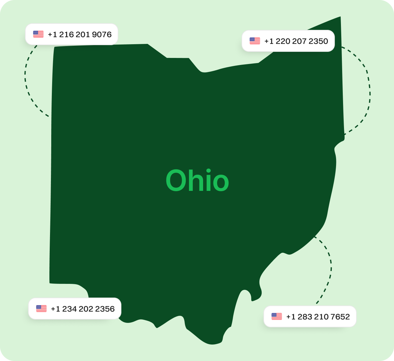 Get an Ohio Virtual Phone Number Today! Obtain an Ohio virtual phone number to cut down on long-distance fees, establish a strong local presence, and gain customer trust without needing a physical office. Stay connected and enhance business communications from anywhere effortlessly. Sign upRequest a Demo Endorsed by top industry leaders Trusted by industry experts for excellence and innovation. What is an Ohio phone number? An Ohio phone number is a digital number that operates over the internet, often using area codes such as 216, 330, 419, 440, 513, 614, 740, and 937. Unlike traditional phone numbers, Ohio virtual numbers are not tied to a specific physical location or device, providing businesses and individuals with greater flexibility and accessibility. With an Ohio phone number, users can make and receive calls from anywhere using an internet connection. These numbers function just like regular phone numbers but without reliance on physical phone lines, making them cost-effective and efficient for business or personal use. An example of an Ohio phone number would be +1 614-234-5678. How does an Ohio Virtual Phone Number Work? An Ohio virtual phone number uses cloud-based technology to route calls over the internet instead of traditional phone lines. When someone dials your Ohio number, the call is converted into digital packets, transmitted over the internet, and received by the intended recipient. The call is then converted back into audio signals for real-time communication. This technology enables businesses to manage their calls effectively while ensuring seamless customer interactions. An Ohio virtual phone number can be accessed through mobile apps, VoIP phones, or desktops, eliminating the need for physical phone systems. How to make the most of Ohio phone numbers? Make & Receive Calls Send & Receive Texts Keep Work & Personal Separate Establish Local Presence Boost Marketing Efforts Make & Receive Calls Use your Ohio phone number for business calls while keeping your personal number private. Dialaxy lets you show your Ohio number on caller ID, ensuring professionalism. Get Started Send & Receive Texts Leverage text messaging to connect with customers. Use your Ohio number to send updates, promotions, and reminders, offering a convenient way to stay in touch. Get Started Keep Work & Personal Separate Dialaxy helps you maintain privacy by separating business and personal communications. Manage calls and messages for work without interruptions to your personal life. Get Started Establish Local Presence Build trust with a local Ohio number, even if your business operates remotely. A recognizable area code helps you connect with customers more effectively. Get Started Boost Marketing Efforts Improve your campaigns by using your Ohio number for outreach. Localized numbers increase customer engagement and response rates for promotions and offers. Get Started Specific area codes for Ohio Area Code Area Served 216 Cleveland and surrounding areas 220 Central and southeastern Ohio 234 Akron, Canton, and Youngstown 283 Assigned but not in use 326 Central Ohio 330 Akron, Canton, and Youngstown 380 Columbus and central Ohio 419 Toledo and Northwest Ohio 436 Assigned but not in use 440 Northeast Ohio 513 Cincinnati and Southwest Ohio 567 Toledo and Northwest Ohio 614 Columbus and central Ohio 937 Dayton and southwest Ohio Why choose Dialaxy for an Ohio virtual phone number? Customizable Plans for Flexibility Dialaxy offers a variety of pricing plans tailored to your needs, allowing you to choose features and services that best suit your personal or business requirements without overpaying. Quick Setup with Zero Hassle Setting up an Ohio virtual phone number with Dialaxy is simple and requires no additional hardware. Enjoy a seamless setup process and start making calls within minutes. Scalable Solutions for Growth As your business expands, Dialaxy grows with you. You can easily scale your services by adding multiple Ohio numbers, ensuring smooth communication with your increasing customer base. Round-the-Clock Support Dialaxy provides 24/7 customer support to resolve any issues or answer questions promptly, keeping your business communication efficient and stress-free. Enhanced Call Management Features Leverage advanced features like call forwarding, voicemail-to-email, and analytics to manage calls more effectively and deliver exceptional customer service. Cost-Effective Pricing With Dialaxy, you get premium services at affordable prices. Whether you're a small business or a large enterprise, you can enjoy professional telephony solutions without exceeding your budget. How to buy a Ohio number for your business? Step 1 Create an Account Sign up on Dialaxy by visiting their website and completing the simple registration process. Step 2 Navigate to the "Add New Number" Section Go to your account dashboard, find the "Add New Number" option, and select it. Step 3 Select USA and Search for Your Preferred Area Codes From the country list, choose "USA," then search area code according to your phone number need. Step 4 Pick Your Ohio Number Browse through the list of available Ohio numbers, select the one you want, and add it to your cart. Step 5 Make Payment and Verify Details Complete the payment process and submit any required documentation to verify your account. Step 6 Activate and Start Using Your Number Once activated, your Ohio virtual phone number is ready to use to make and receive calls. Explore More States Illinois Indiana Kansas Iowa Michigan Minnesota Missouri Nebraska North Dakota South Dakota Wisconsin View all Frequently Asked Questions What is an Ohio virtual phone number?An Ohio virtual phone number is a cloud-based number with area codes like 216, 220, 234, 283, 326, 330, 380, 419, 436, 440, 513, 567, 614, and 937, allowing users to make and receive calls via the Internet instead of traditional phone lines. Can I choose my preferred area code for an Ohio number?Yes, most prov