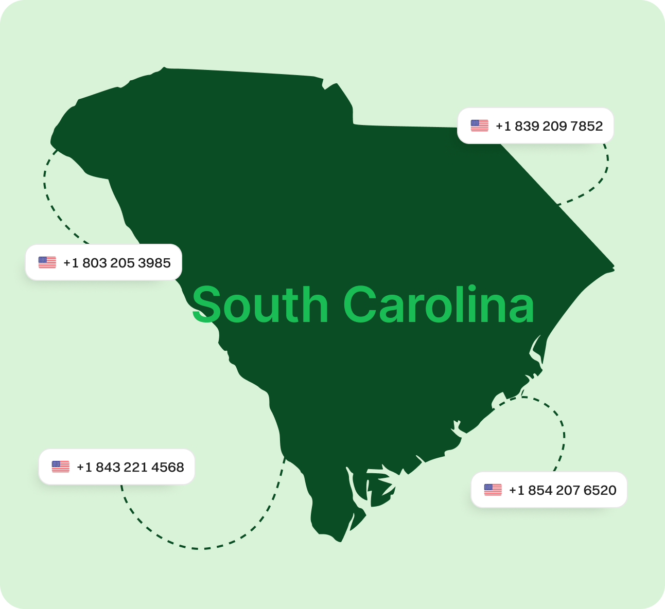 Get a South Carolina Virtual Phone Number Today! Establish a trusted local presence in South Carolina with a VoIP number. Whether you’re a small startup, a growing business, or a remote team, a South Carolina virtual number helps you connect with customers more effectively, cut communication costs, and stay available wherever you are—without needing a physical office in the state. Sign upRequest a Demo Endorsed by top industry leaders Trusted by industry experts for excellence and innovation. What is a South Carolina phone number? A South Carolina phone number is a ten-digit telephone number assigned to residents and businesses within the state of South Carolina, USA. It typically includes one of the state’s area codes, such as 803, 843, or 864, followed by a seven-digit local number. These area codes correspond to different regions: 803 serves central South Carolina, 843 covers the coastal region, and 864 is used in the upstate area. South Carolina phone numbers are used for landlines and mobile phones and follow the standard North American Numbering Plan format: (XXX) XXX-XXXX. They help identify the caller’s geographic location within the state. How does a South Carolina virtual phone number work? A South Carolina virtual phone number works by routing calls through the internet rather than traditional phone lines. It appears to be based in South Carolina, using local area codes like 803, 843, or 864, but it can be used from anywhere in the world. Businesses and individuals use virtual numbers to establish a local presence in South Carolina without being physically located there. Calls made to the virtual number are forwarded to a chosen device, such as a mobile phone, landline, or computer. These numbers often come with features like voicemail, call recording, and automated menus to enhance communication. Why use a South Carolina virtual phone number? Make & Receive Calls Send & Receive Texts Keep Work & Personal Separate Establish Local Presence Boost Marketing Efforts Make & Receive Calls Connect with customers across South Carolina—from Charleston to Greenville—without needing a physical location. Get Started Send & Receive Texts Stay in touch via text, a convenient option for many customers in both urban and rural SC areas. Get Started Keep Work & Personal Separate Separate business from personal life while managing calls professionally in the Palmetto State. Get Started Establish Local Presence Build trust with a local SC number, ideal for businesses targeting cities like Columbia, Myrtle Beach, or Spartanburg. Get Started Boost Marketing Efforts Increase engagement by using a recognizable South Carolina number in your local ad campaigns. Get Started South Carolina area codes and their reach Area Code Area Served 803 Central South Carolina: Columbia, Sumter, Rock Hill 839 Overlay for 803: Shares coverage with Columbia and central SC areas 843 Coastal South Carolina: Charleston, Myrtle Beach, Hilton Head Island 854 Overlay for 843: Covers the same coastal region, including Charleston and beyond 864 Upstate South Carolina: Greenville, Spartanburg, Anderson Why choose Dialaxy for your South Carolina phone number? Flexible Plans for Every Need Pick the plan that fits your scale—whether you’re running a solo business or coordinating a full customer service team. Quick, No-Hardware Setup Get started in minutes with no technical setup or hardware purchases required. All you need is a device and internet access. Scalable for Growth Need to add more numbers? Dialaxy makes it easy to scale up. Assign unique numbers to departments, teams, or locations. Round-the-Clock Customer Service Our support team is available 24/7 via phone, email, or chat to answer questions or resolve any issues quickly. Smart Tools That Work for You Access features like call forwarding, auto-attendants, voicemail-to-email, custom greetings, and analytics dashboards—all included. Affordable & Transparent Pricing No hidden fees. Just simple, straightforward pricing that scales with your business without draining your budget. How to set up a South Carolina virtual phone number? Step 1 Create an Account Sign up on the virtual phone number provider’s website. Use your email address or other required credentials to get started. Step 2 Navigate to the "Add New Number" Section Go to your account dashboard, find the “Add New Number” option, and select it. Step 3 Select USA and Choose South Carolina Select USA as your country and then choose South Carolina area code from the list of numbers. Step 4 Pick Your South Carolina Number Browse the list of available South Carolina numbers and pick the one that fits your needs. Step 5 Make Payment and Verify Details Proceed with the payment for your selected number. Double-check your account info and confirm everything is correct. Step 6 Activate and Start Using Your Number Once the number is activated, you can start using your South Carolina virtual number right away for calls, texts, or forwarding features. Explore more states Alabama Arkansas Delaware Florida Georgia Kentucky Louisiana Maryland Mississippi North Carolina Oklahoma Tennessee Texas Virginia West Virginia Washington DC View all Frequently Asked Questions Can I choose the specific city I want my number to represent?Yes! You can select numbers tied to Columbia (803), Charleston (843), Greenville (864), and other regional hubs. Can I send texts using a South Carolina virtual number?Absolutely. Most VoIP plans include SMS and MMS support for full communication functionality. Is my South Carolina VoIP number mobile-friendly?Yes. You can use it on your smartphone through Dialaxy’s mobile app, keeping business calls separate from your personal line. Can I forward calls to another number?Yes, call forwarding is a standard feature, allowing you to redirect calls to any number you choose. Can I keep my number if I leave Dialaxy?In most cases, yes. Number portability means you can transfer your number to